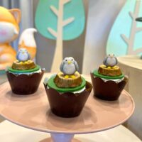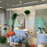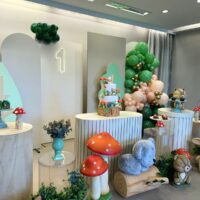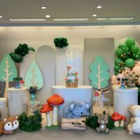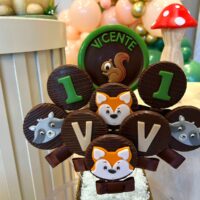 Cada detalhe é pensado para encantar, desde as árvores e cogumelos até os docinhos decorados à mão. Uma proposta charmosa e delicada, ideal para celebrar o primeiro aninho com muito amor e encantamento.