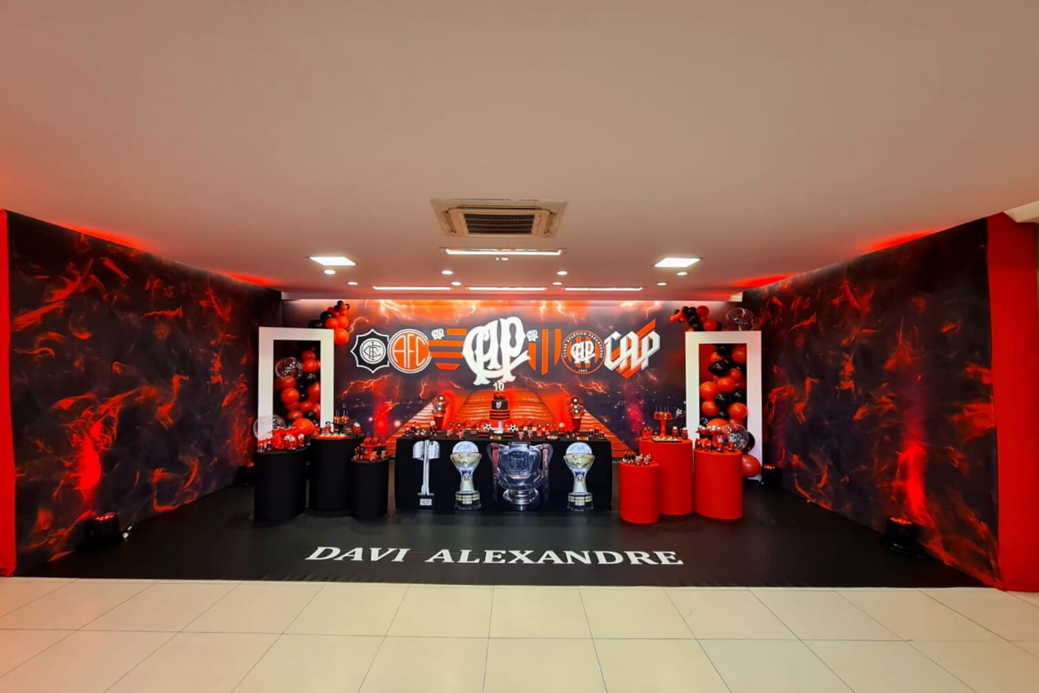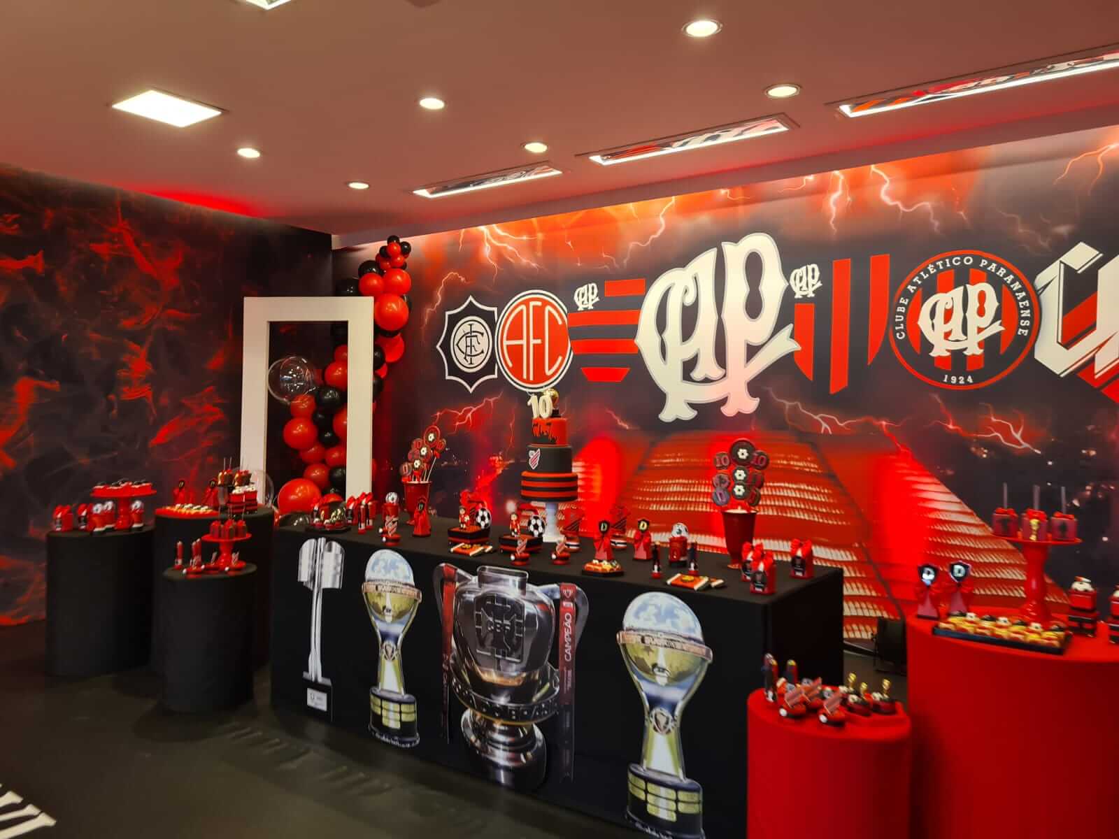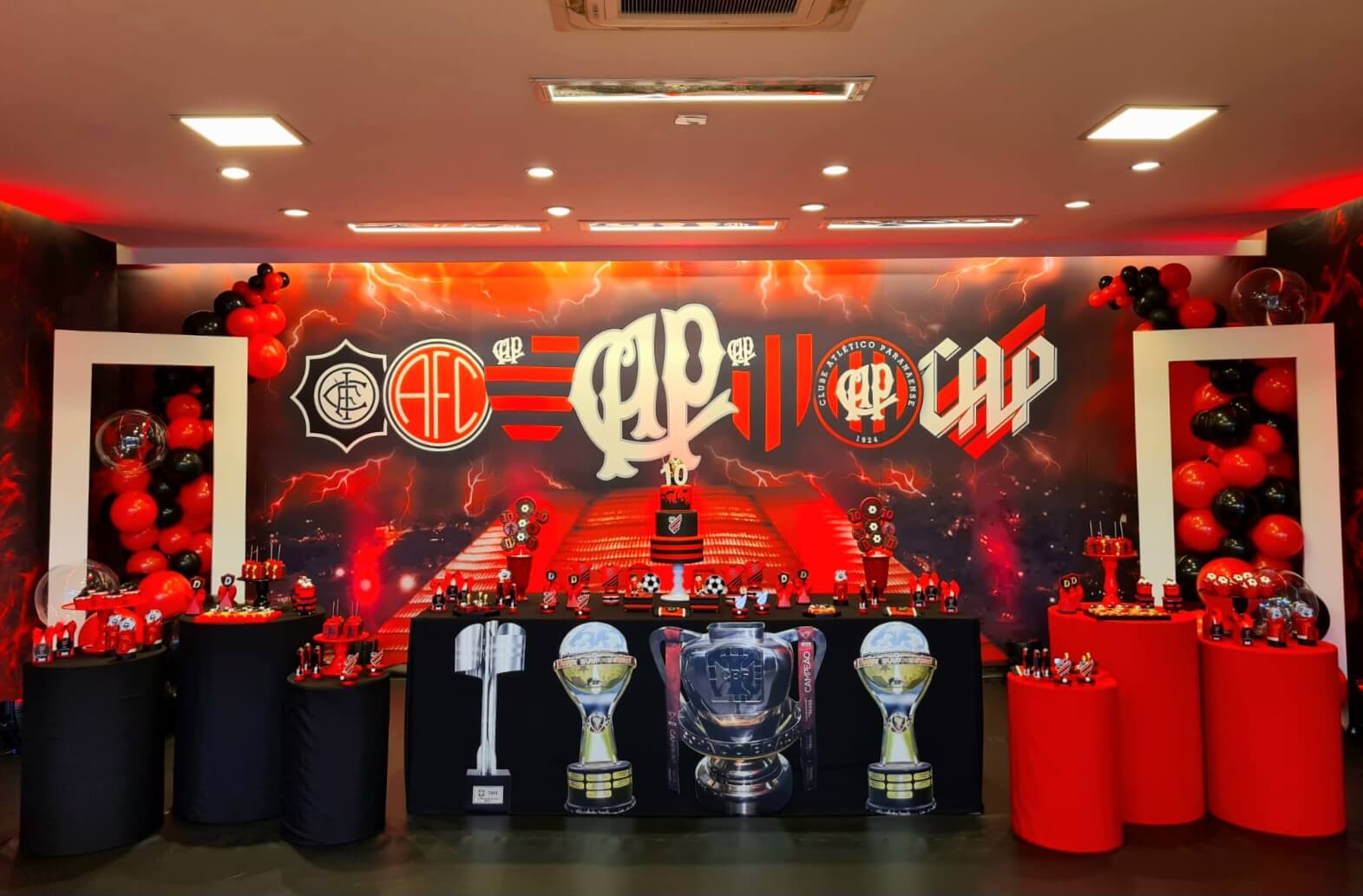 O vermelho e o preto tomam conta da festa com a energia e a paixão do Athletico Paranaense. Nossa equipe de Party Designers cria uma ambientação especial para os torcedores, com escudos, troféus e referências ao Furacão que fazem brilhar os olhos de quem ama futebol.