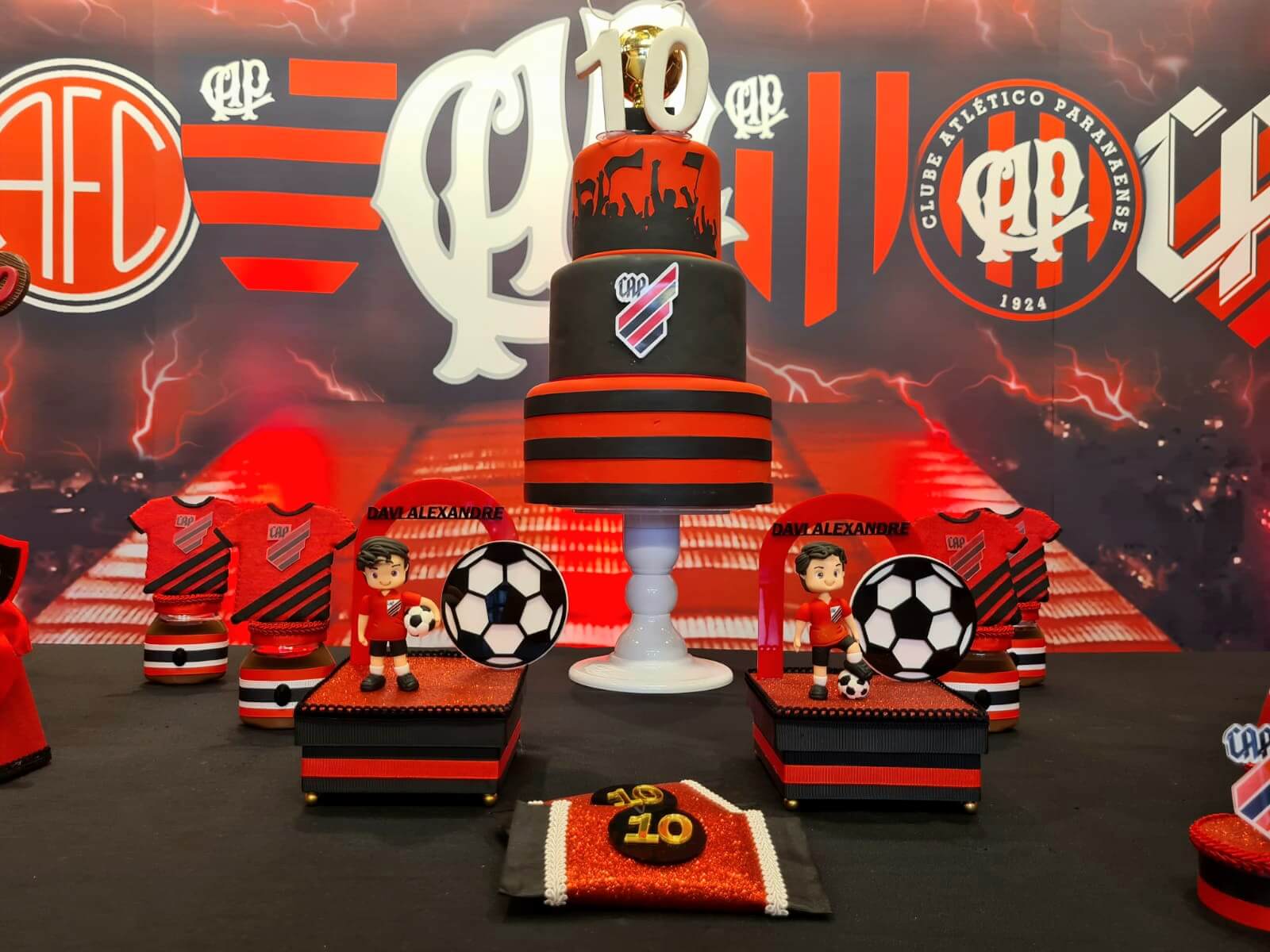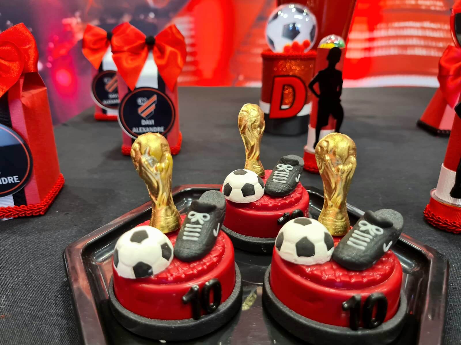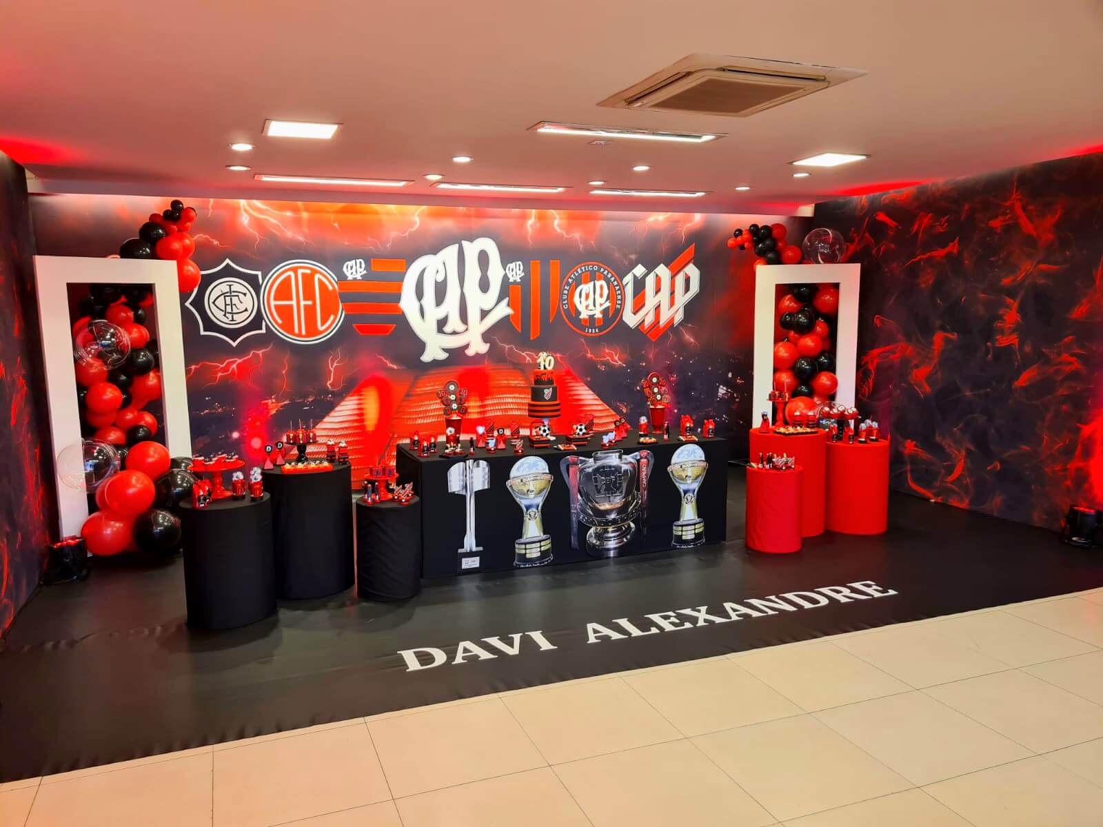 O vermelho e o preto tomam conta da festa com a energia e a paixão do Athletico Paranaense. Nossa equipe de Party Designers cria uma ambientação especial para os torcedores, com escudos, troféus e referências ao Furacão que fazem brilhar os olhos de quem ama futebol.