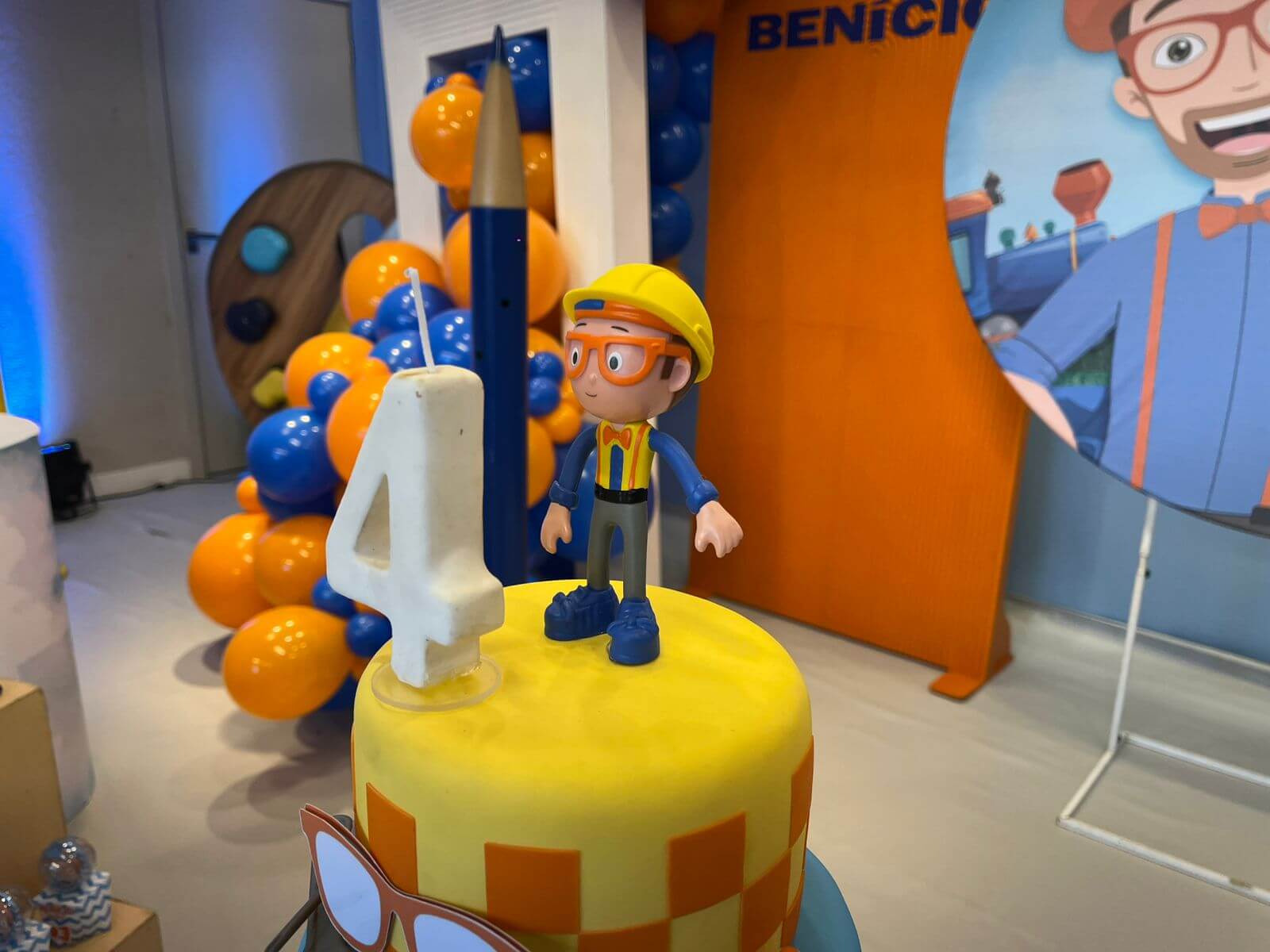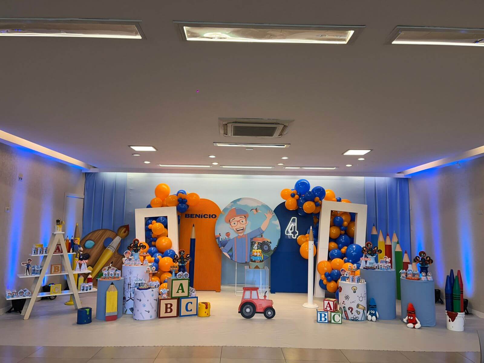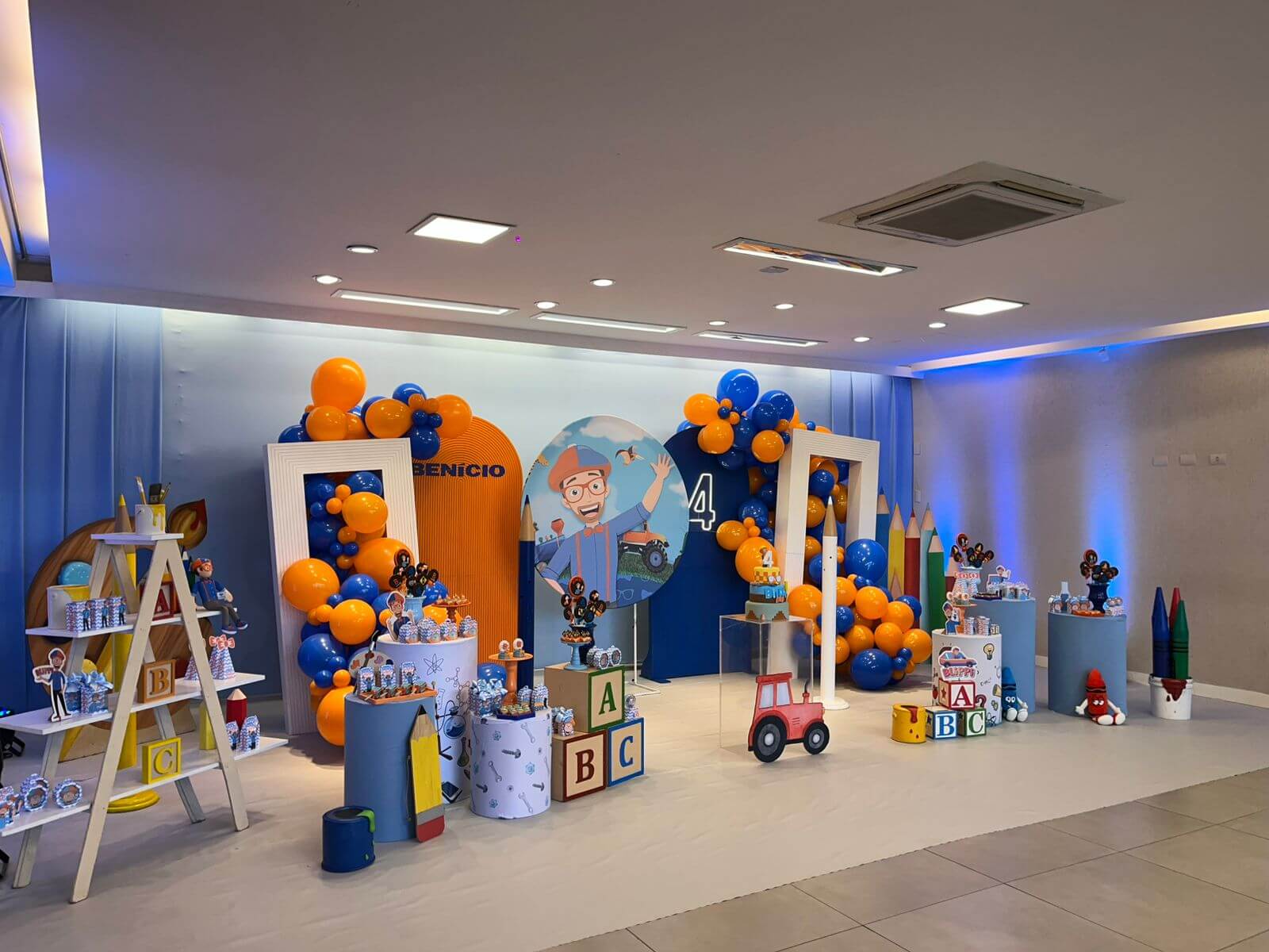 Com o tema Blippi, a diversão é garantida! Inspirada no personagem querido pelas crianças, essa decoração colorida e educativa estimula a curiosidade e o aprendizado por meio de um ambiente cheio de vida. Nossa equipe de Party Designers cria montagens vibrantes, com os tons marcantes de azul e laranja, e elementos que remetem ao universo do Blippi.