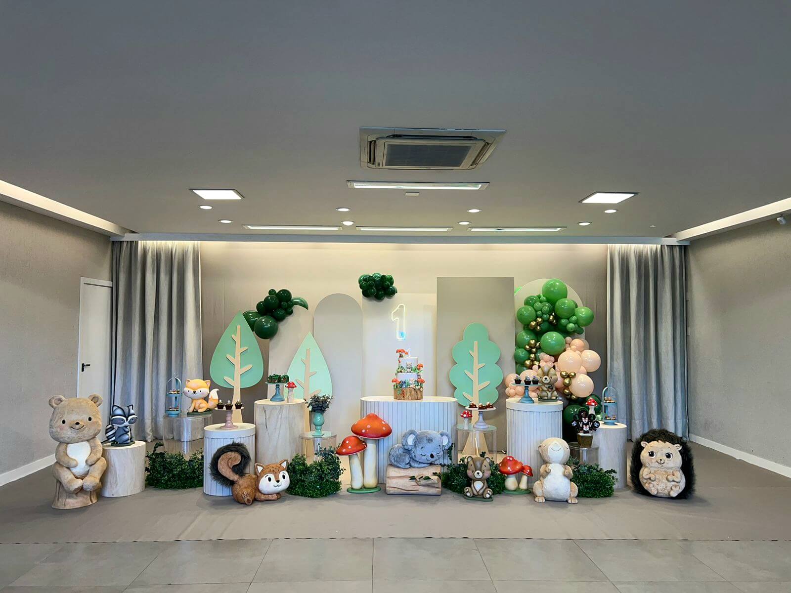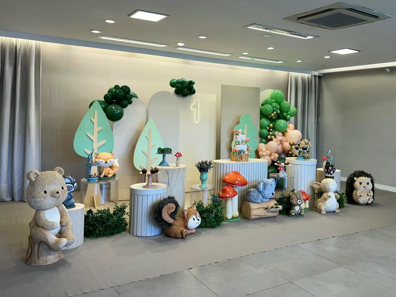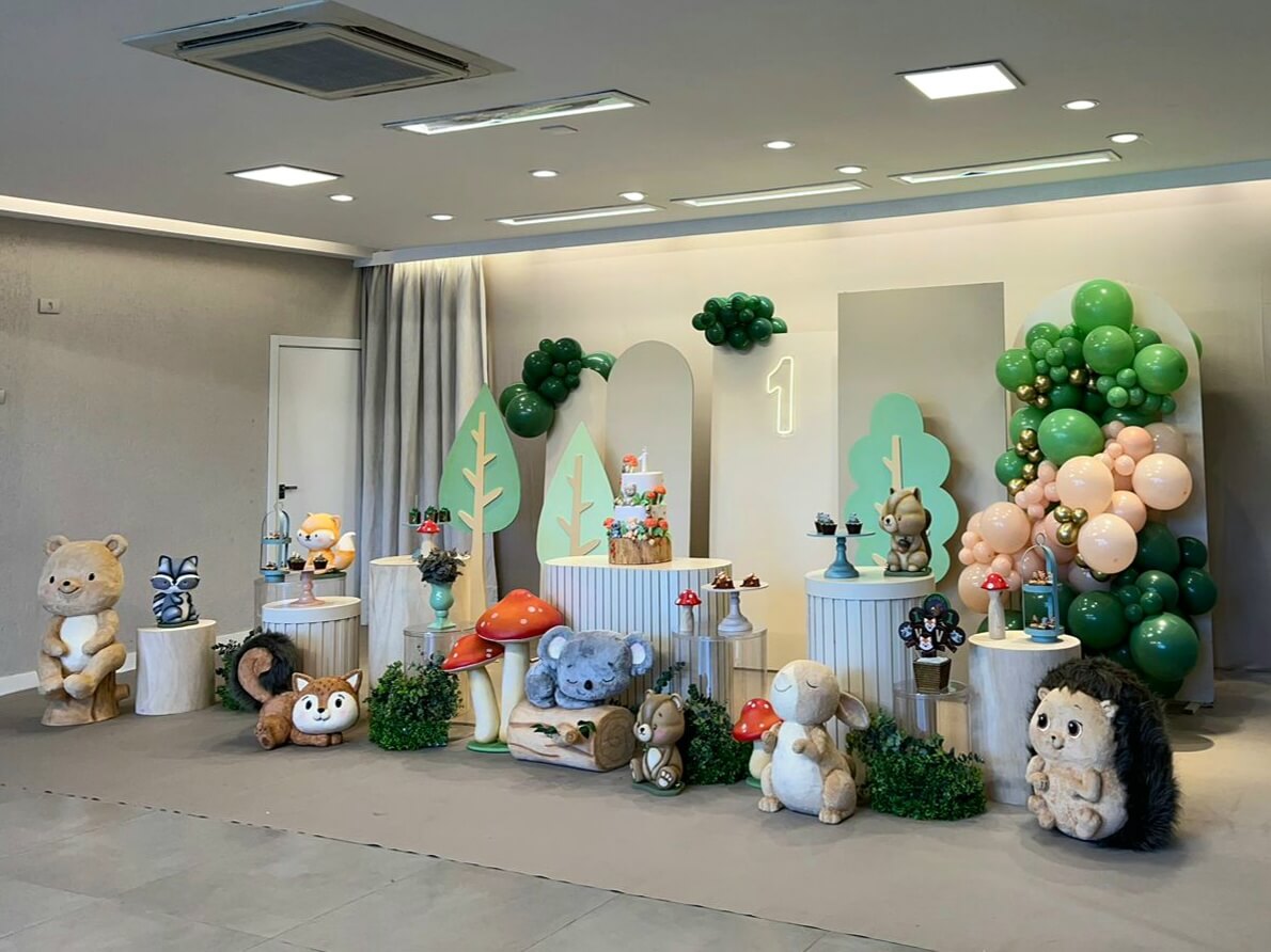 O tema Bosque Baby traz toda a magia da natureza para a festa, com tons suaves, bichinhos encantadores e elementos que remetem a um cenário de conto de fadas. Ursinhos, raposas, coelhinhos e esquilos compõem um ambiente acolhedor e cheio de ternura.