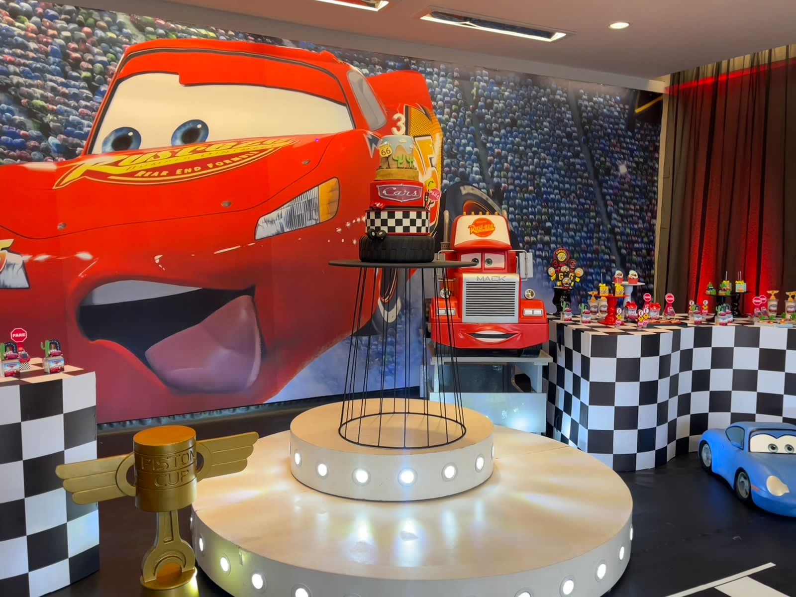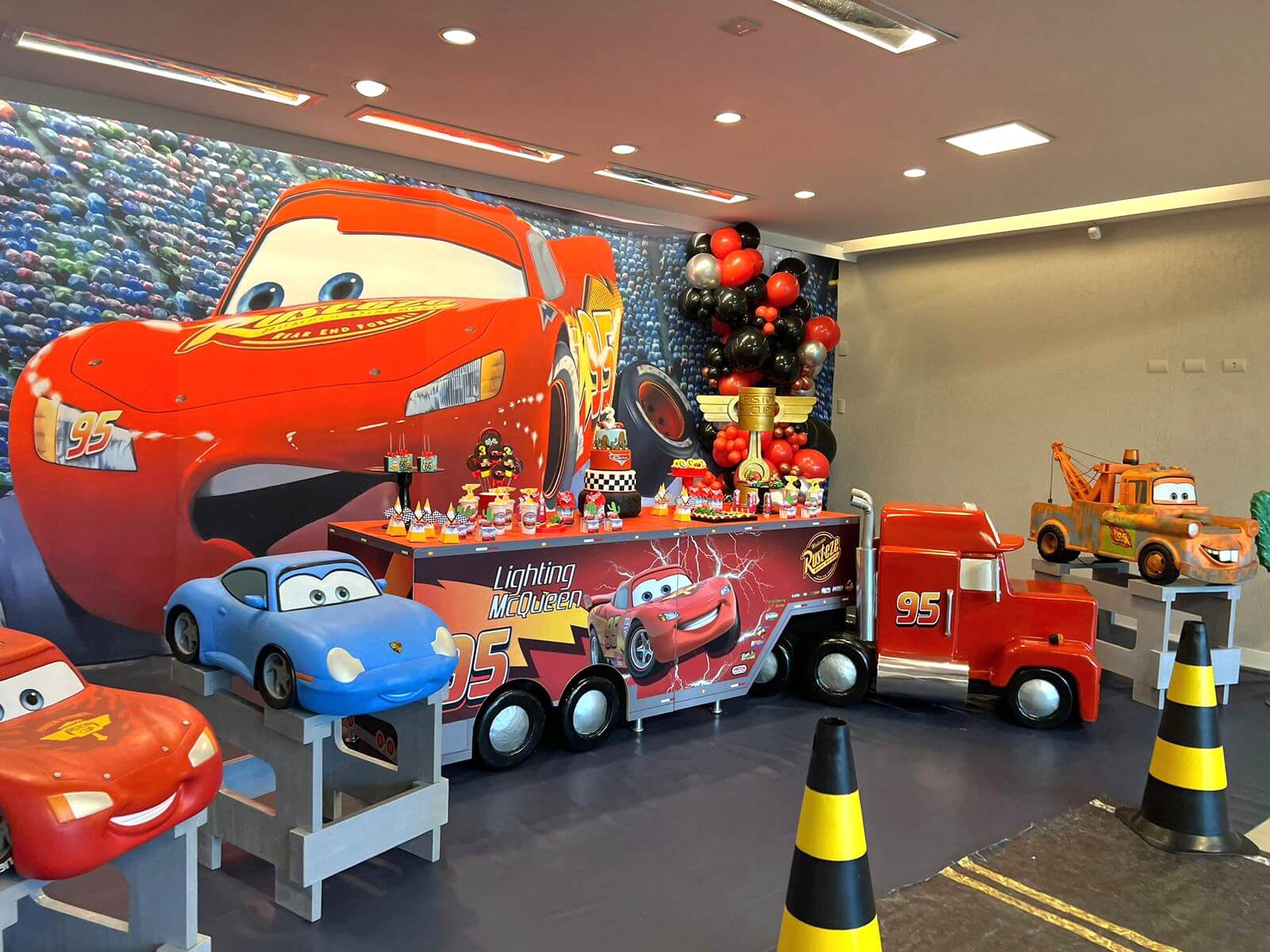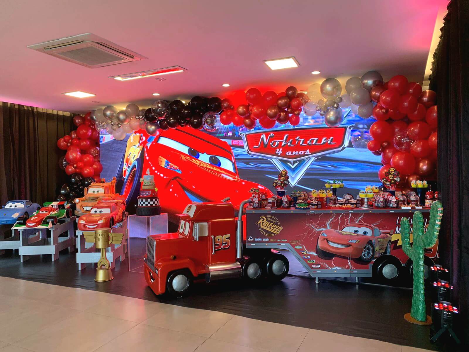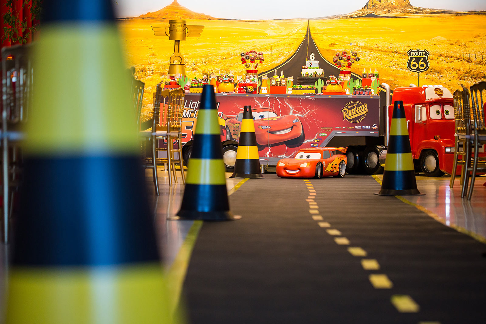 Entre troféus dourados, cones de trânsito e os personagens mais queridos da animação, a festa ganha ritmo e energia do início ao fim. Um tema cheio de movimento, ideal para pequenos apaixonados por motores, aventura e muita adrenalina!