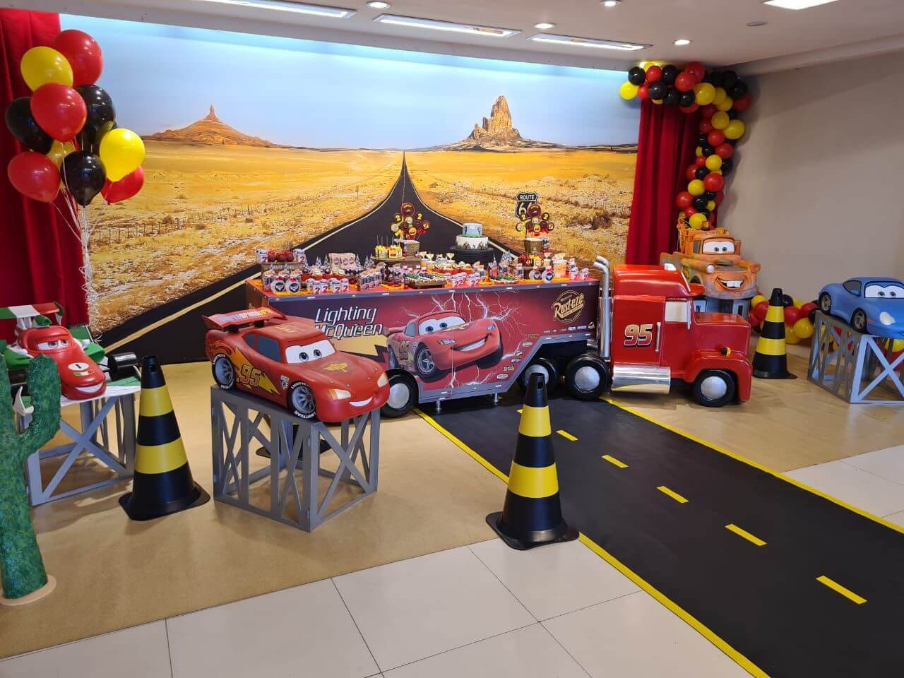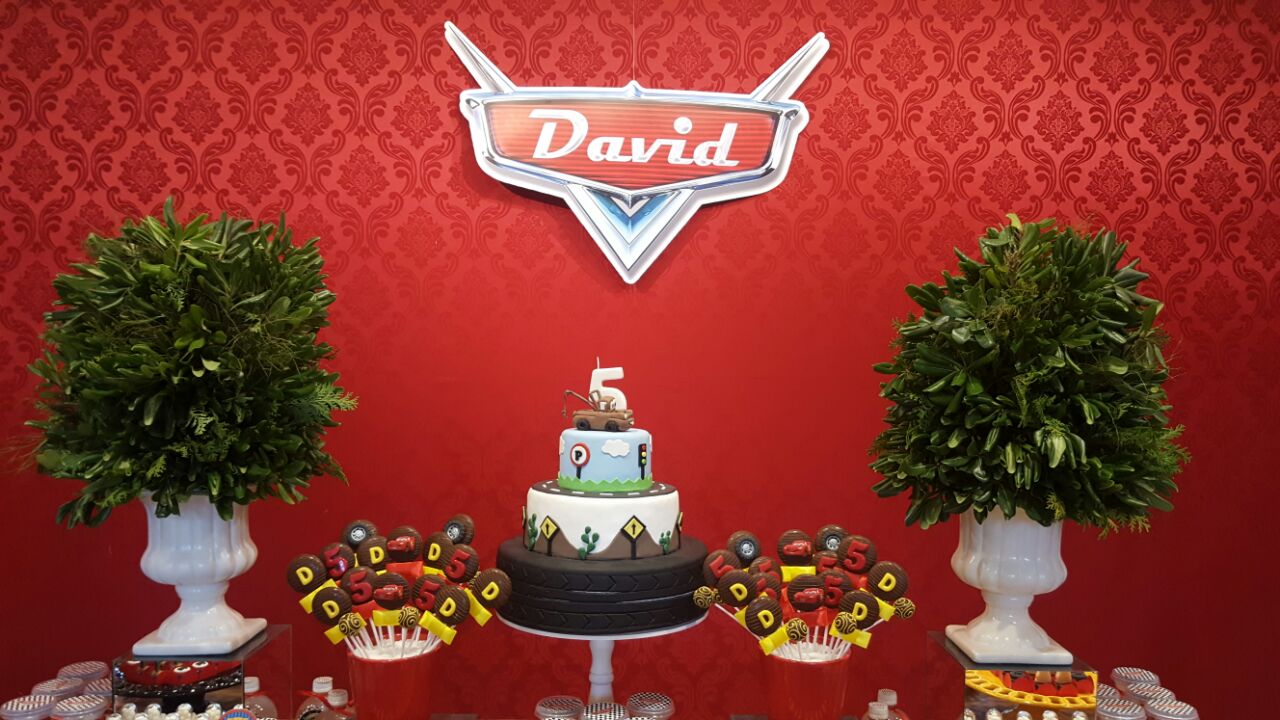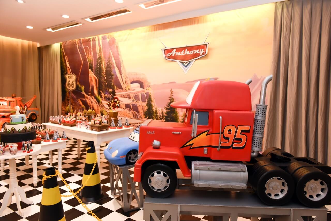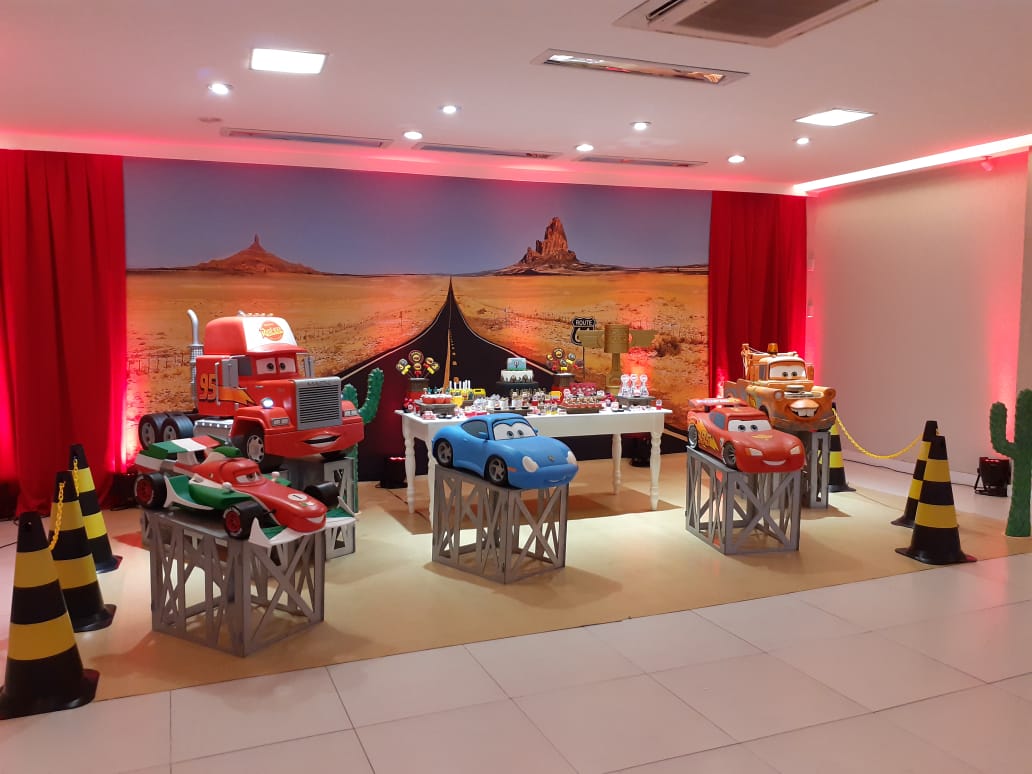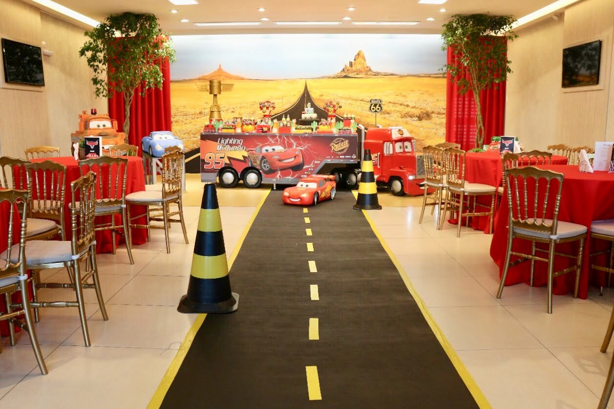 Prepare-se para acelerar com o Relâmpago McQueen e toda a turma de Radiator Springs! O tema Carros é pura emoção, velocidade e diversão, trazendo uma decoração vibrante em tons de vermelho, preto e amarelo, com detalhes que remetem às pistas e ao mundo das corridas.