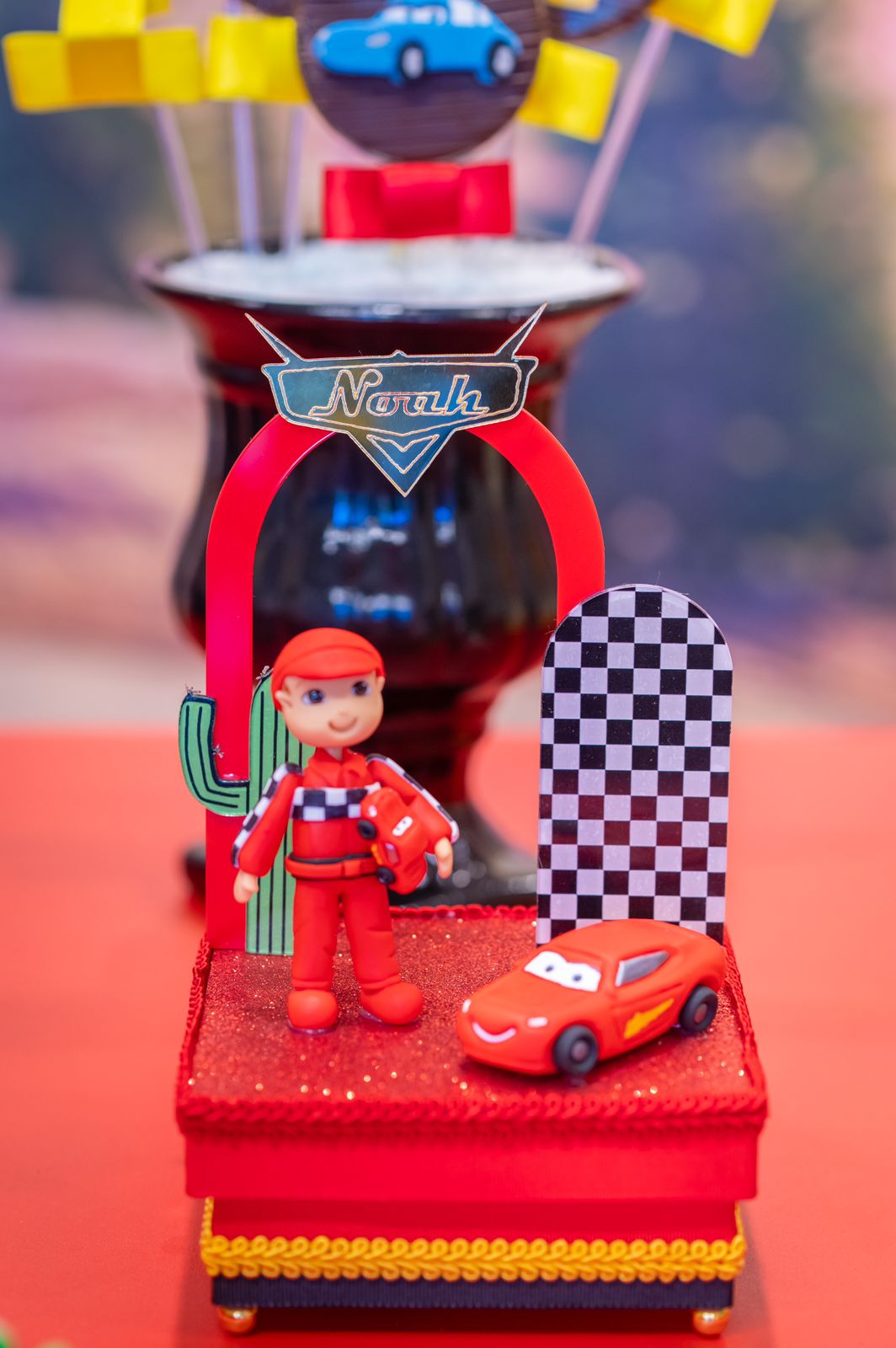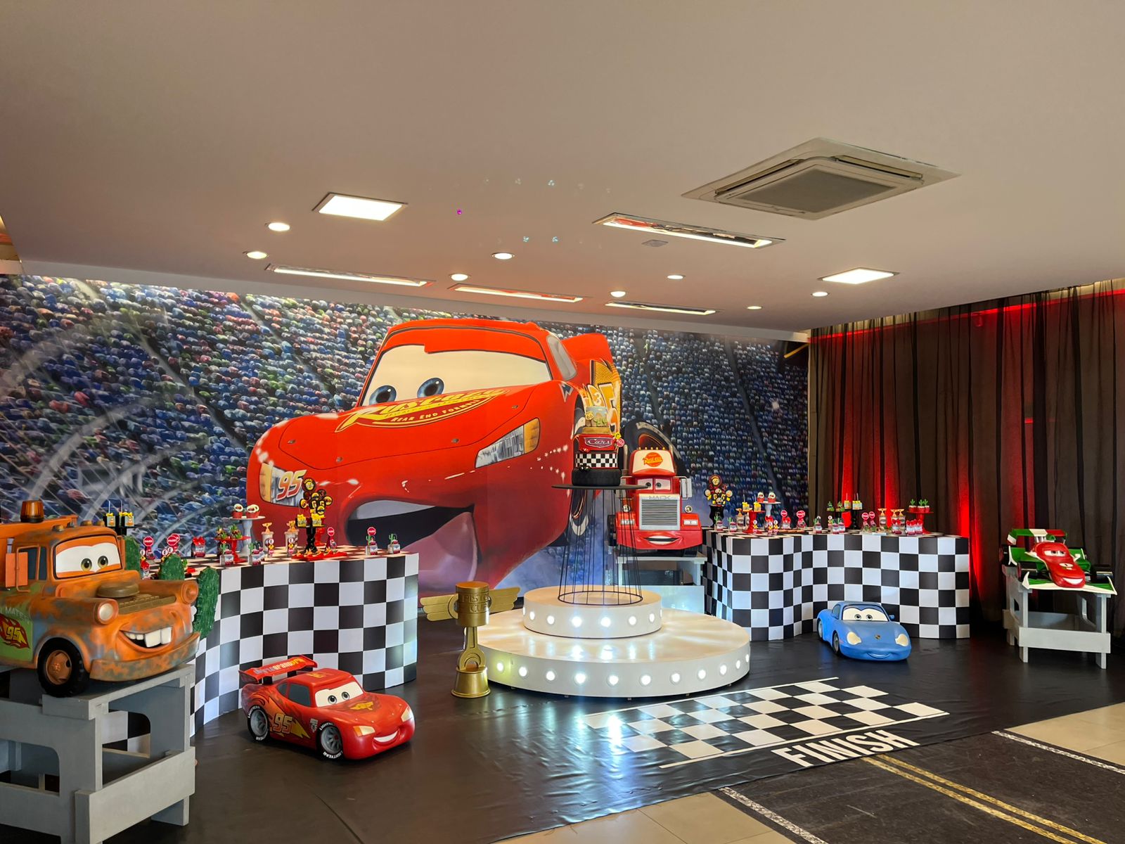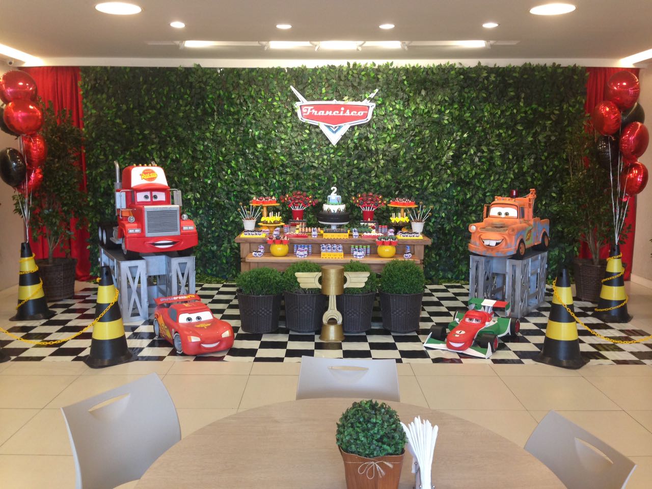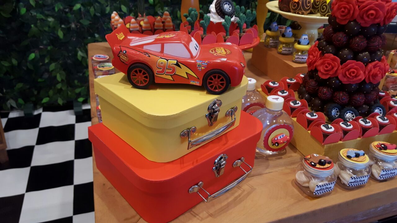Prepare-se para acelerar com o Relâmpago McQueen e toda a turma de Radiator Springs! O tema Carros é pura emoção, velocidade e diversão, trazendo uma decoração vibrante em tons de vermelho, preto e amarelo, com detalhes que remetem às pistas e ao mundo das corridas.