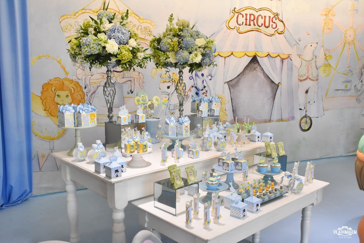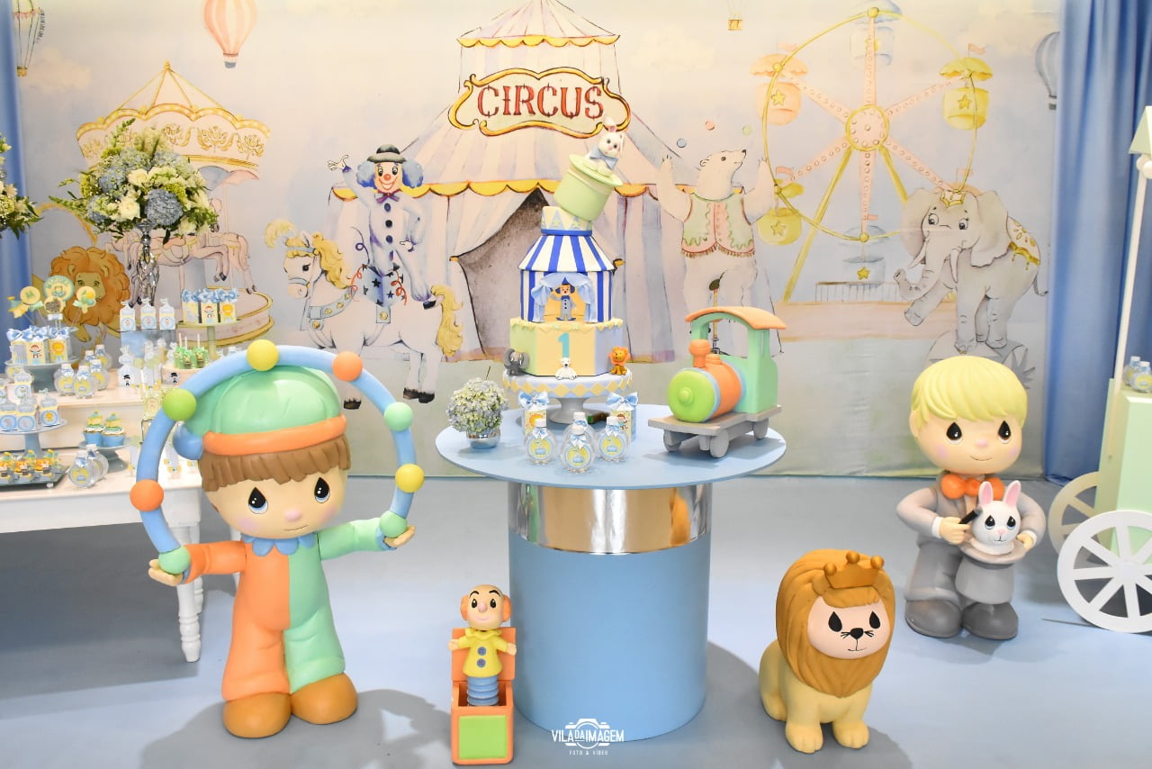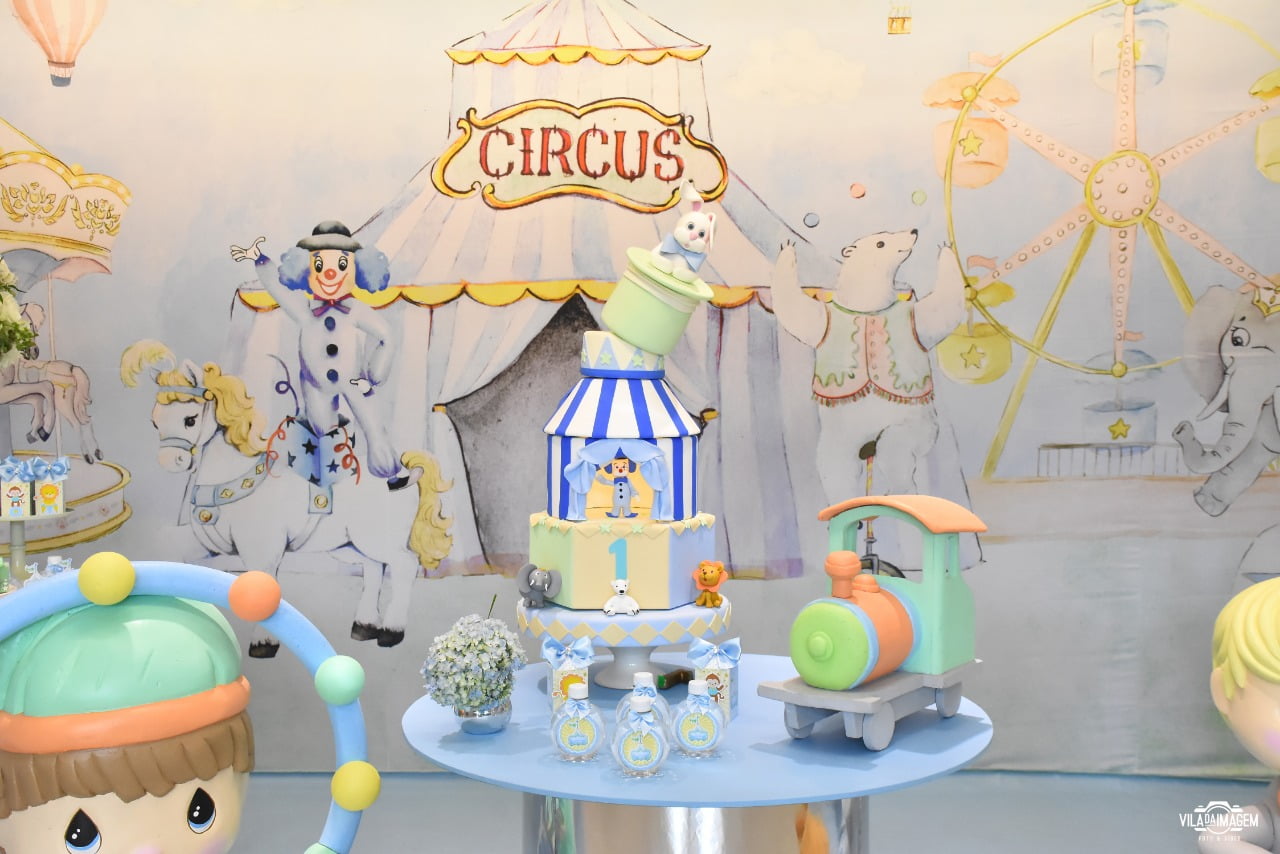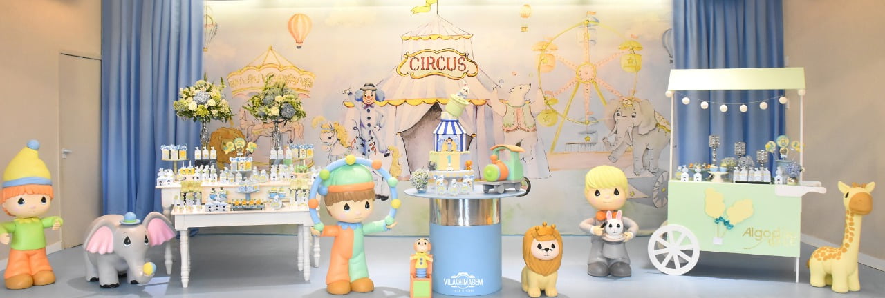 Um espetáculo cheio de encanto e alegria em versão suave e delicada! O tema Circo Candy Colors Menino traz toda a magia do picadeiro em uma paleta moderna e leve, com tons de azul, menta, amarelo e bege.