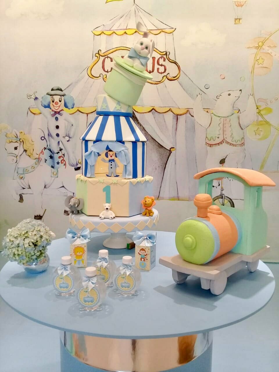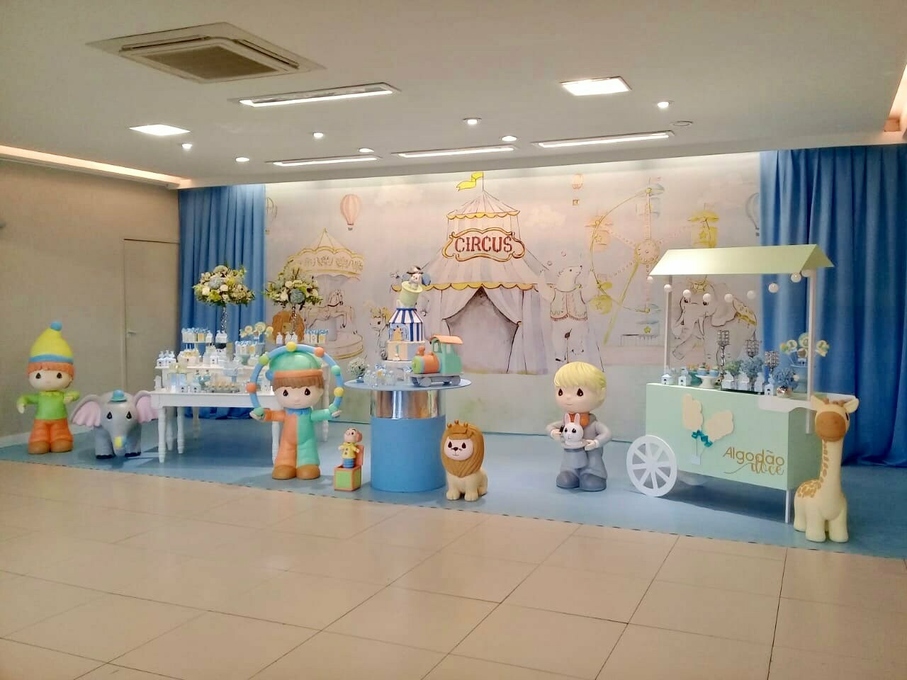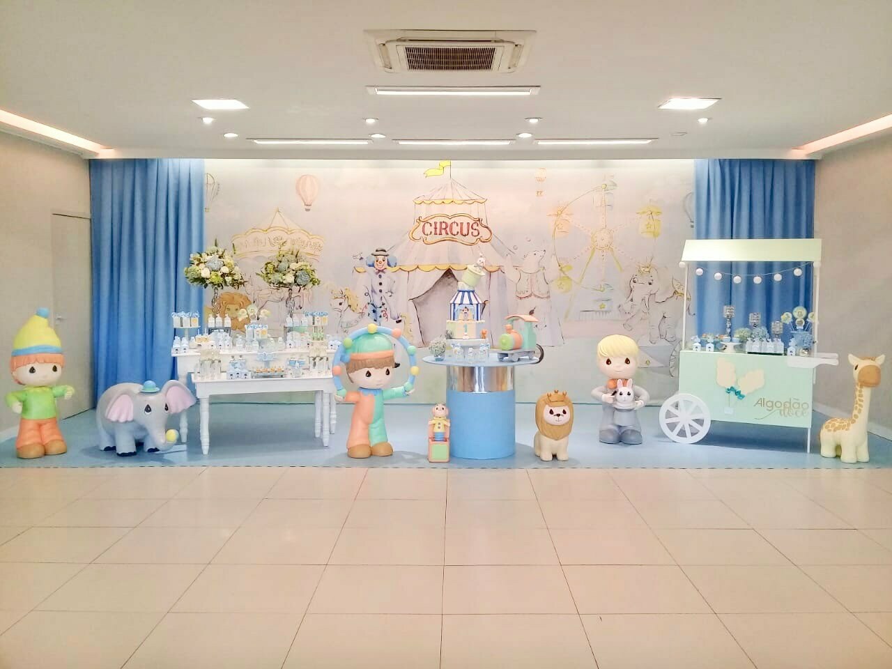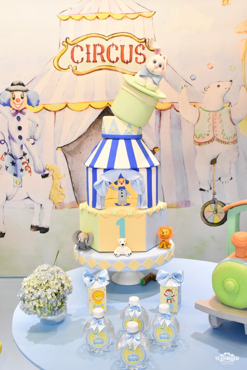 Um espetáculo cheio de encanto e alegria em versão suave e delicada! O tema Circo Candy Colors Menino traz toda a magia do picadeiro em uma paleta moderna e leve, com tons de azul, menta, amarelo e bege.