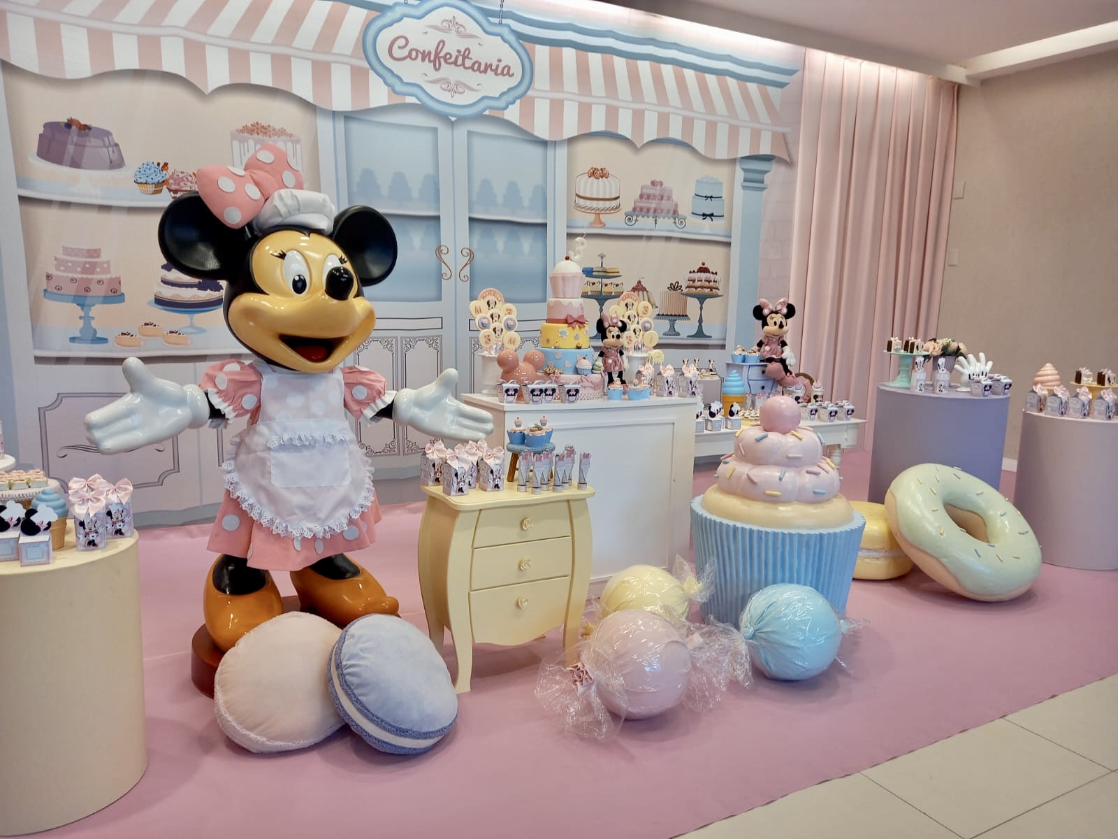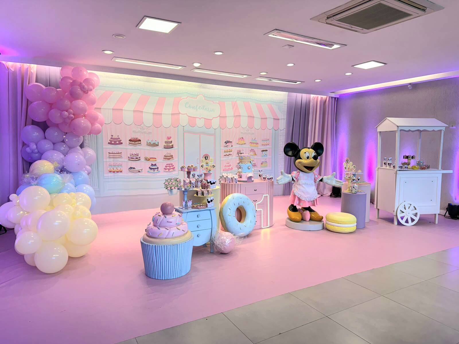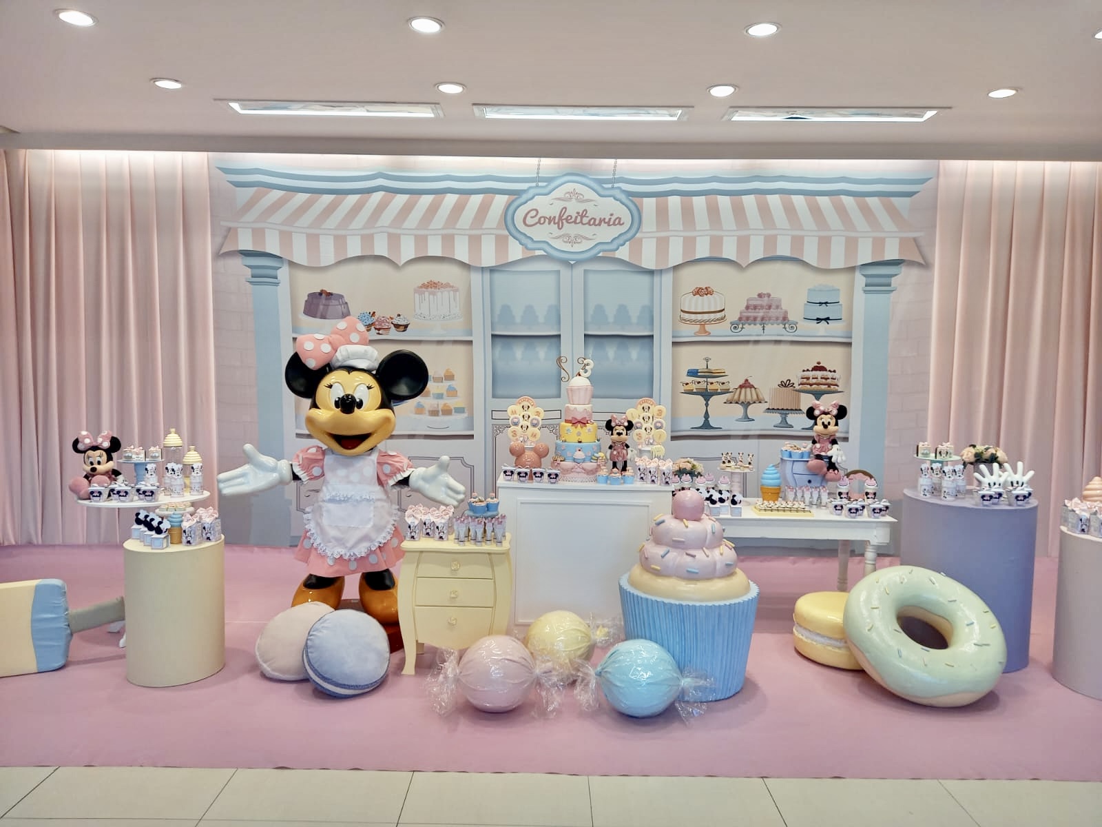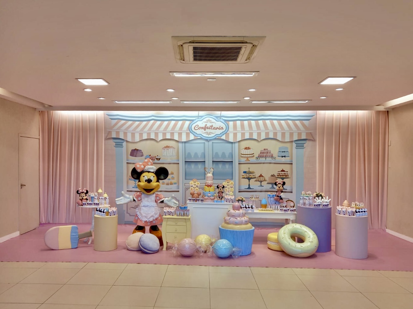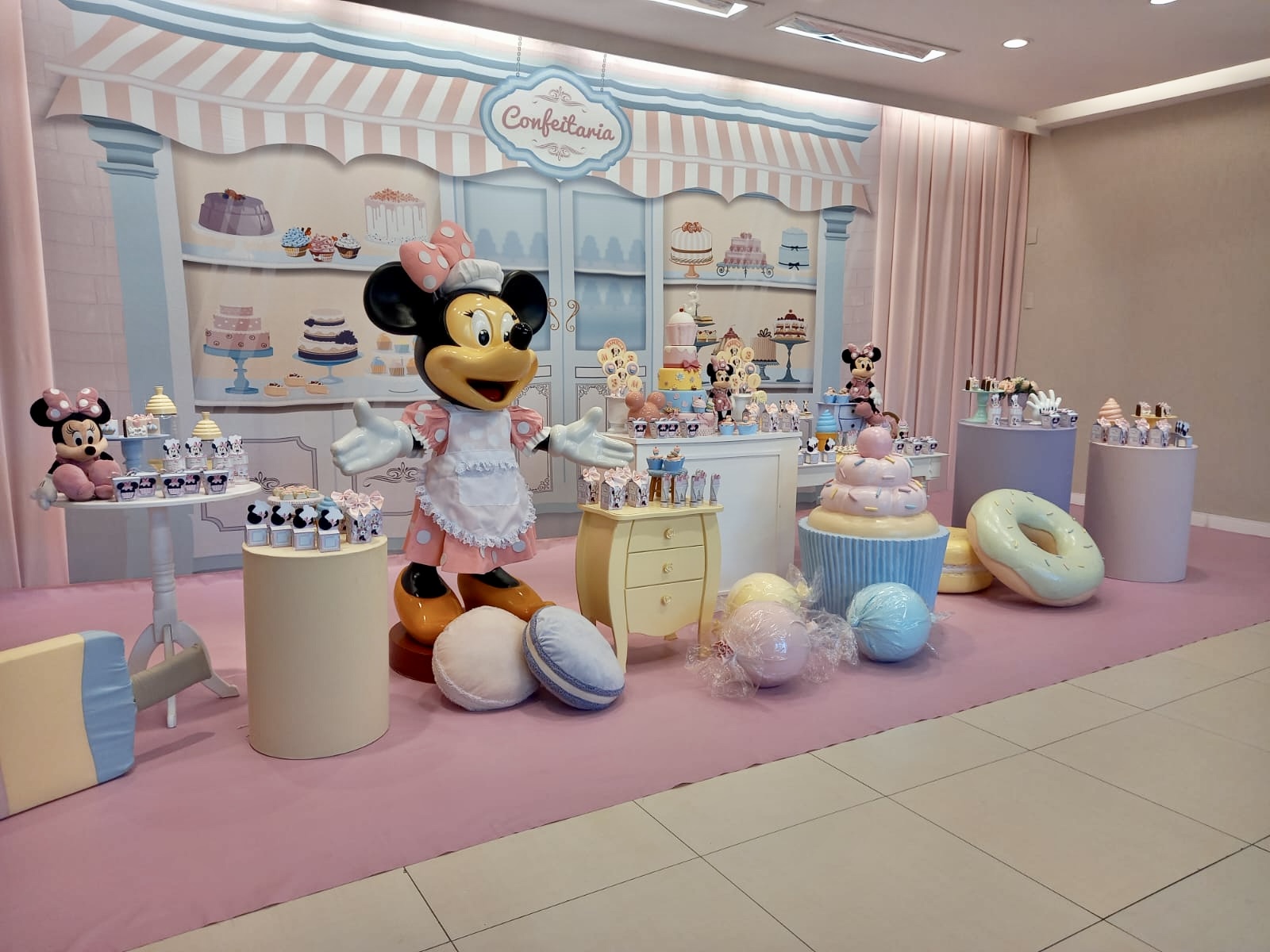 O tema Confeitaria da Minnie é um verdadeiro sonho açucarado, com cores suaves, doces gigantes e a presença encantadora da Minnie vestida de confeiteira. Um cenário repleto de cupcakes, donuts e macarons que transformam o ambiente em uma charmosa padaria cor-de-rosa digna da Disney.