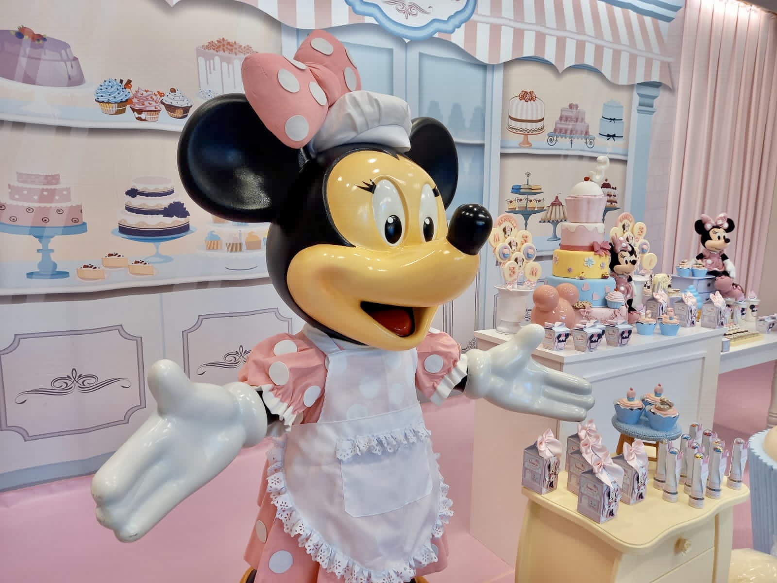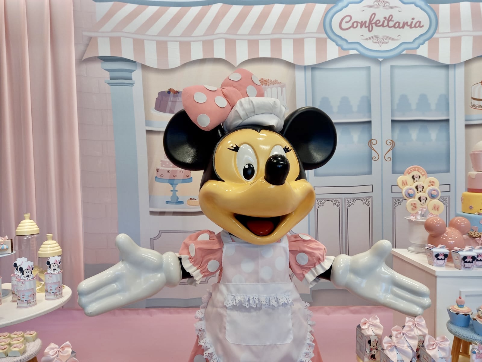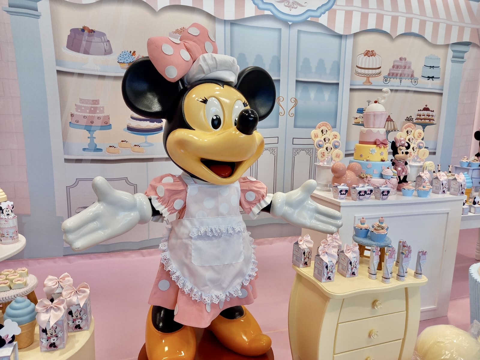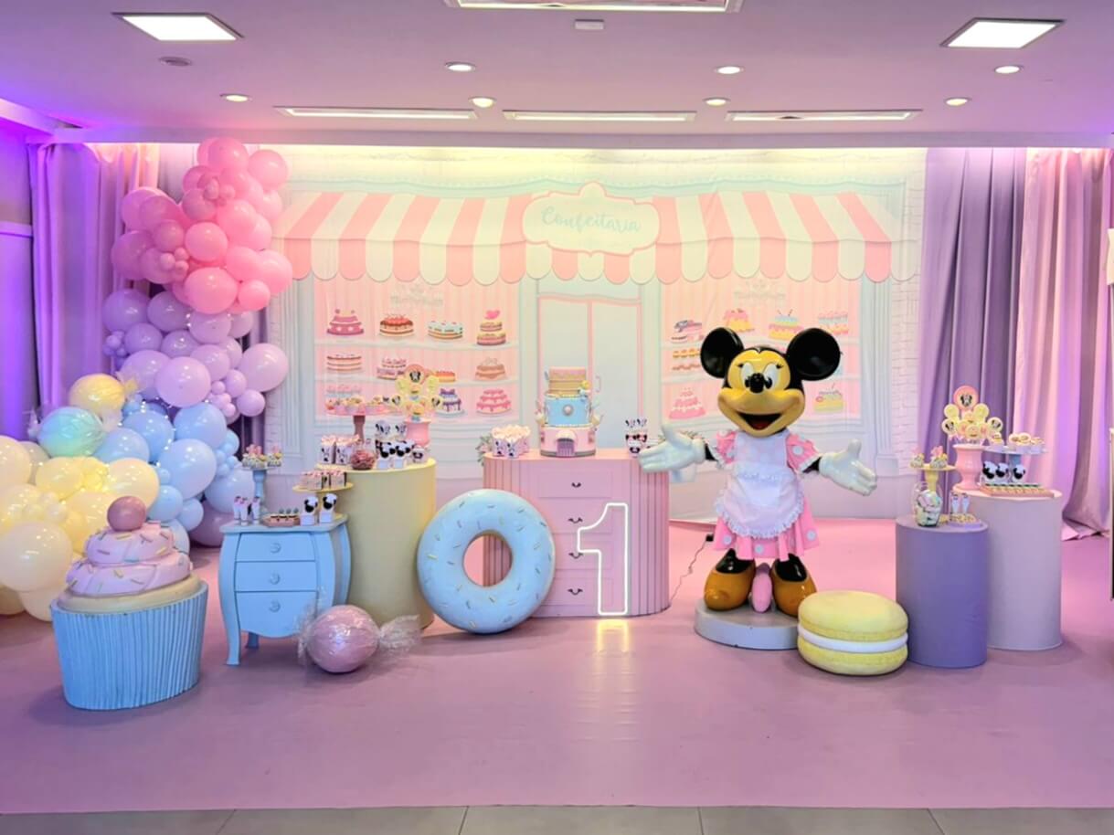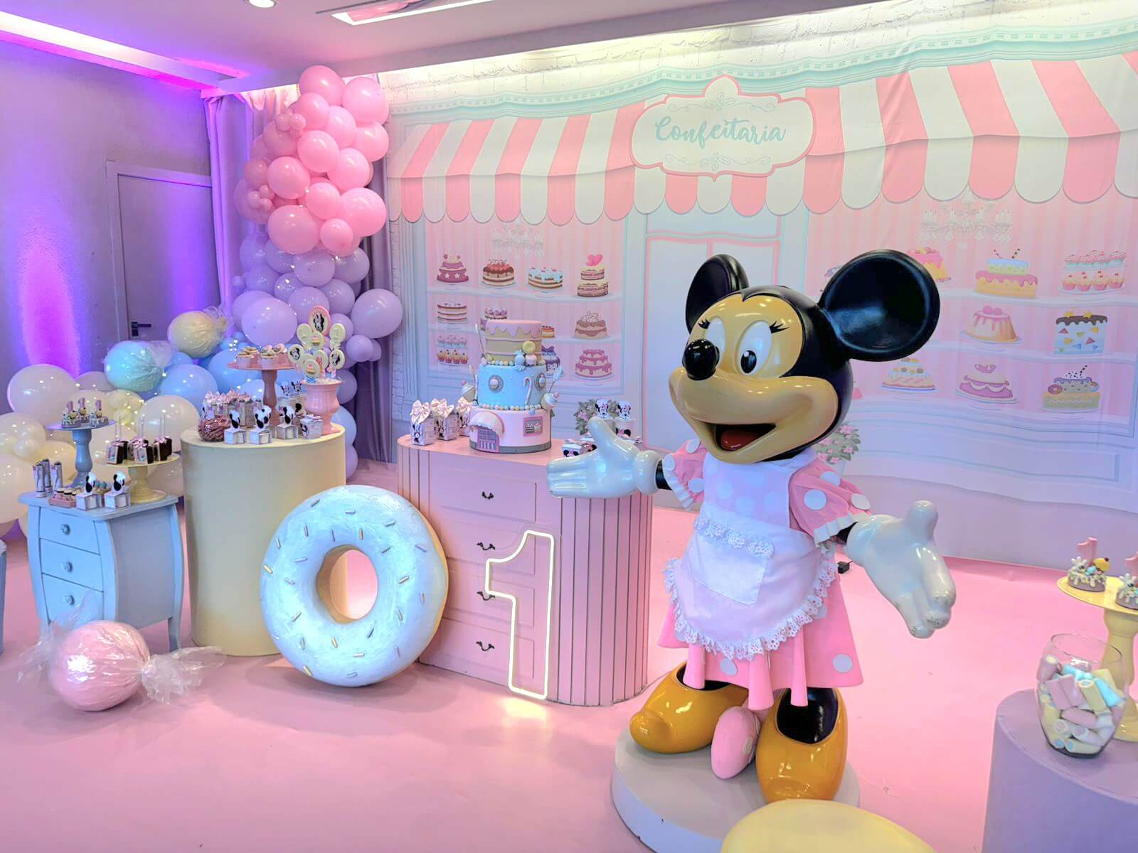 O tema Confeitaria da Minnie é um verdadeiro sonho açucarado, com cores suaves, doces gigantes e a presença encantadora da Minnie vestida de confeiteira. Um cenário repleto de cupcakes, donuts e macarons que transformam o ambiente em uma charmosa padaria cor-de-rosa digna da Disney.