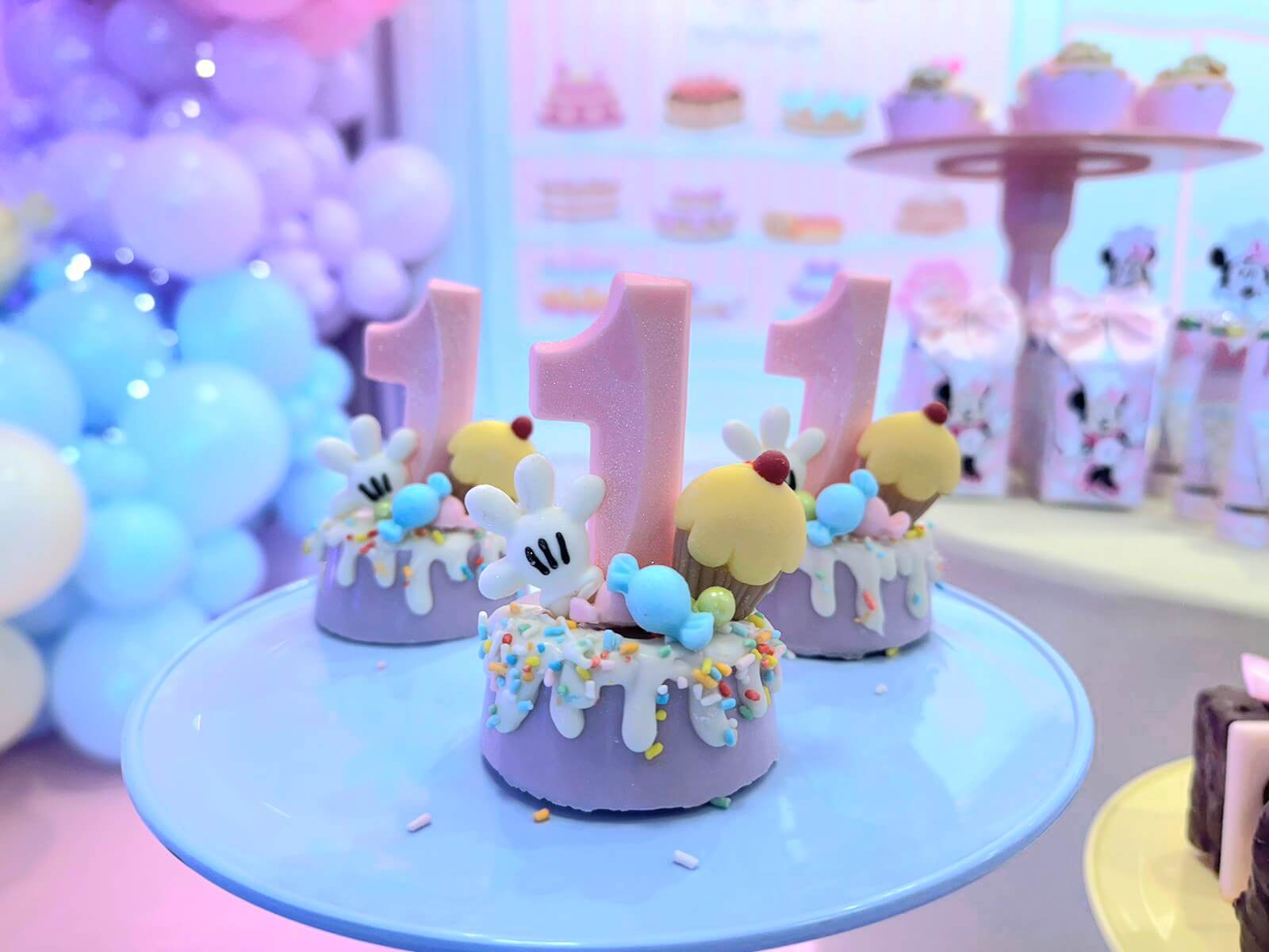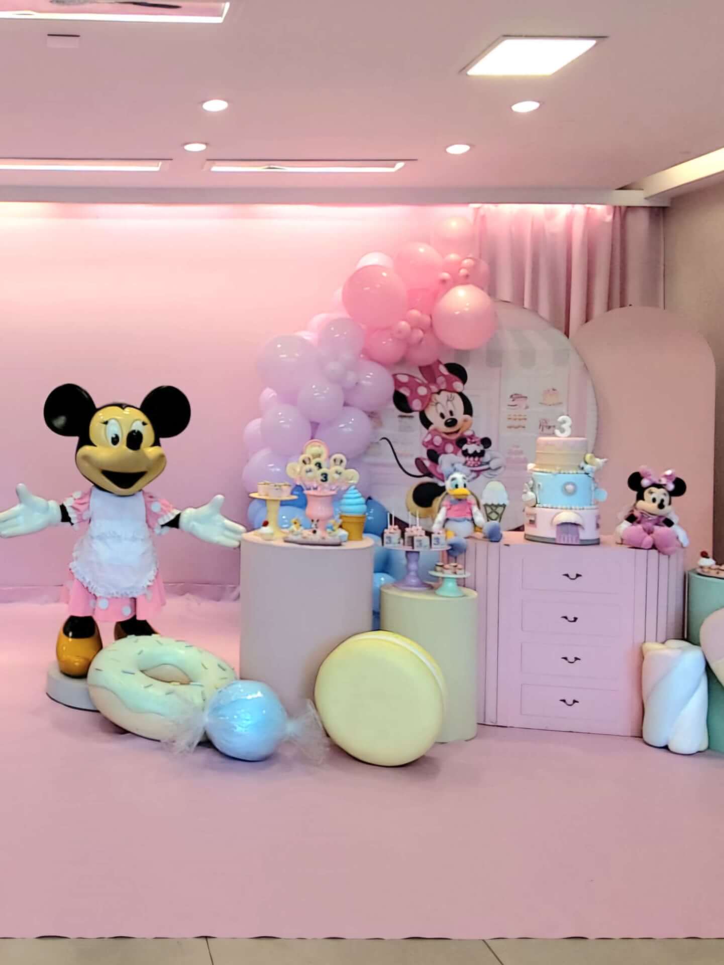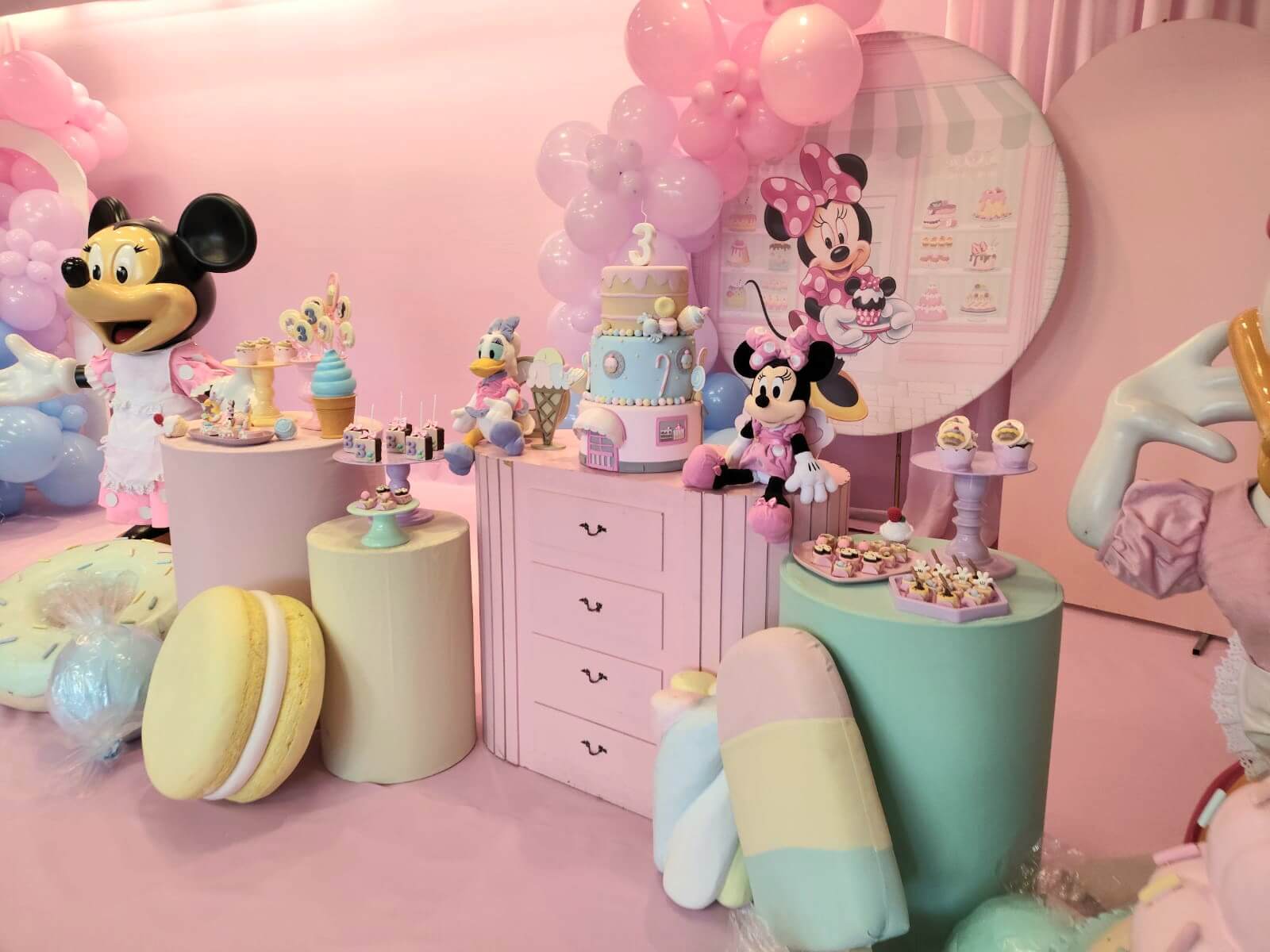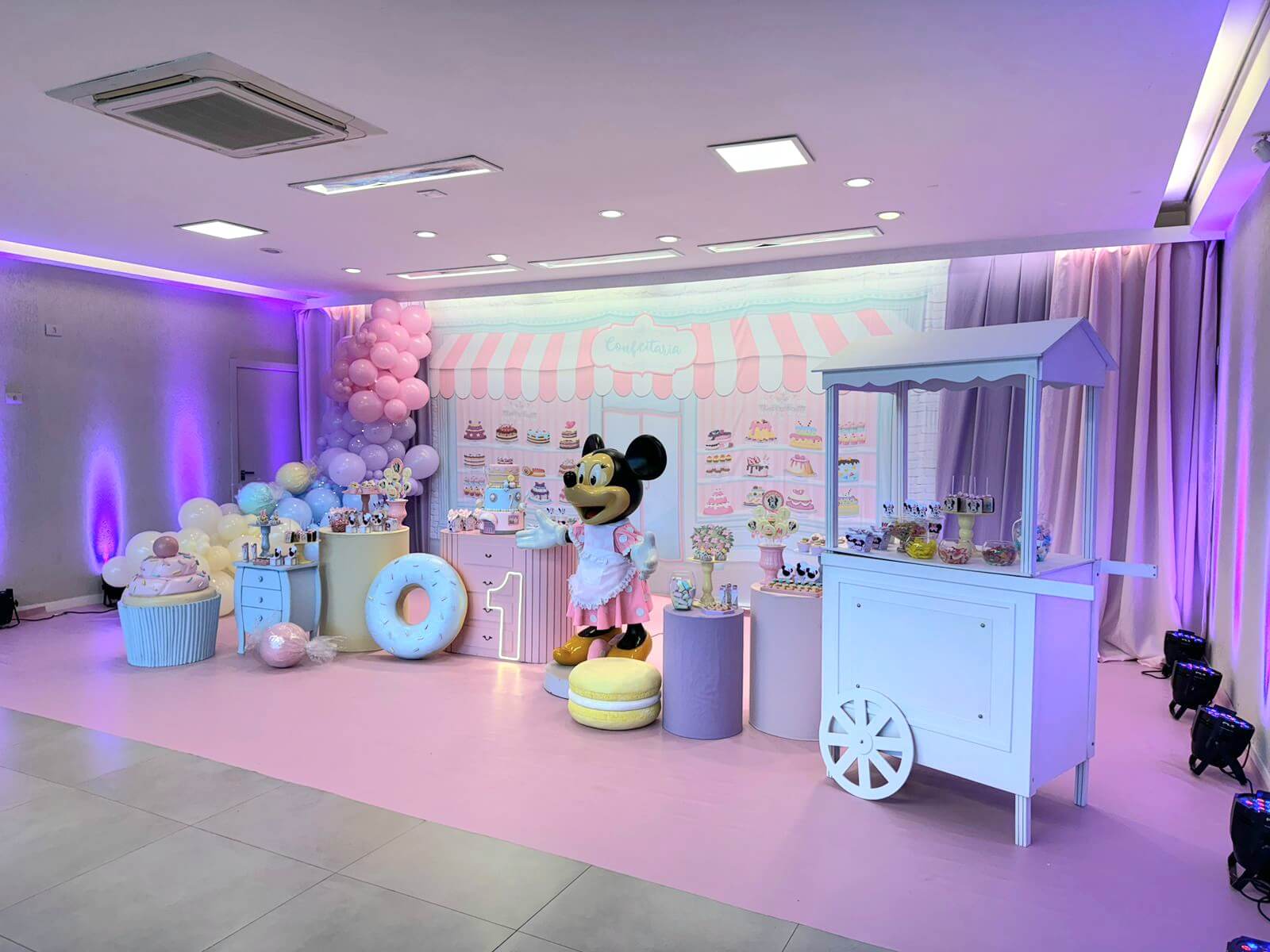 O tema Confeitaria da Minnie é um verdadeiro sonho açucarado, com cores suaves, doces gigantes e a presença encantadora da Minnie vestida de confeiteira. Um cenário repleto de cupcakes, donuts e macarons que transformam o ambiente em uma charmosa padaria cor-de-rosa digna da Disney.