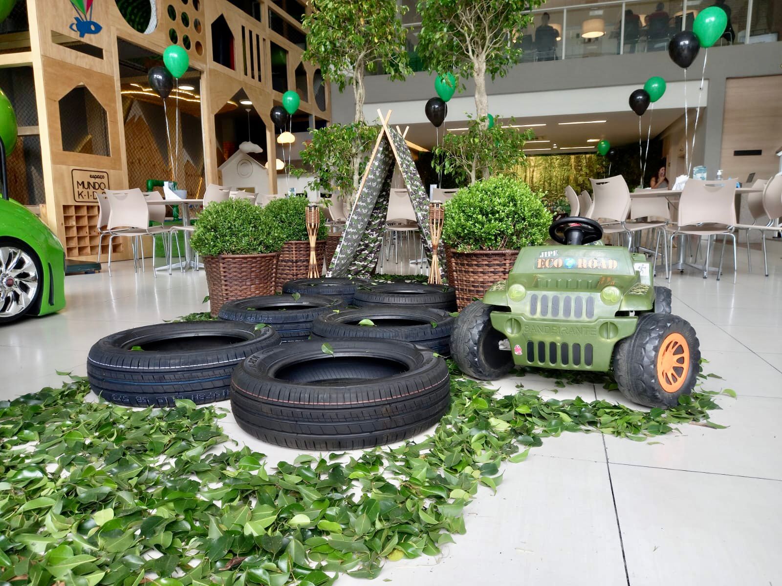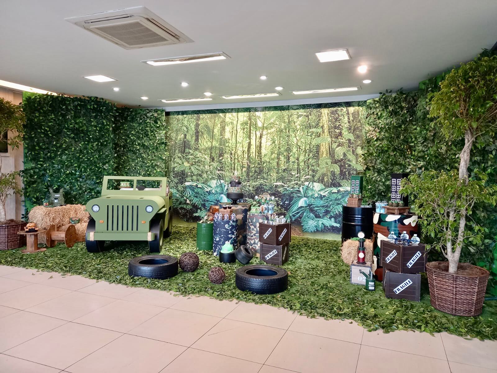 Decoração Personalizada desenvolvida pela equipe de Party Designers & Event Planners do Mundo Kids, com várias montagens que unem natureza, aventura e ação, proporcionando uma experiência imersiva e cheia de energia.
