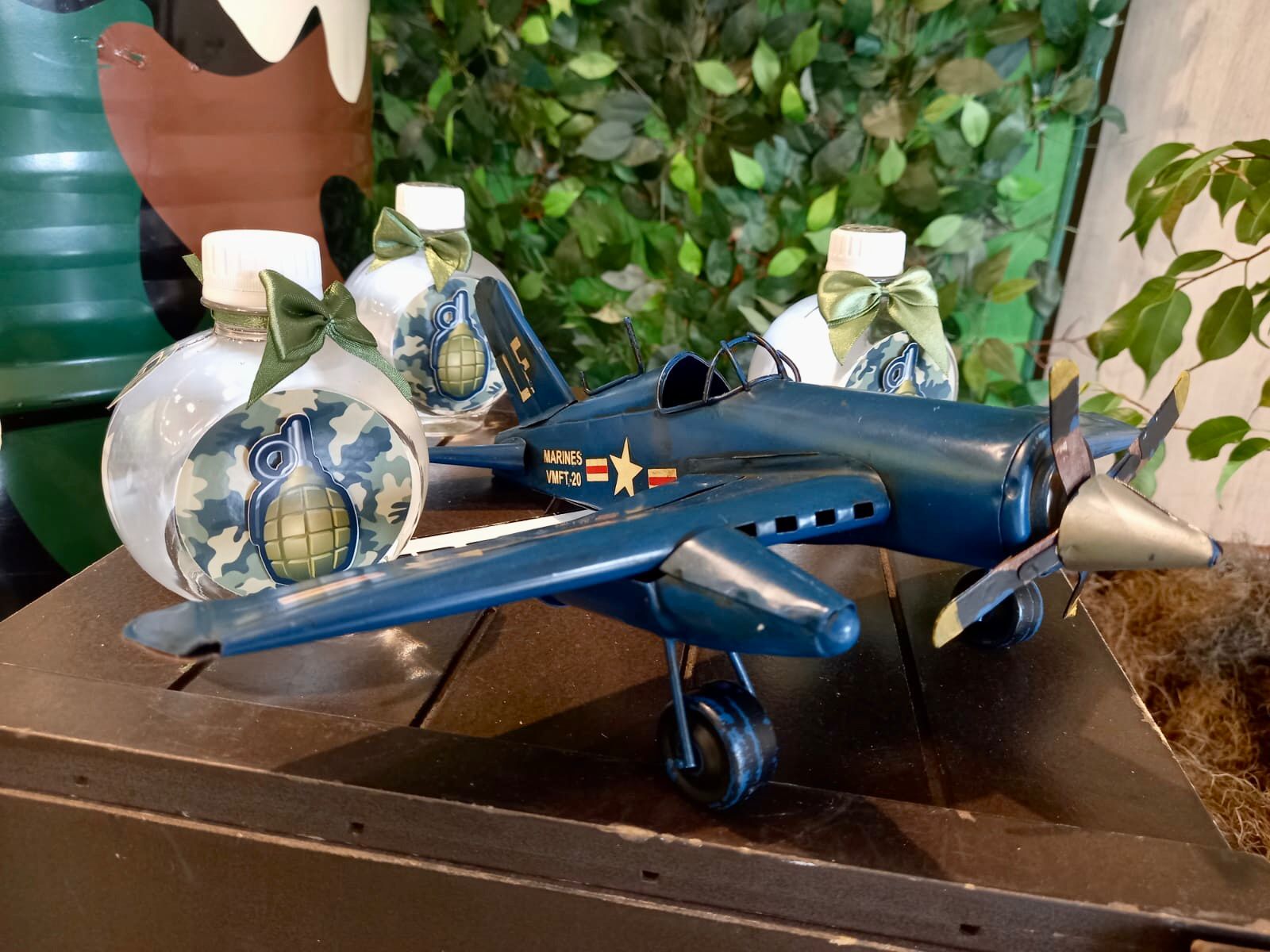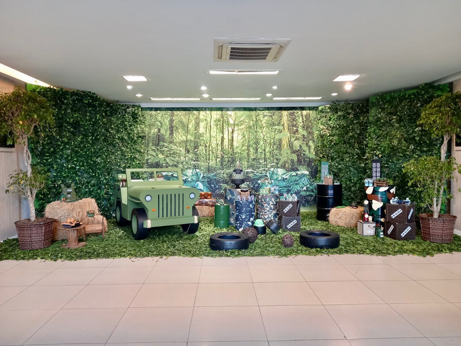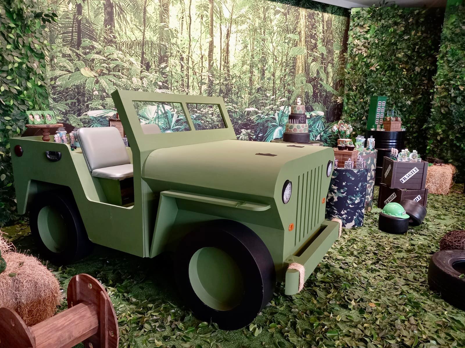 O tema Exército transforma o ambiente em um verdadeiro quartel-general da imaginação, com jeeps, caixas de suprimentos, capacetes e elementos camuflados que remetem ao universo militar de forma lúdica e empolgante.