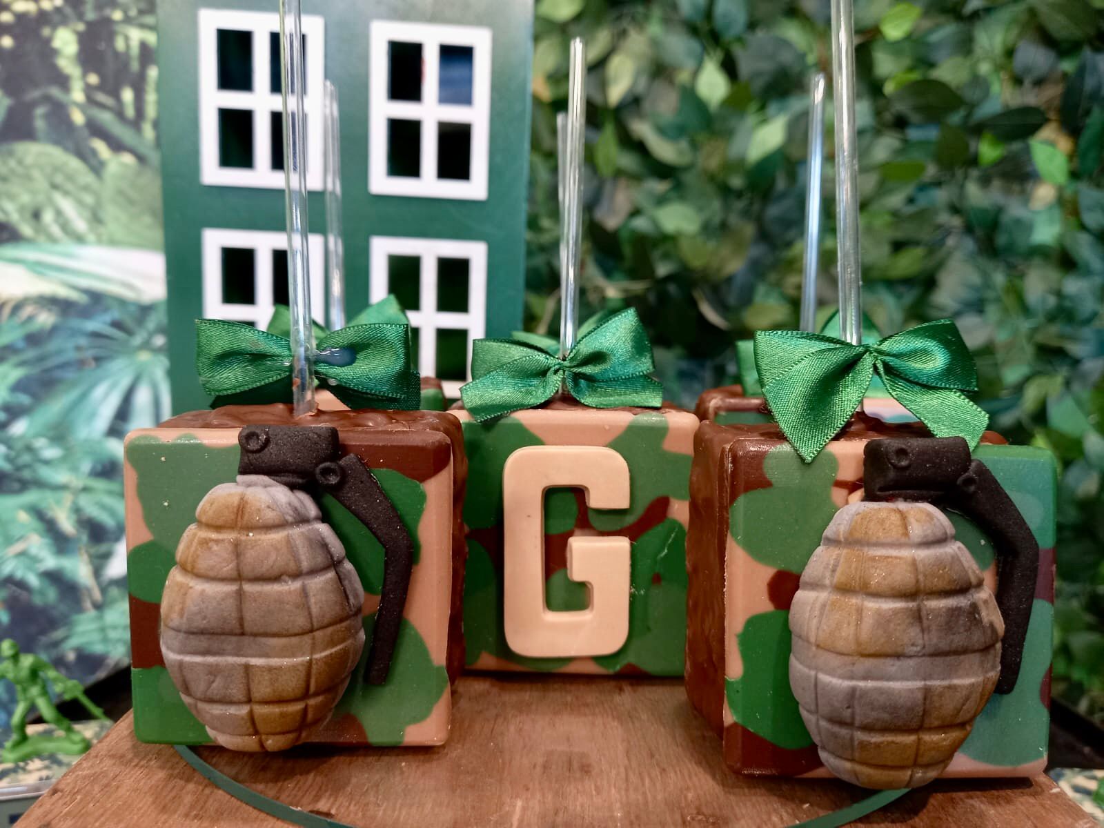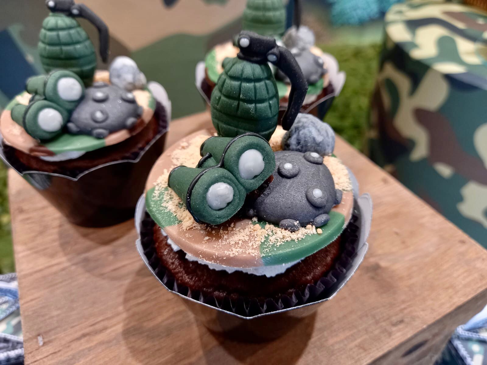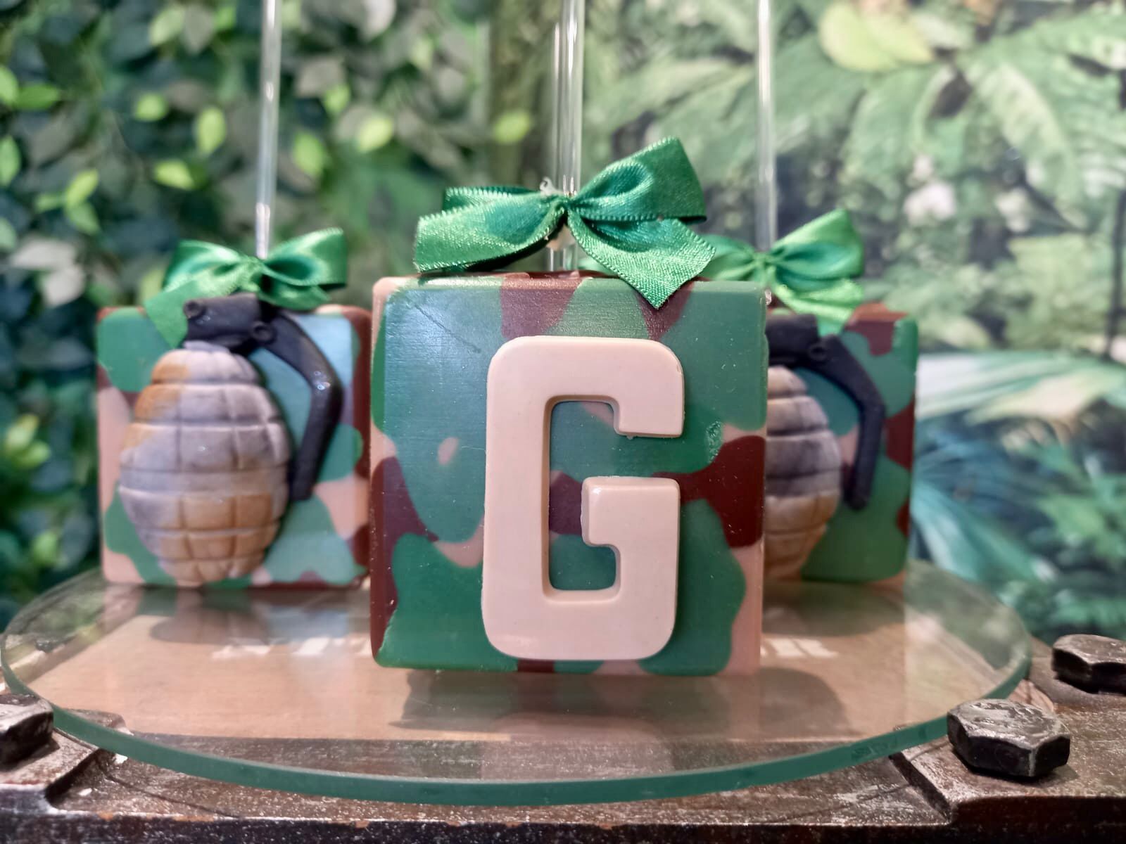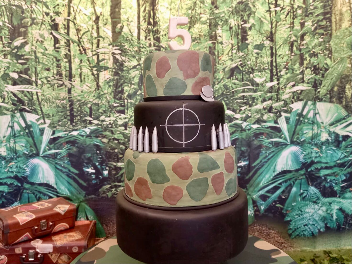 A decoração aposta em tons de verde, marrom e preto, além de folhagens naturais que criam o cenário perfeito de selva para aventuras e brincadeiras. Cada detalhe — do bolo às lembranças — reforça o espírito de equipe e coragem dos pequenos soldados.