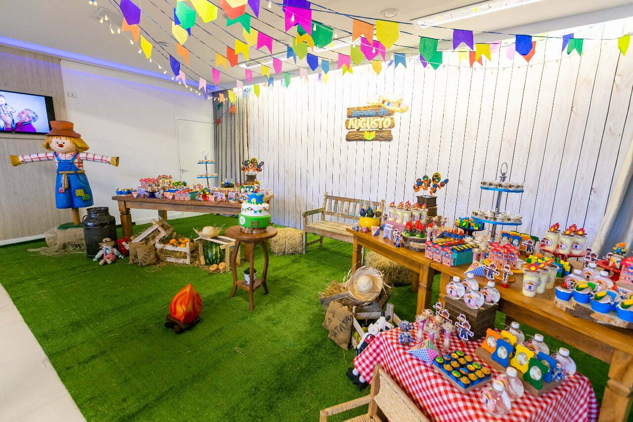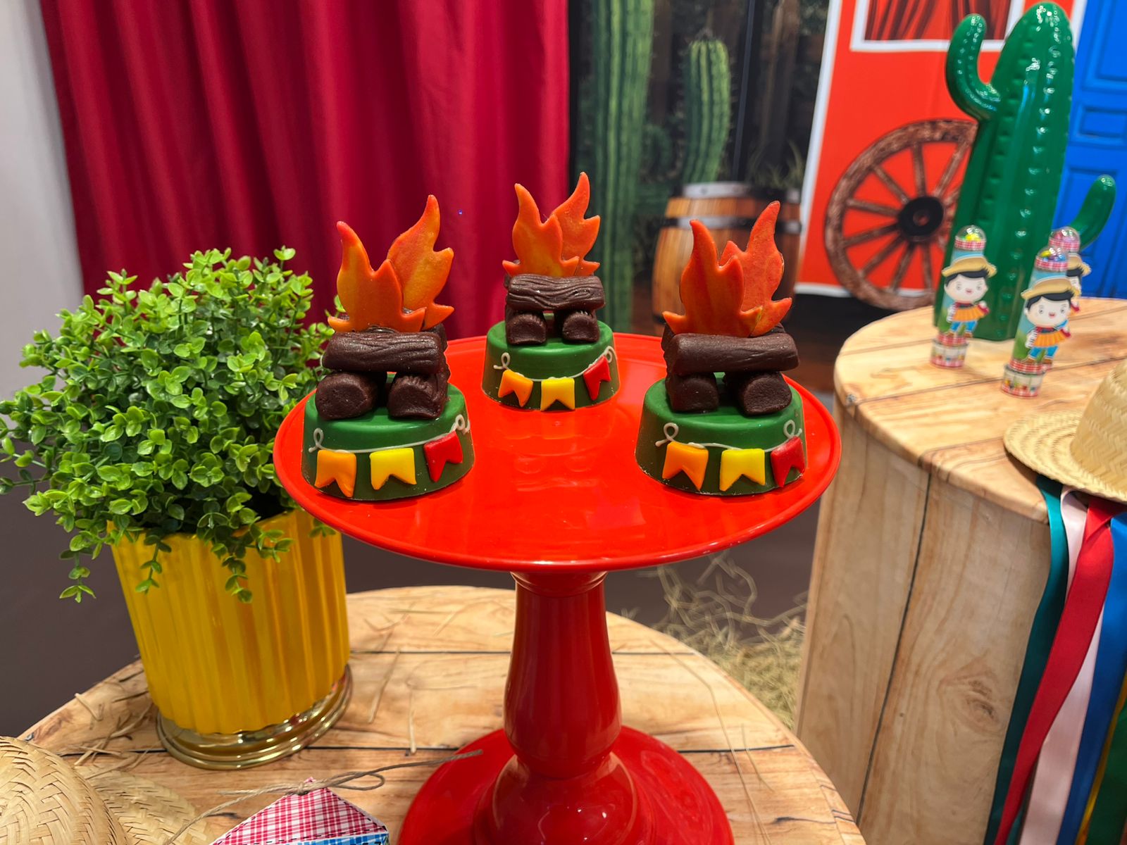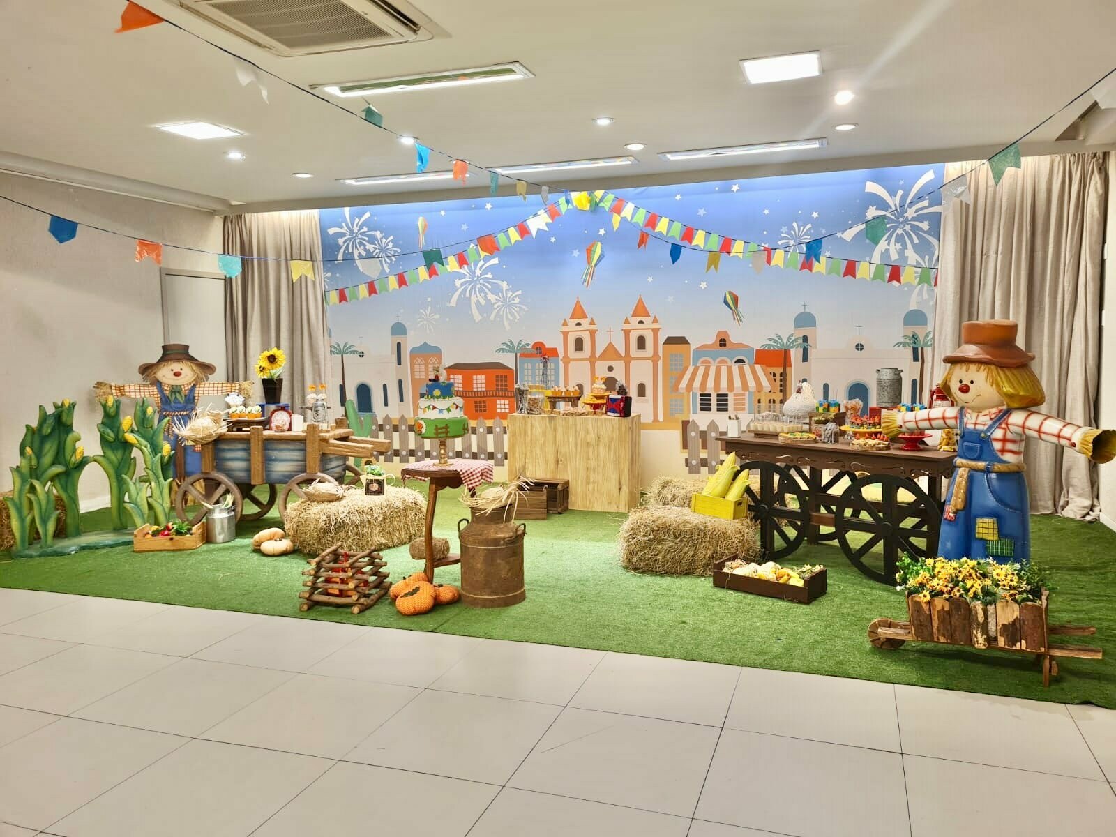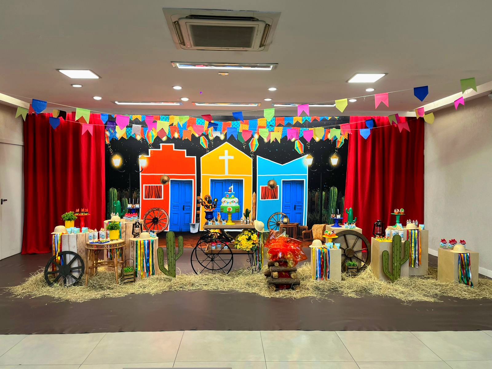 Os elementos decorativos — como fogueiras, espantalhos, barracas, balões e frutas da época — trazem todo o clima das festas juninas, enquanto os quitutes tradicionais, como pipoca, paçoca e pé de moleque, completam a experiência.