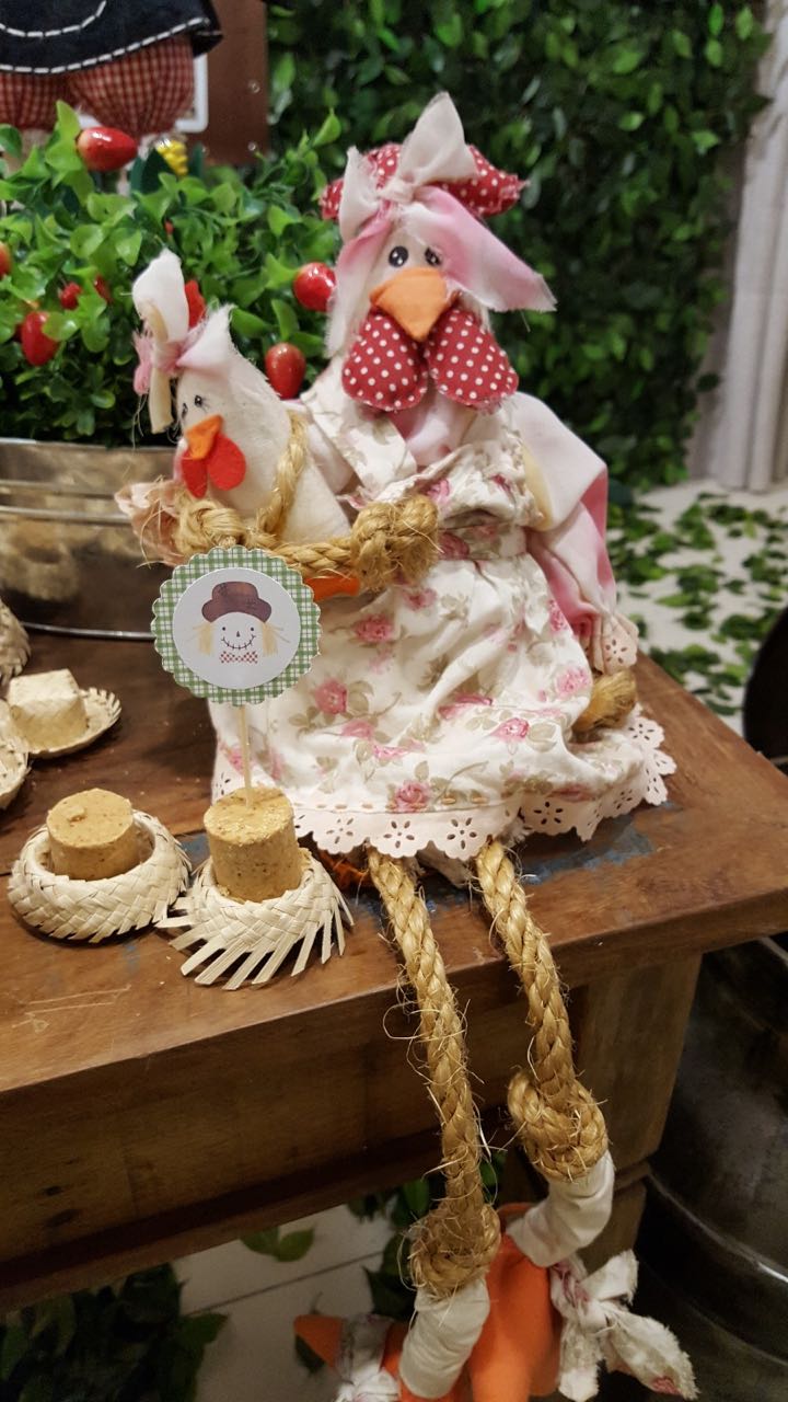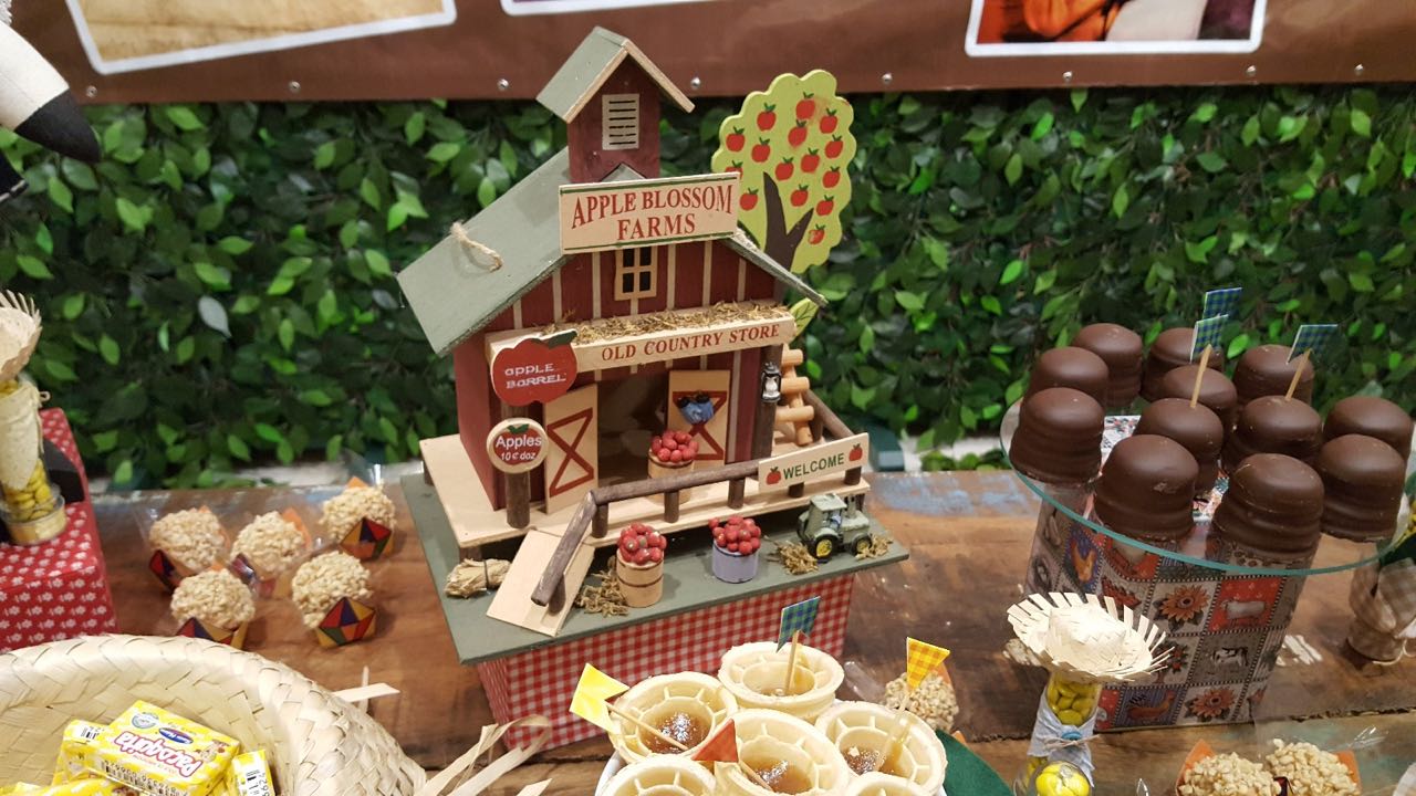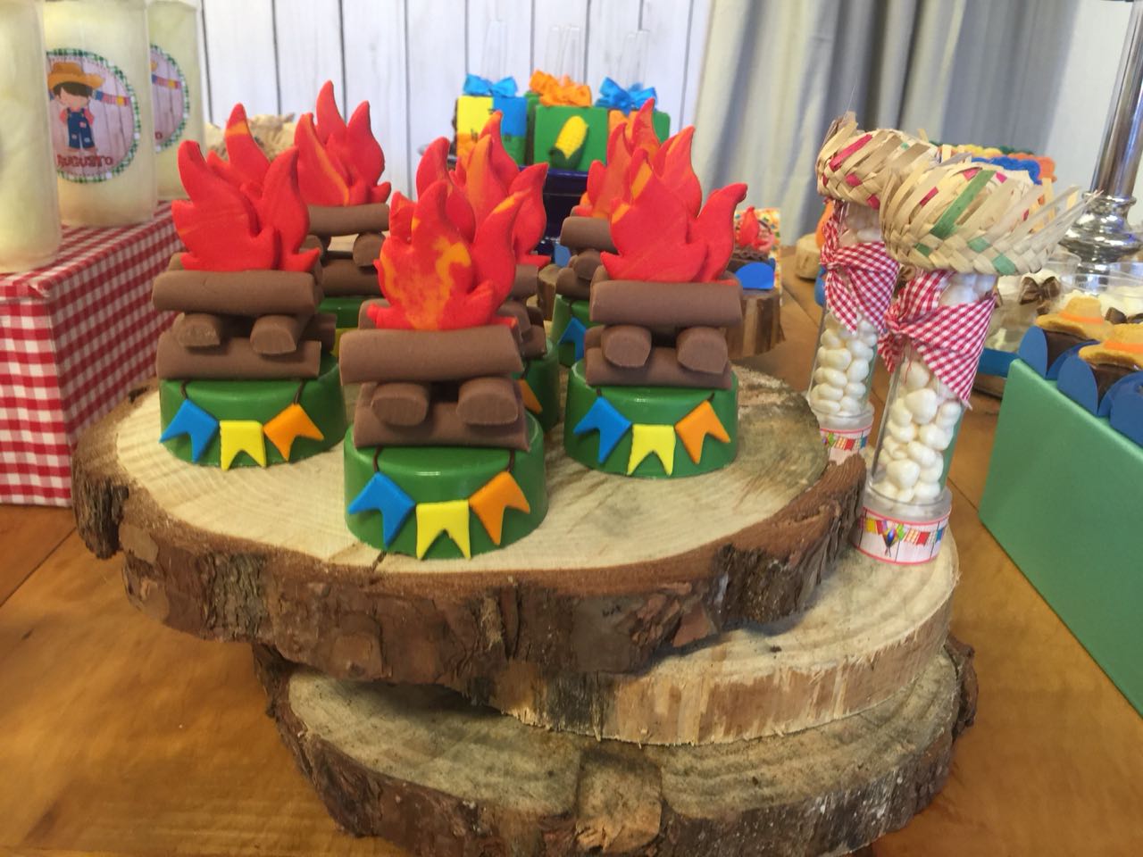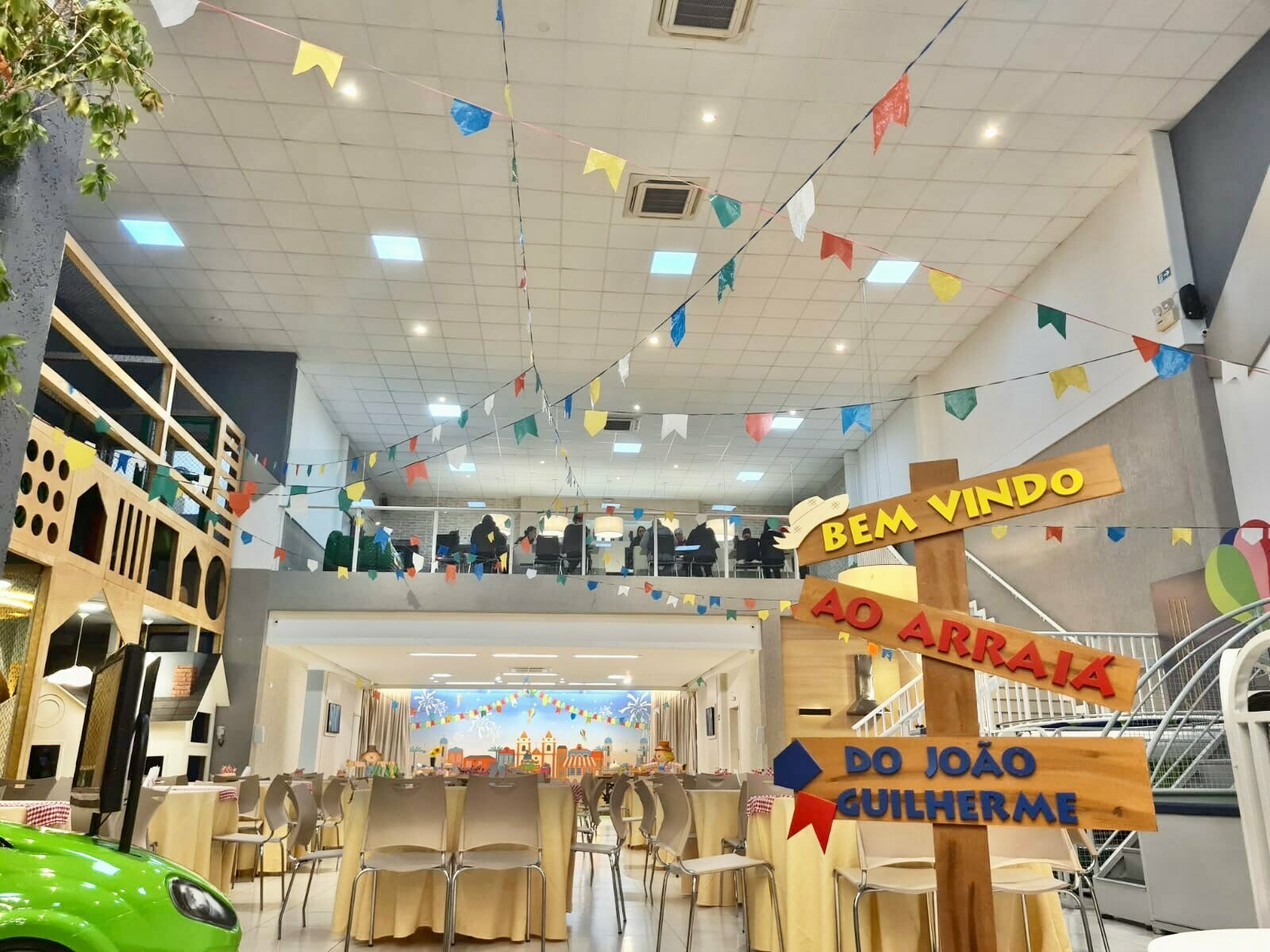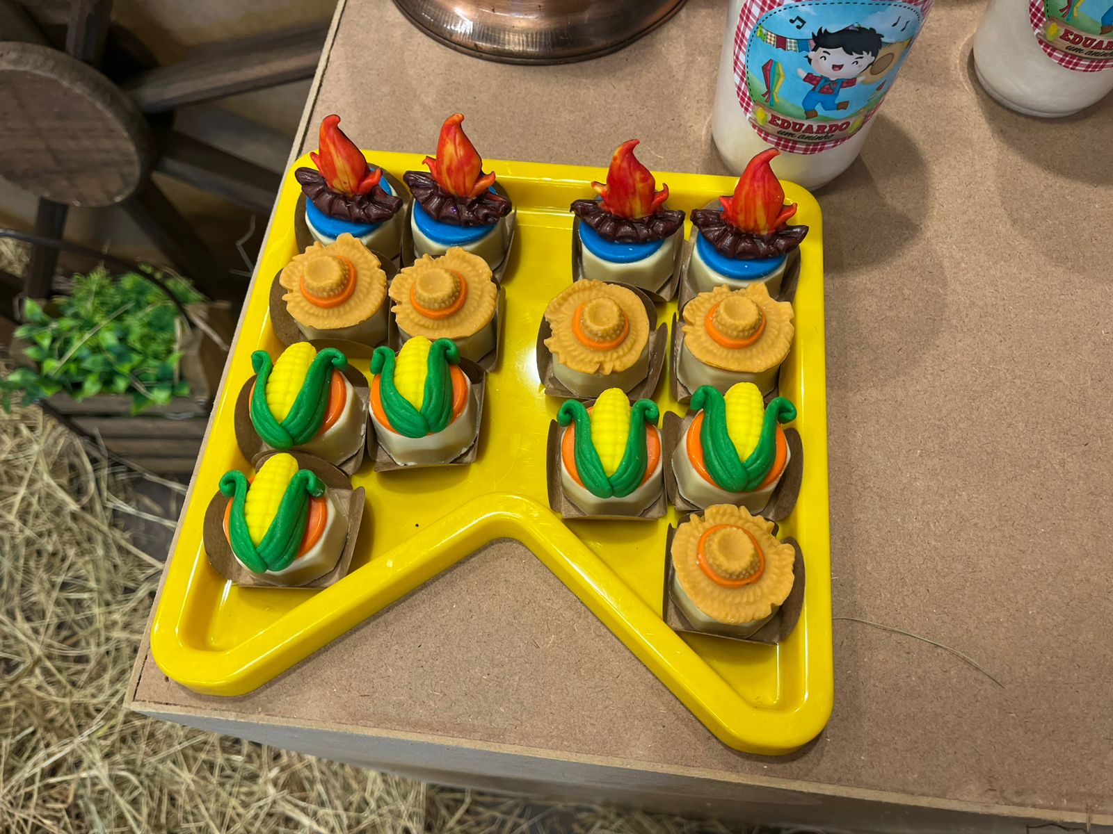 Os elementos decorativos — como fogueiras, espantalhos, barracas, balões e frutas da época — trazem todo o clima das festas juninas, enquanto os quitutes tradicionais, como pipoca, paçoca e pé de moleque, completam a experiência.