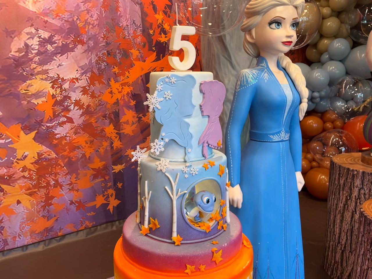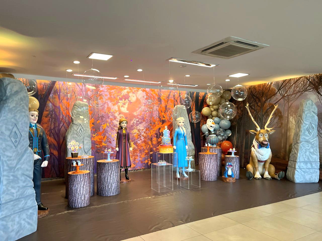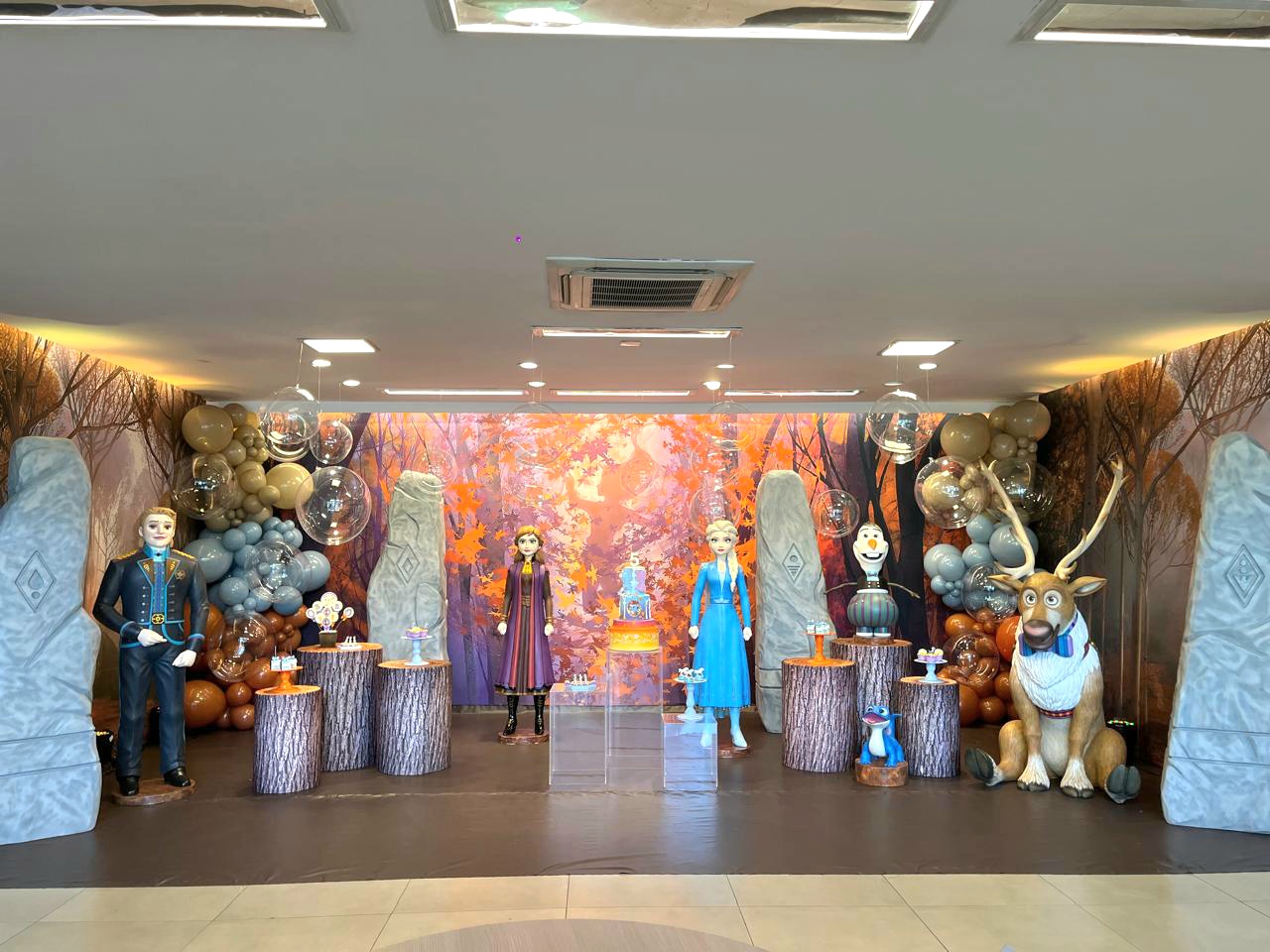 Com Elsa, Anna, Olaf, Kristoff e Sven em destaque, cada detalhe remete à jornada dos personagens pelos elementos da natureza. A decoração personalizada da equipe Mundo Kids une encanto e elegância em uma experiência inesquecível.
