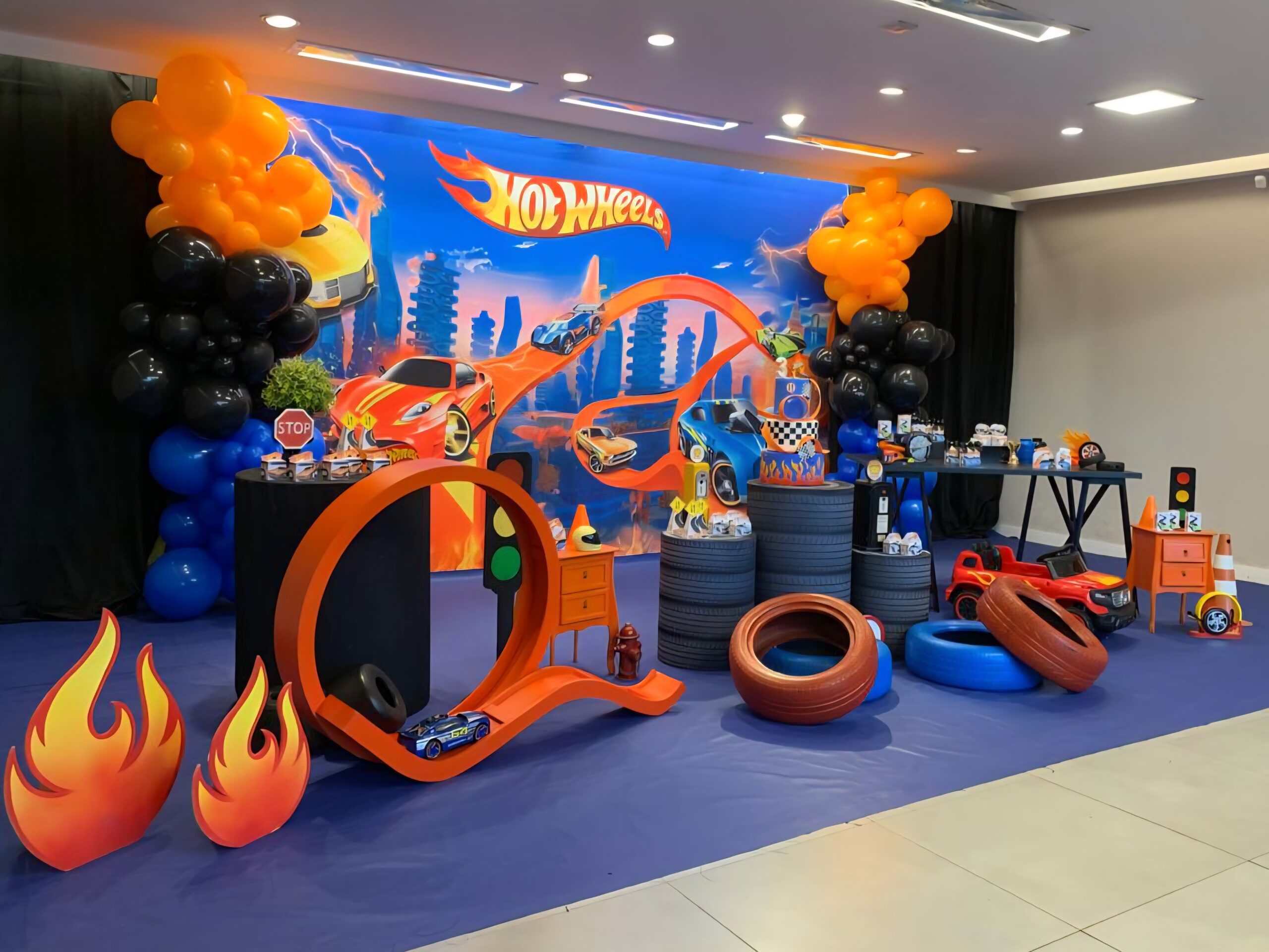 O tema Hot Wheels acelera a imaginação e transforma o ambiente em uma verdadeira pista de corrida. Com direito a carros em miniatura, cones, tambores metálicos e uma pista no centro do salão, a decoração faz qualquer criança se sentir dentro do universo das corridas radicais.