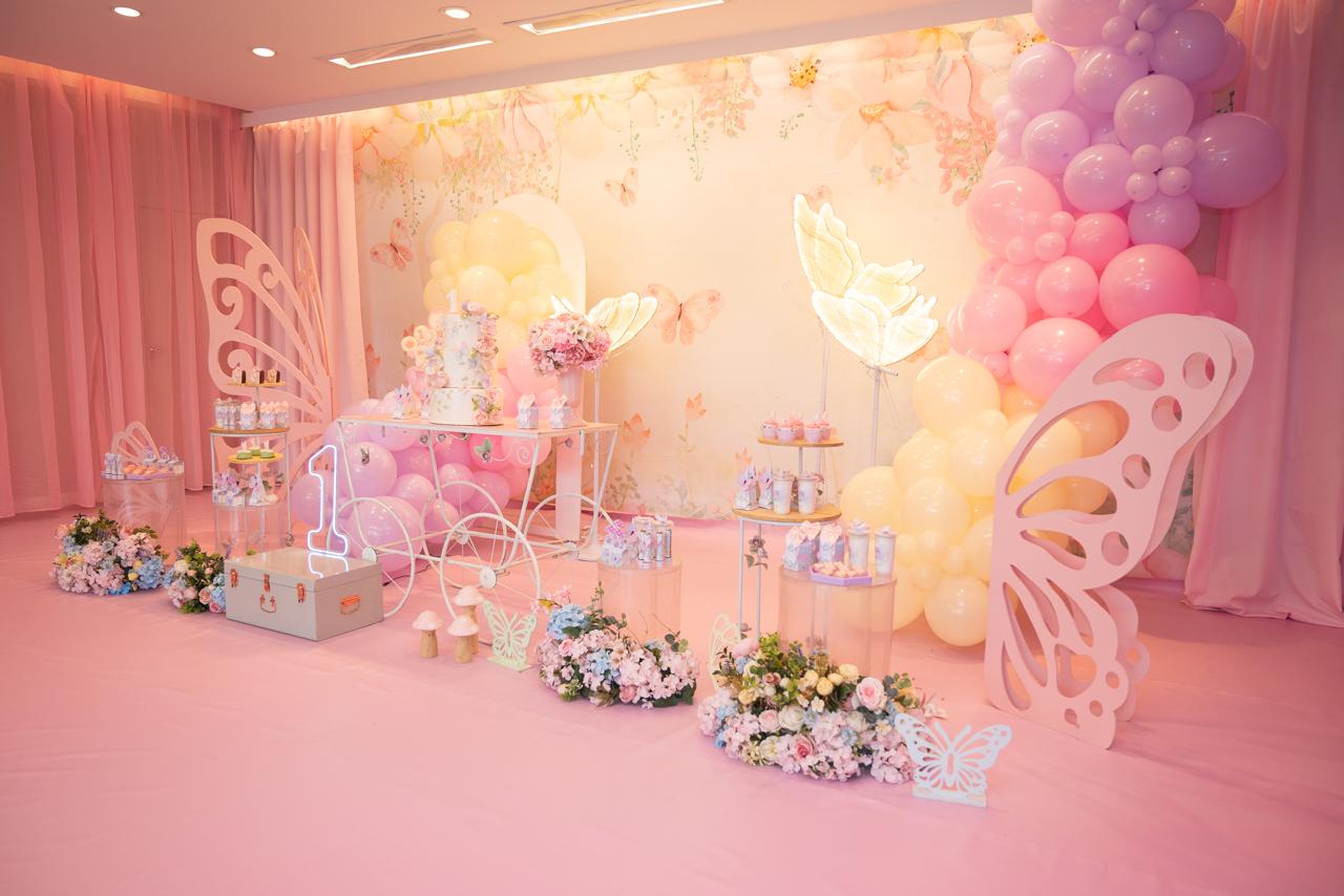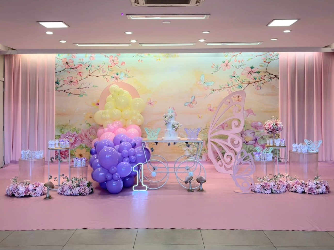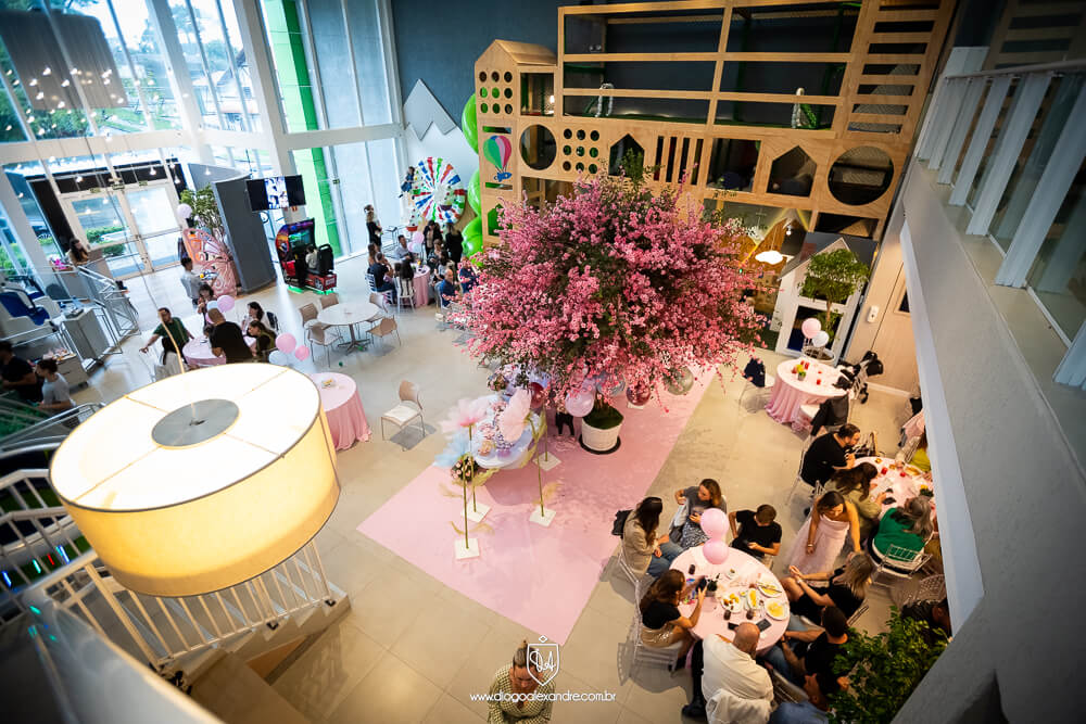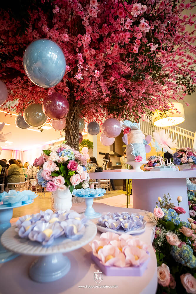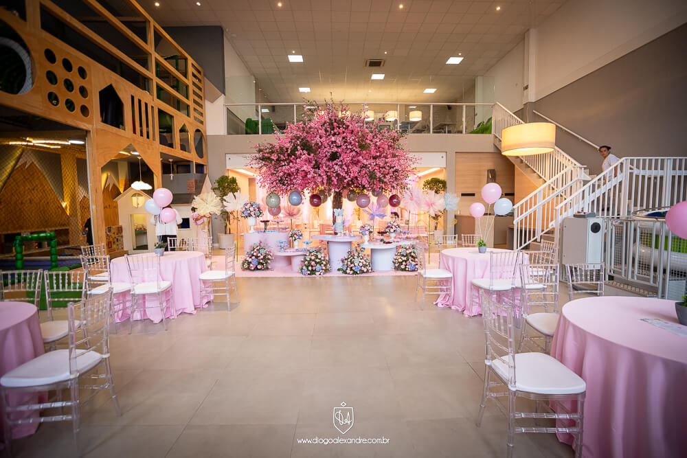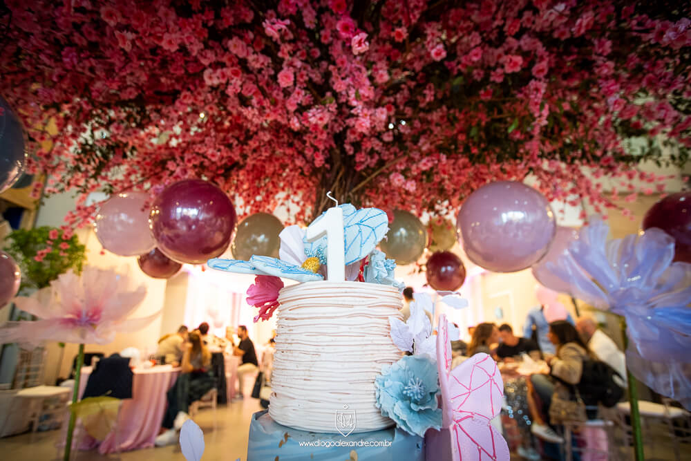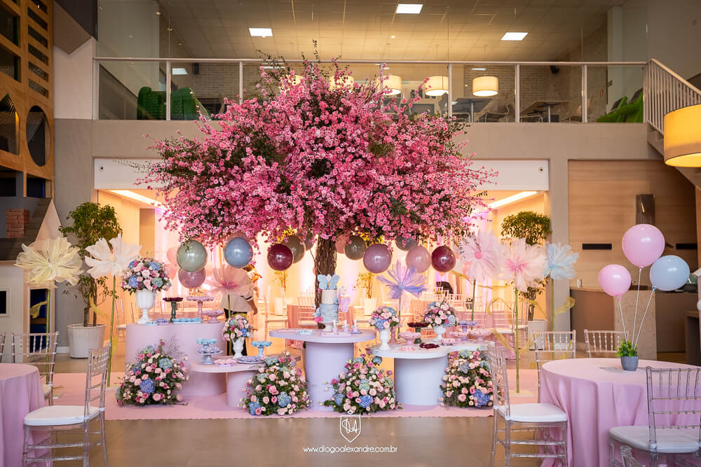 O tema Jardim das Borboletas é um espetáculo visual que combina sofisticação e encanto. O destaque fica por conta da imponente árvore central, repleta de flores em tons de rosa, que cria uma atmosfera mágica e envolvente.