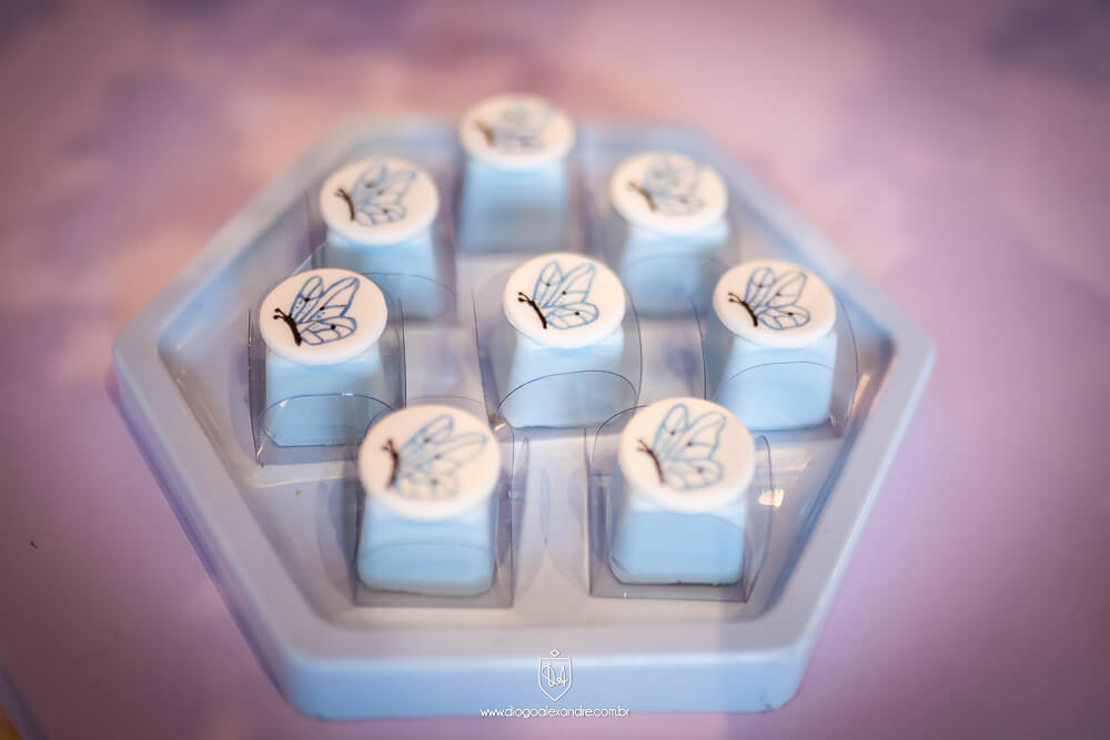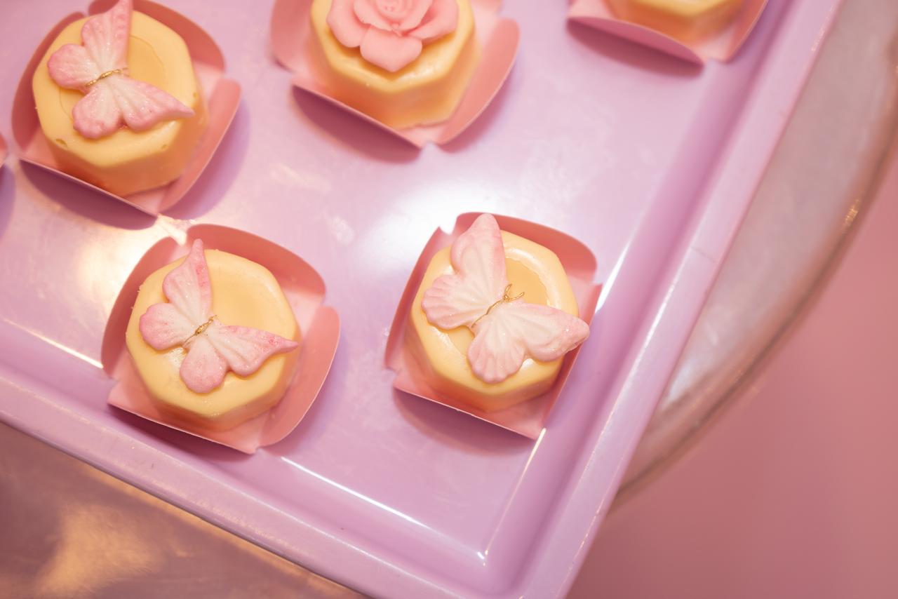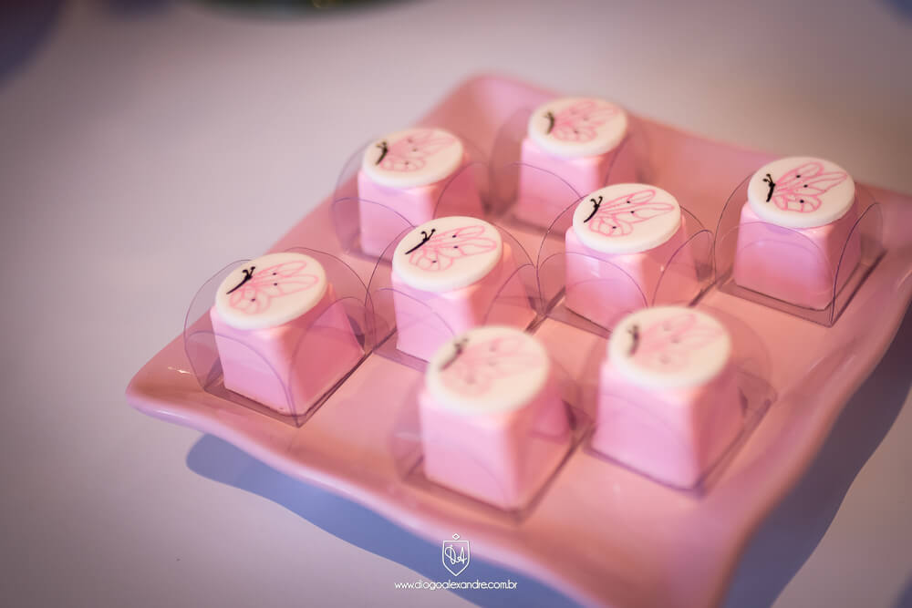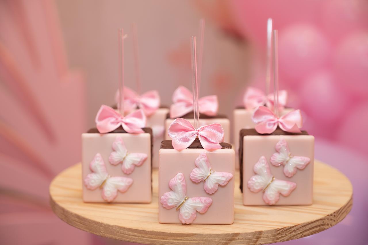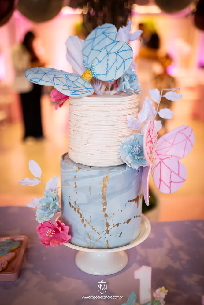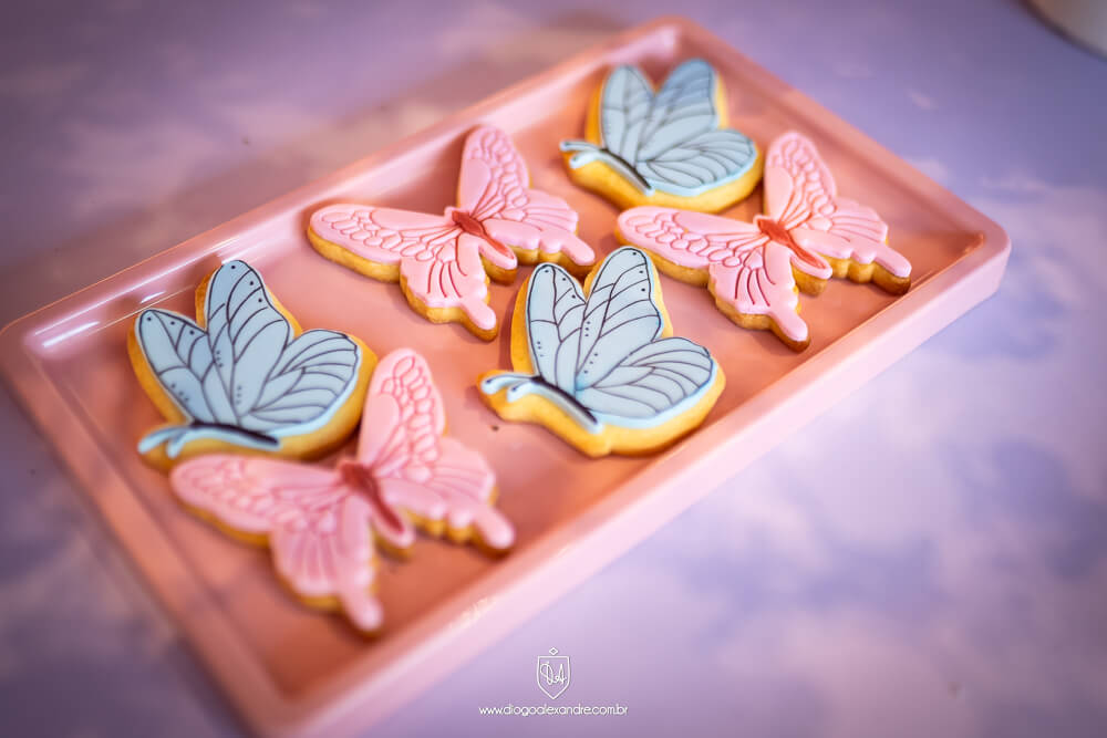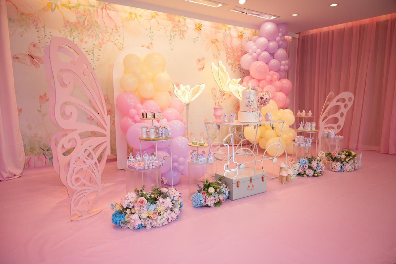 O tema Jardim das Borboletas é um espetáculo visual que combina sofisticação e encanto. O destaque fica por conta da imponente árvore central, repleta de flores em tons de rosa, que cria uma atmosfera mágica e envolvente.