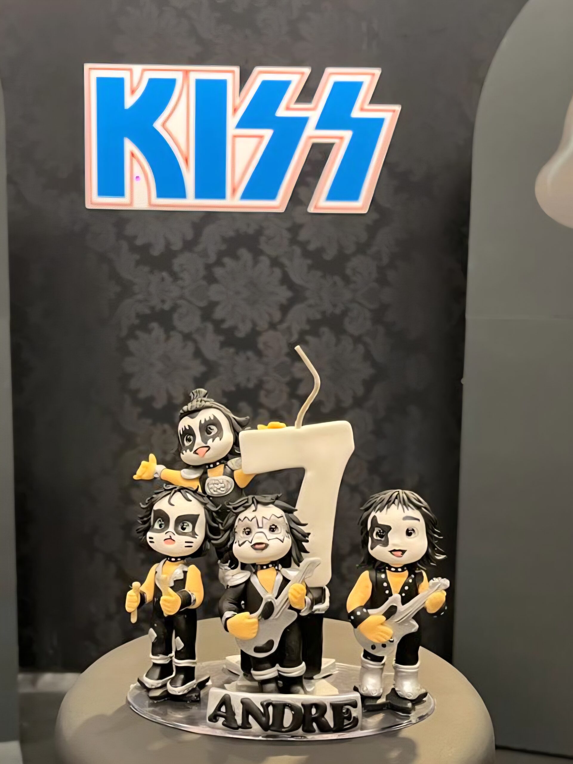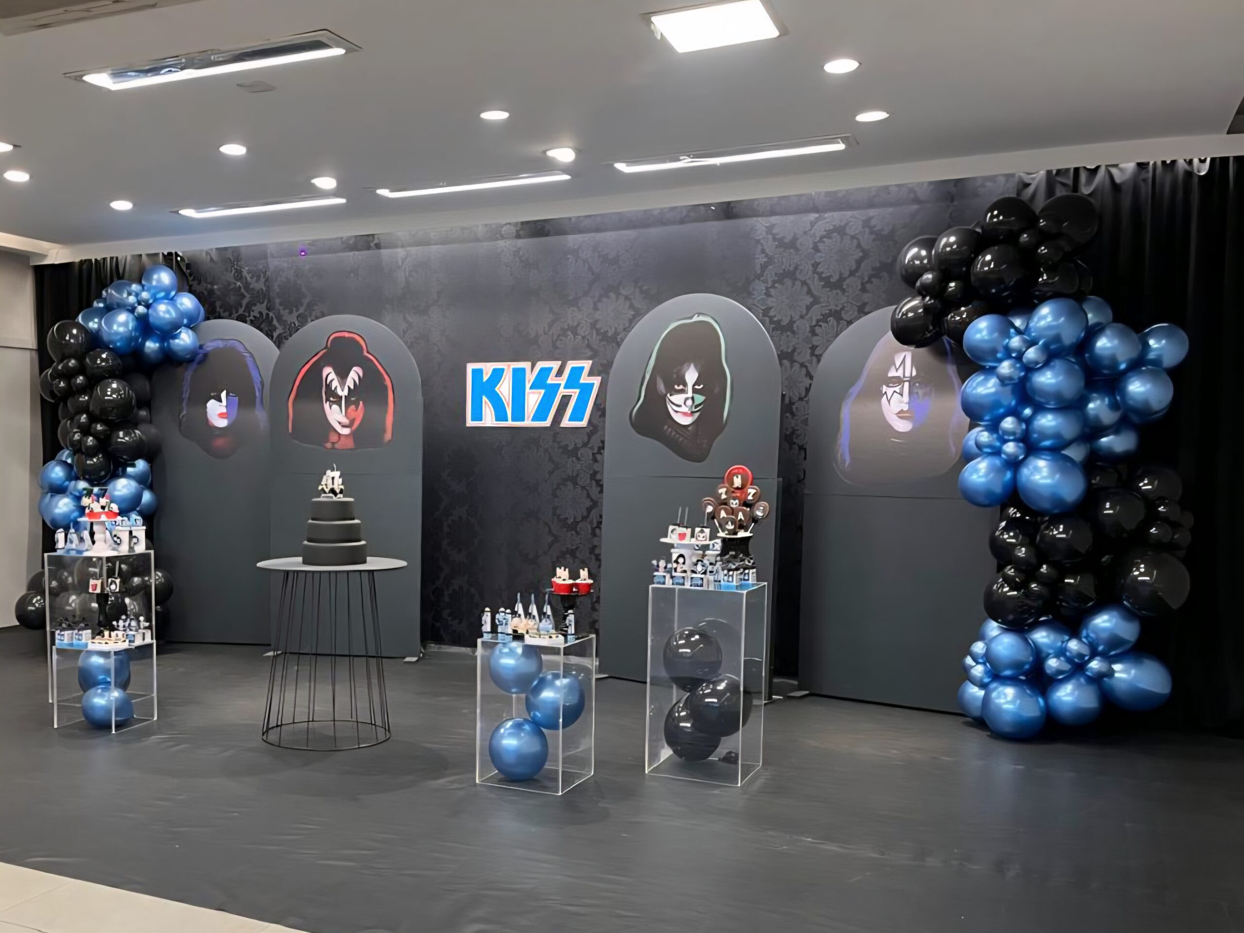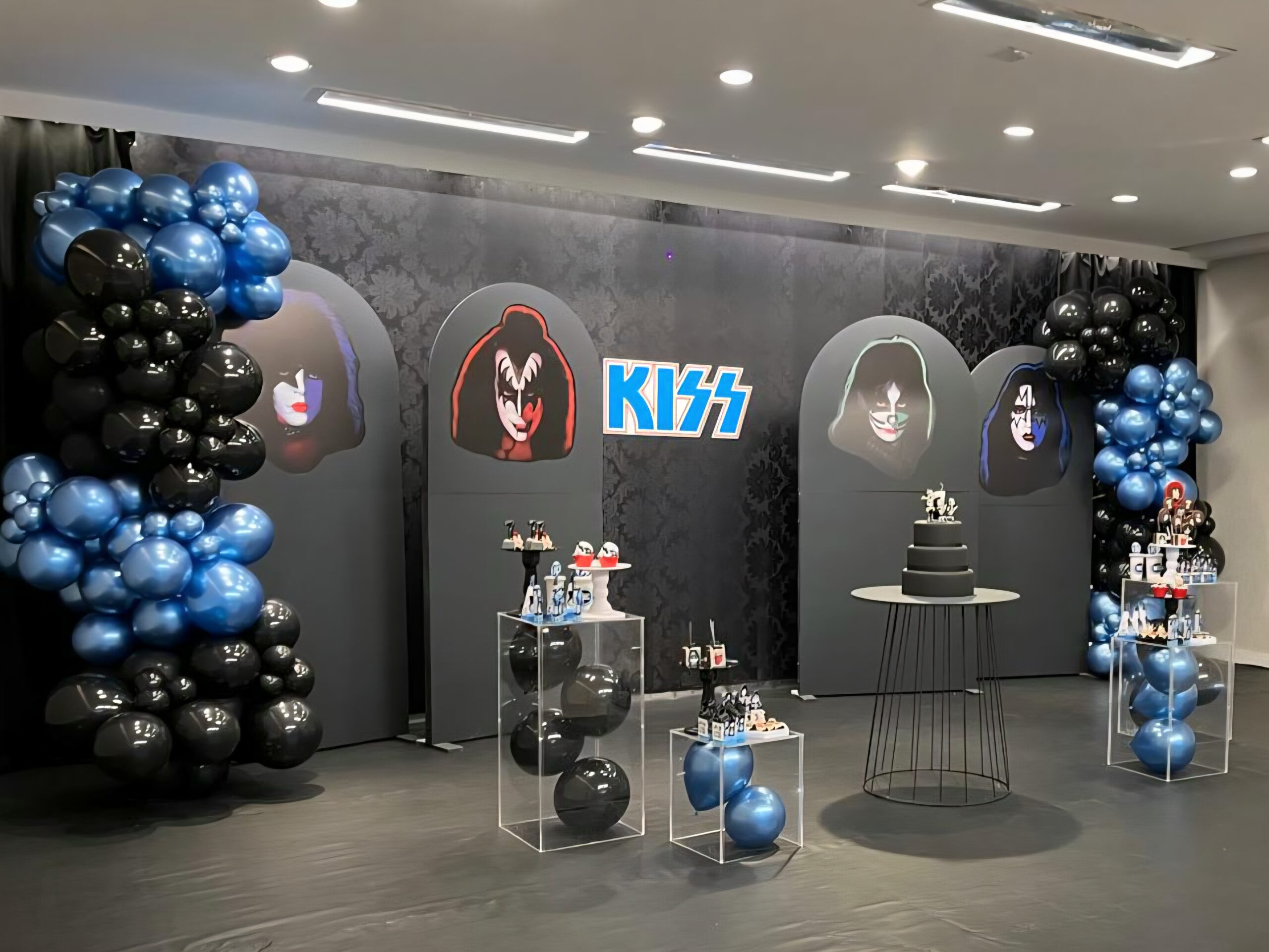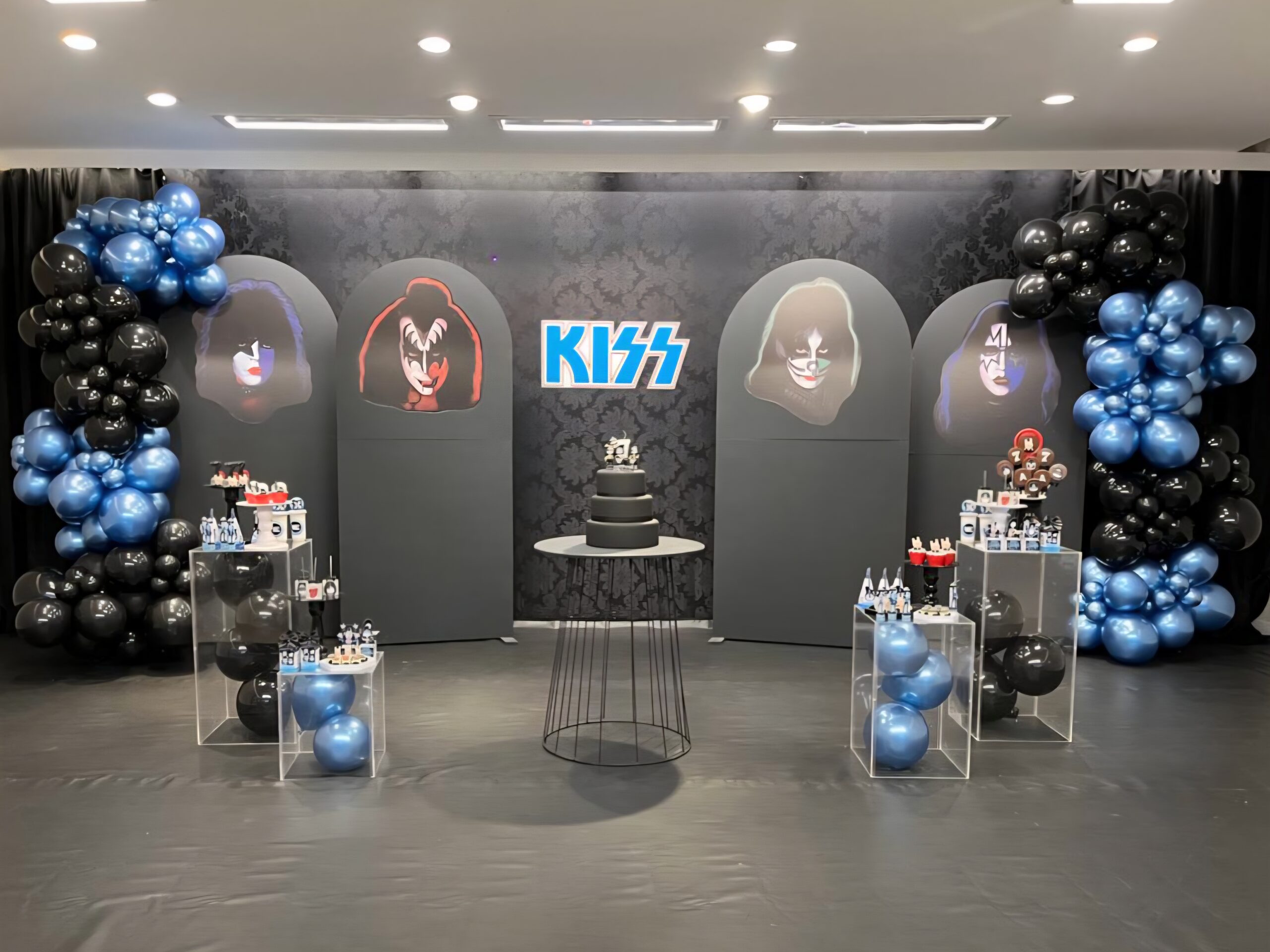 A decoração traz tons de preto, grafite e azul metálico, elementos característicos do universo do rock’n’roll e detalhes que remetem às maquiagens, figurinos e símbolos do grupo. O cenário se destaca pelo visual imponente e moderno, enquanto as mesas de doces e o bolo seguem a estética impecável do tema, criando uma atmosfera ousada e cheia de estilo.