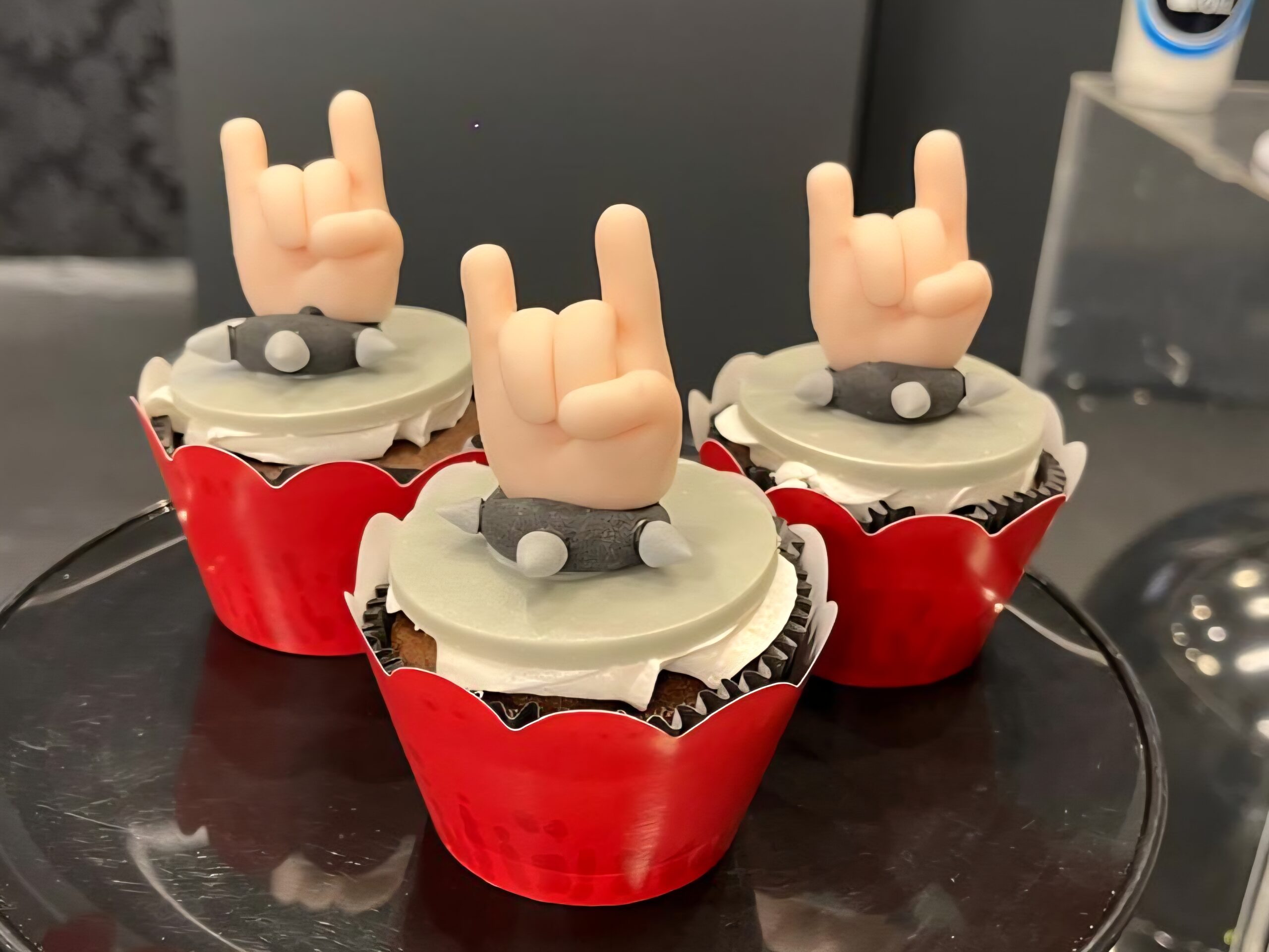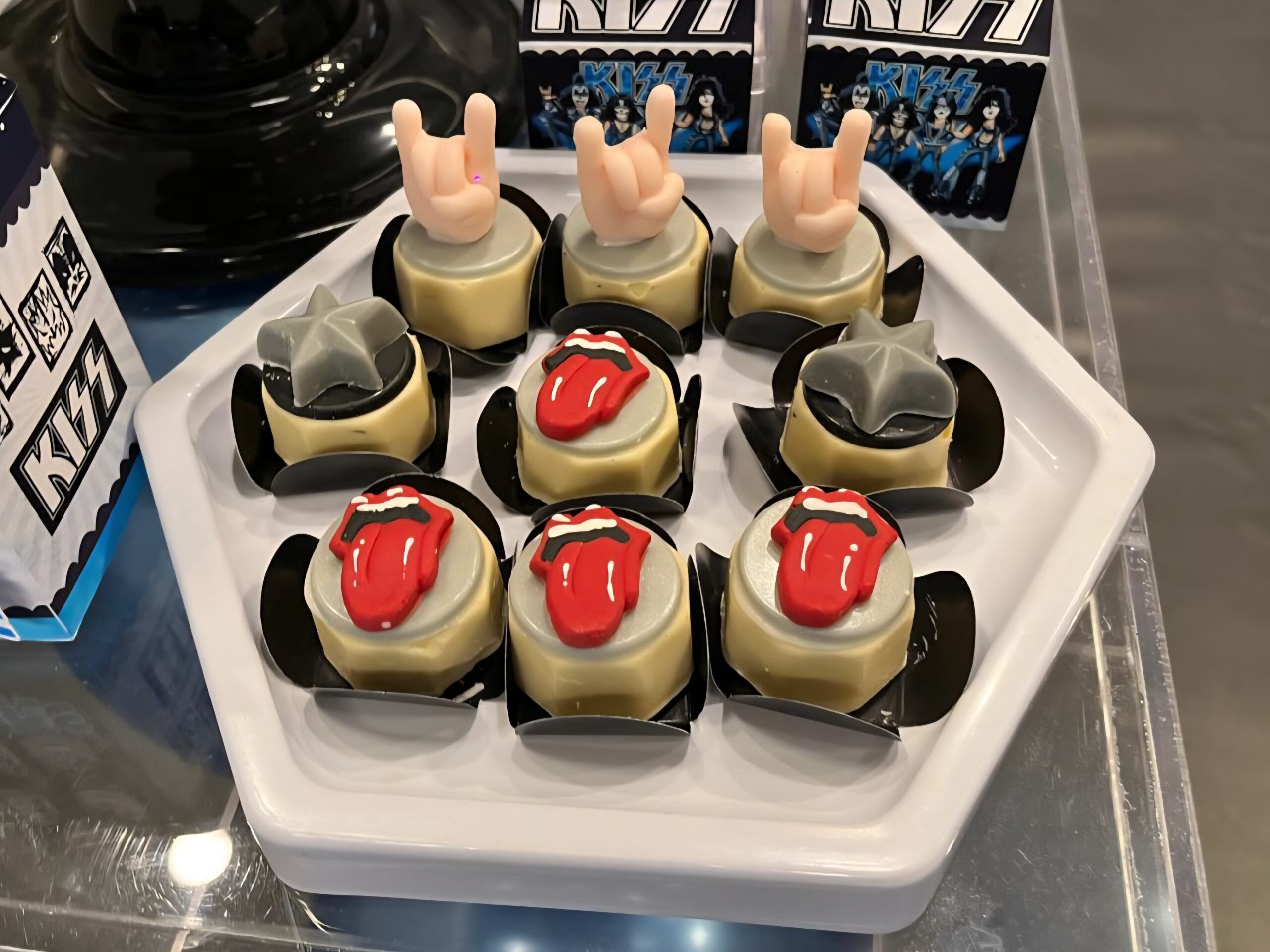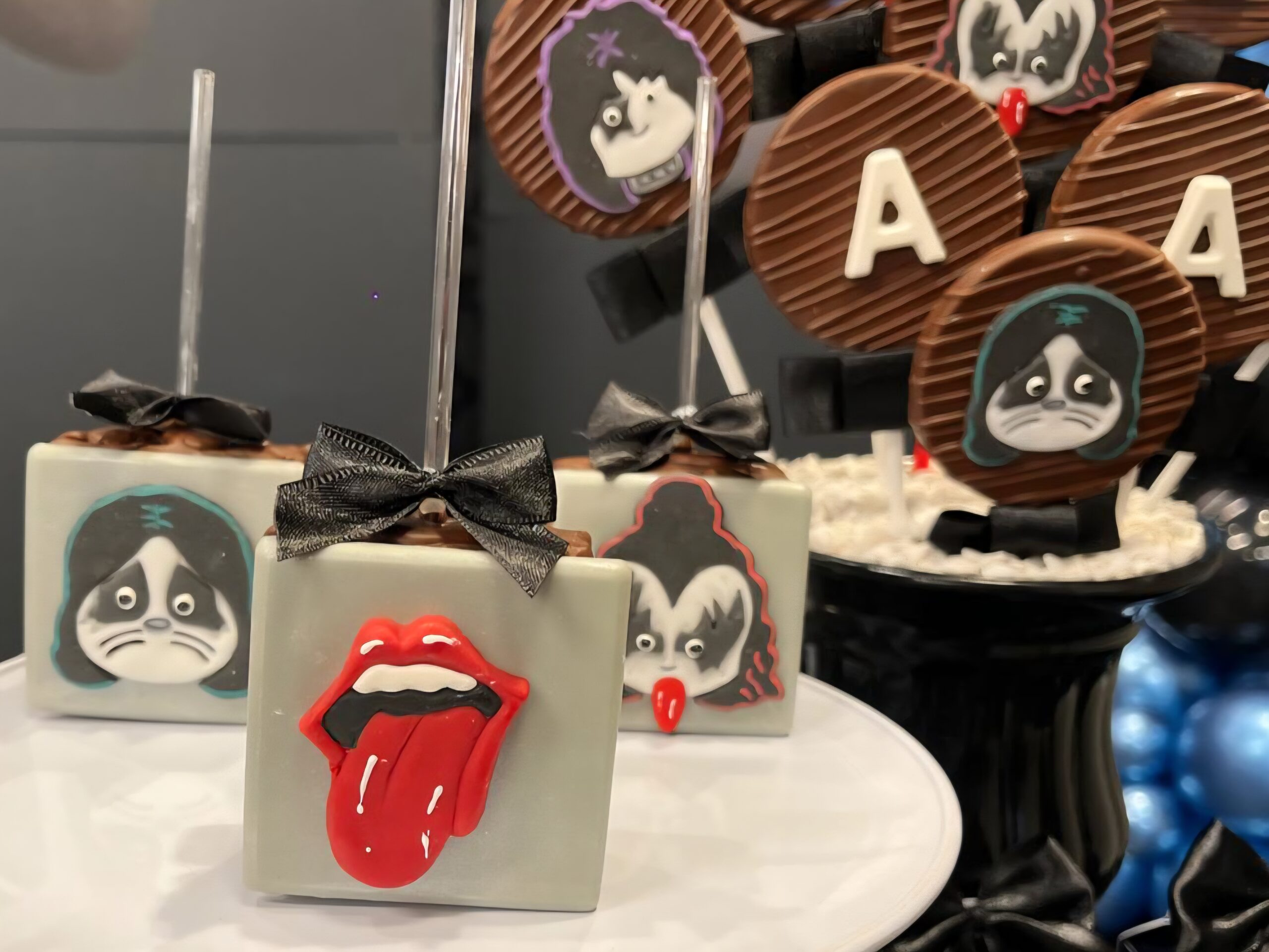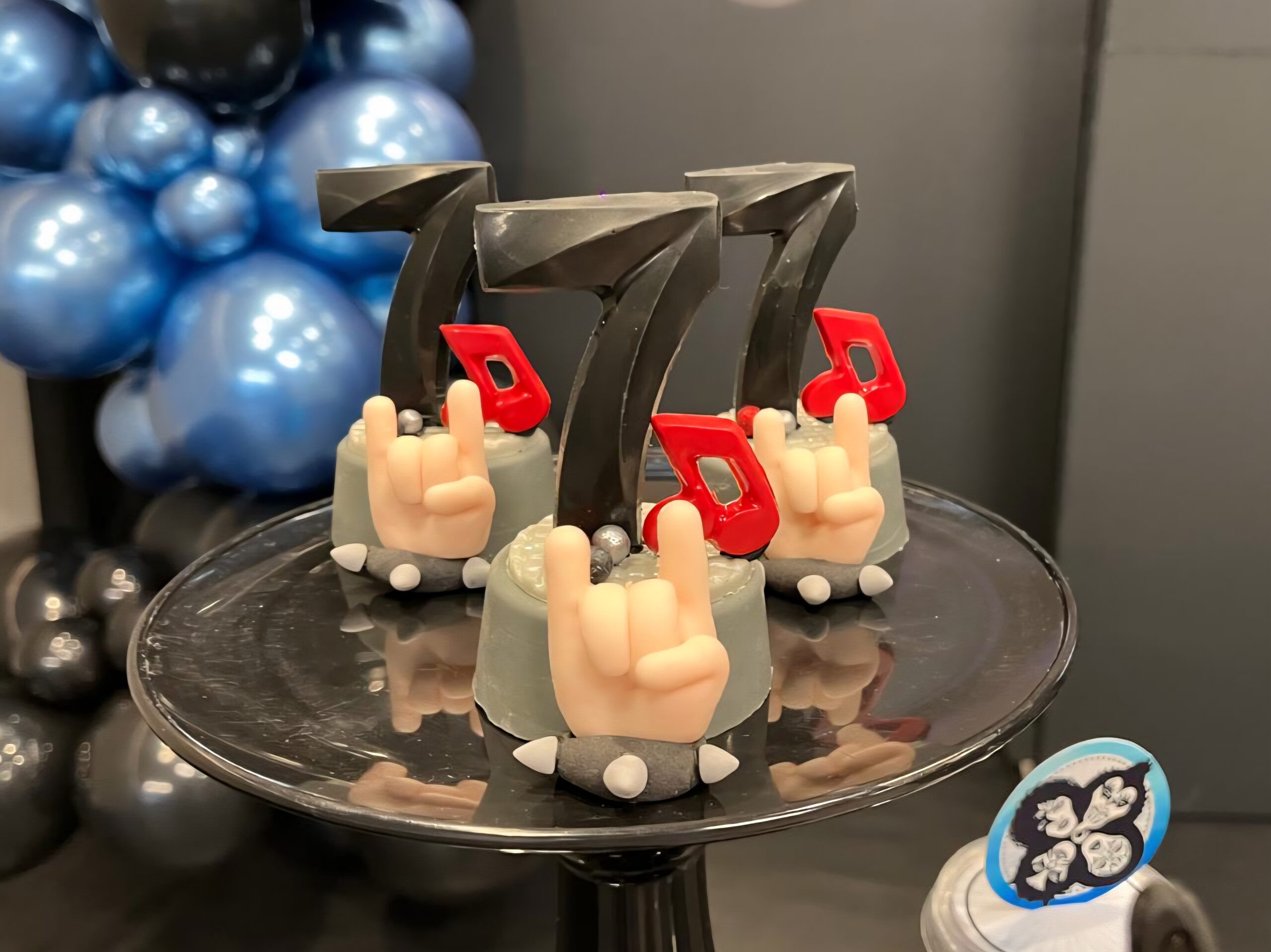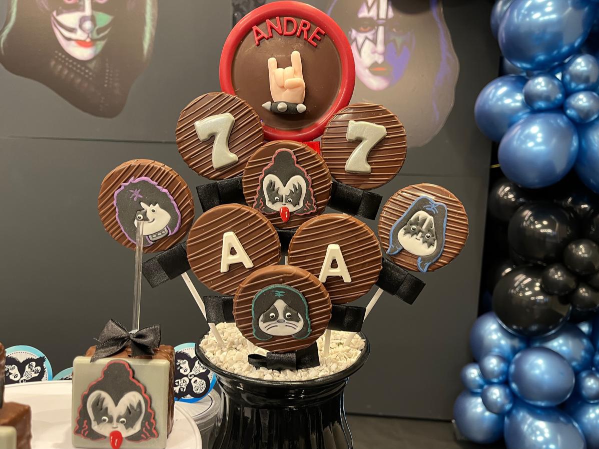 A decoração traz tons de preto, grafite e azul metálico, elementos característicos do universo do rock’n’roll e detalhes que remetem às maquiagens, figurinos e símbolos do grupo. O cenário se destaca pelo visual imponente e moderno, enquanto as mesas de doces e o bolo seguem a estética impecável do tema, criando uma atmosfera ousada e cheia de estilo.
