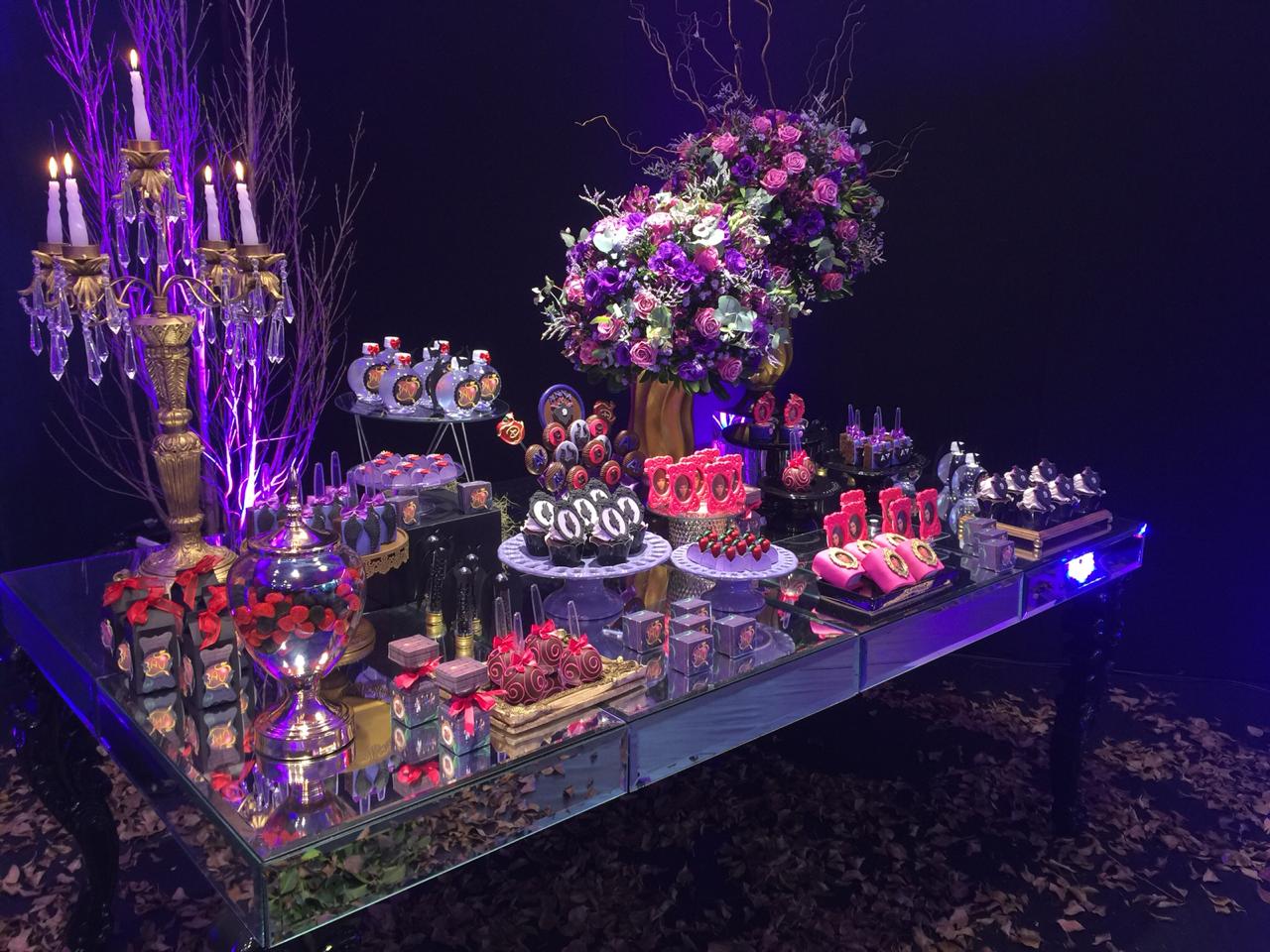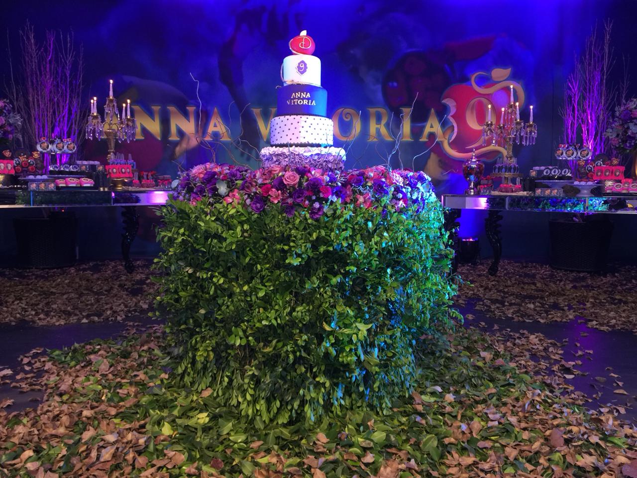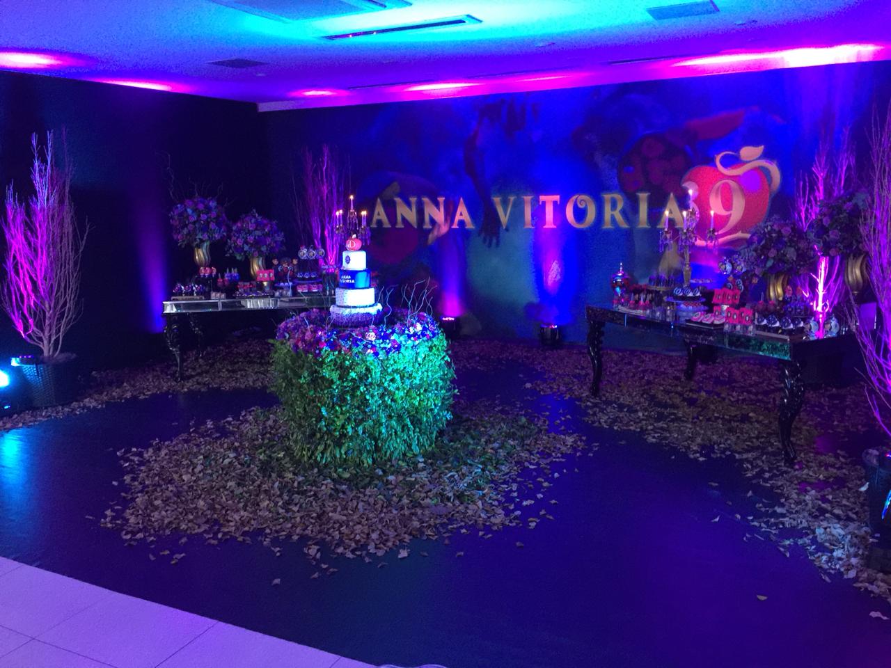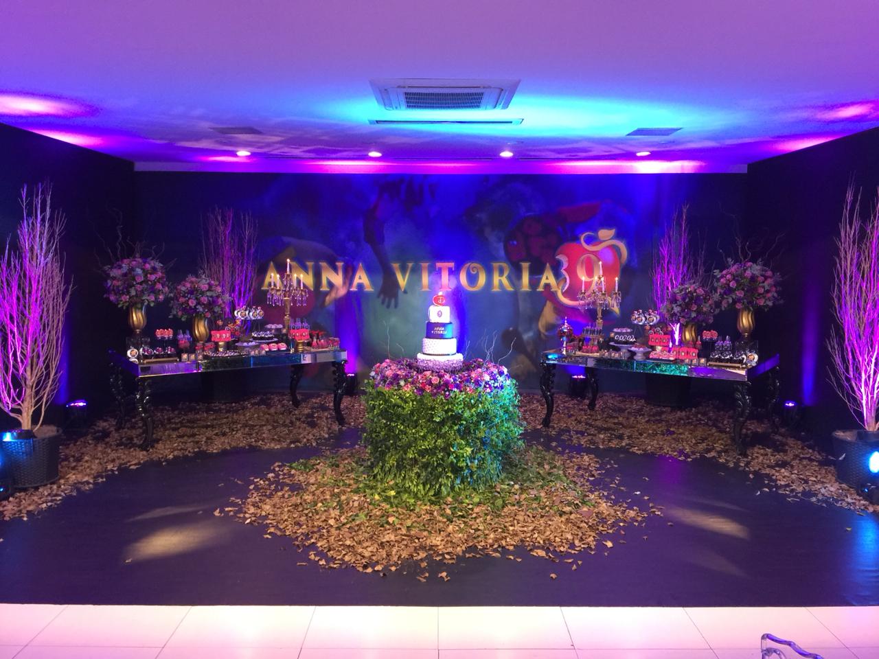 O tema Malévola e os Descendentes traz um toque de mistério e elegância ao universo das festas infantis. Com iluminação roxa, preto e dourado, a decoração cria um clima mágico e sofisticado, remetendo ao mundo encantado das vilãs e heróis da Disney.