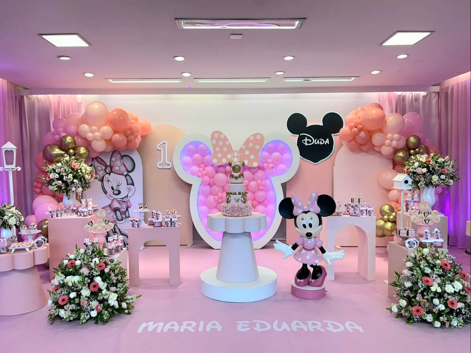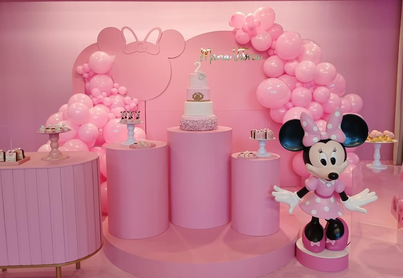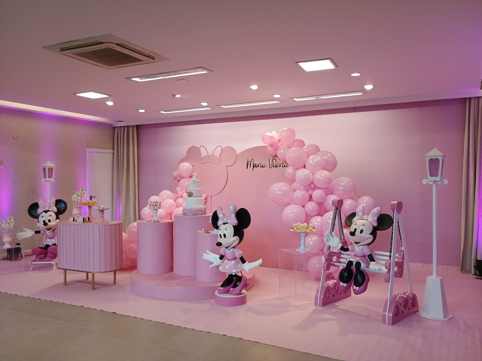 O tema Minnie Rosa Conceitual é a definição de delicadeza moderna! Com uma estética clean e contemporânea, a decoração aposta em diferentes tons de rosa, volumes suaves e elementos minimalistas que destacam o charme da personagem.