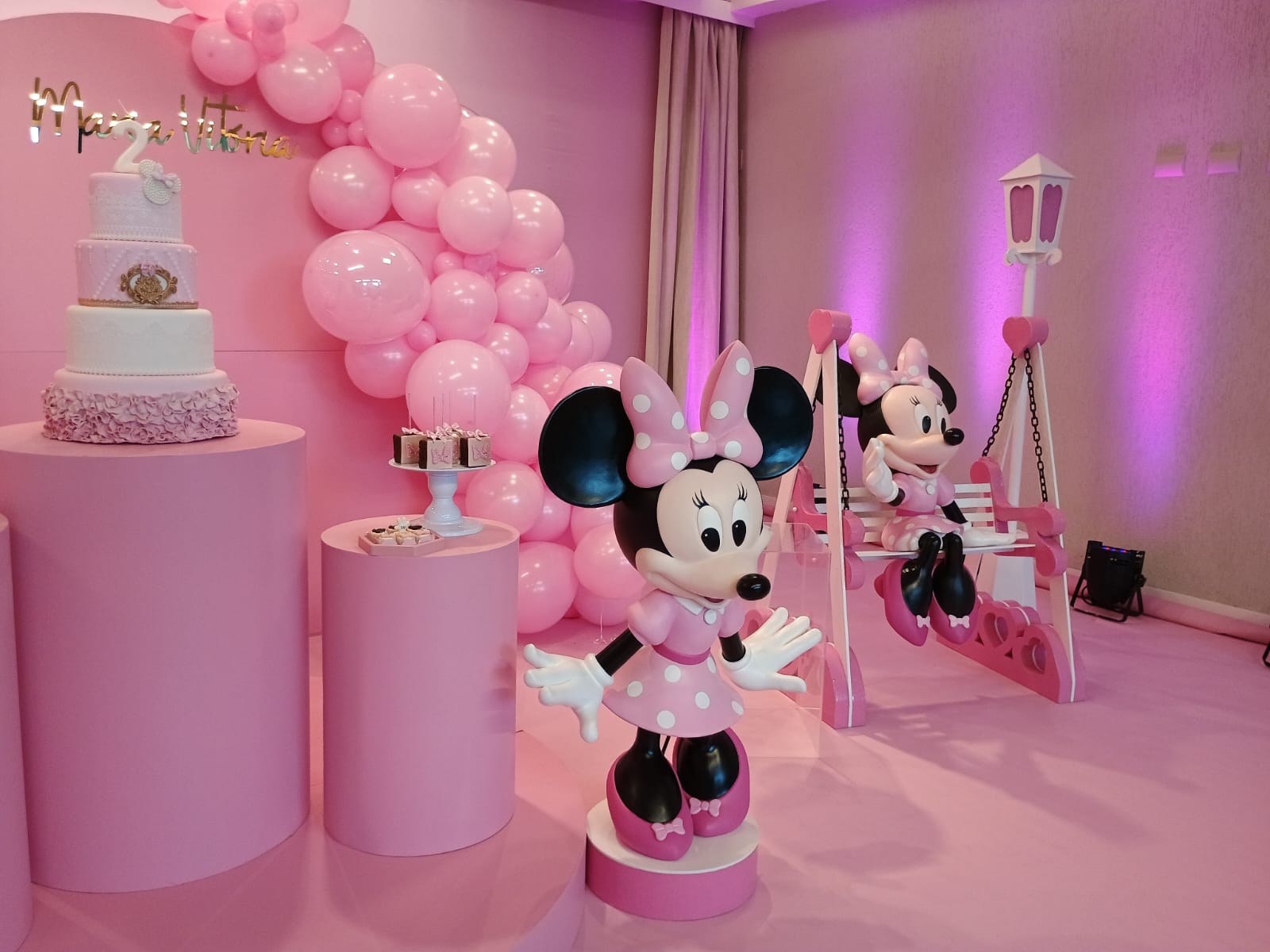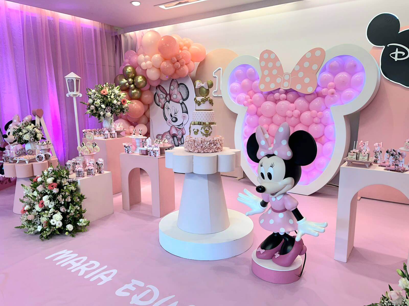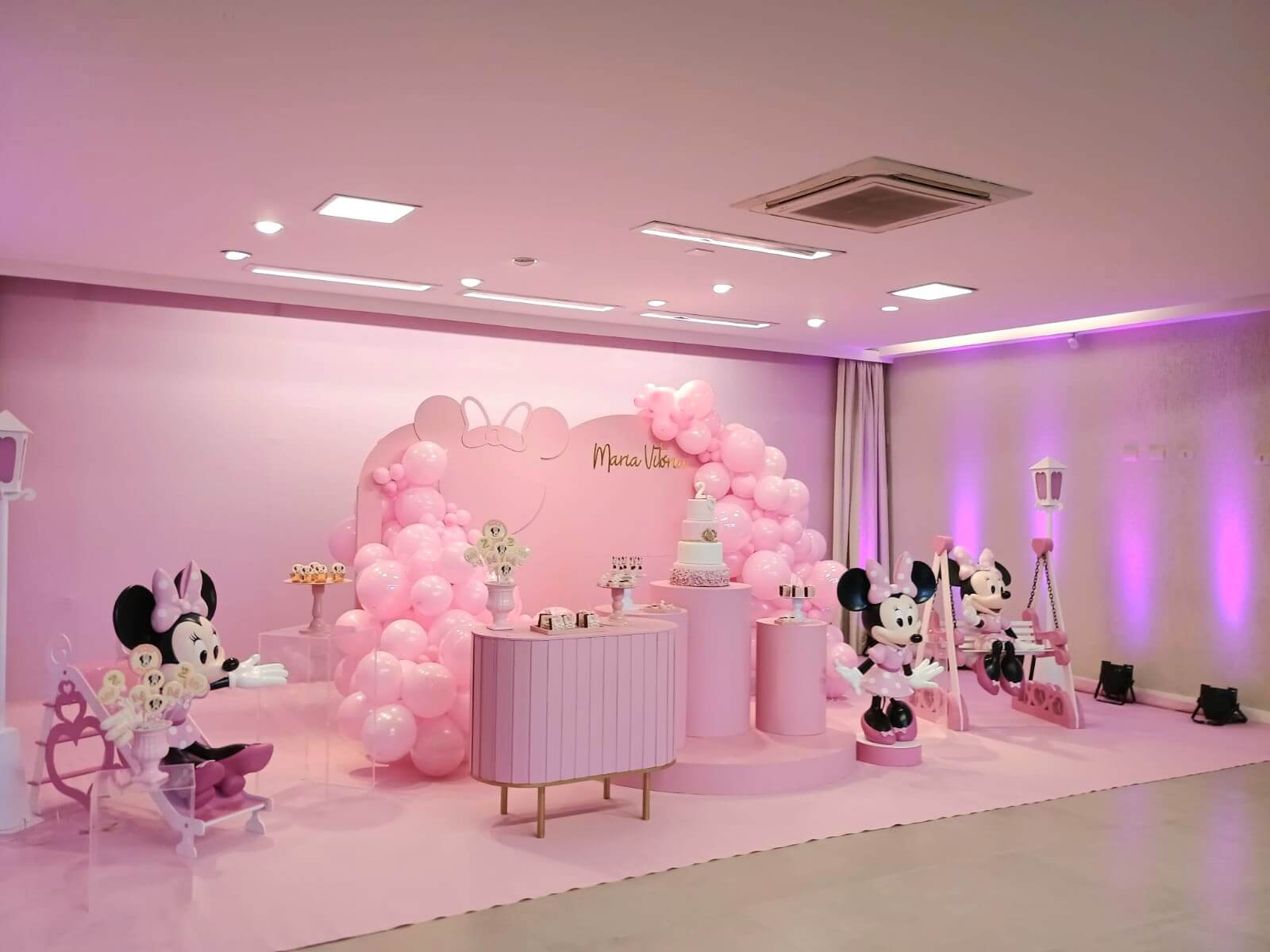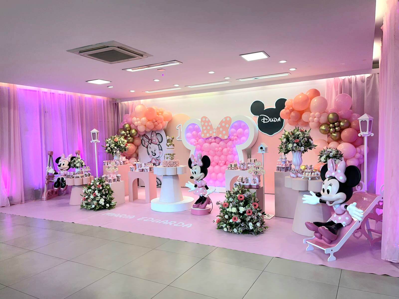 O tema Minnie Rosa Conceitual é a definição de delicadeza moderna! Com uma estética clean e contemporânea, a decoração aposta em diferentes tons de rosa, volumes suaves e elementos minimalistas que destacam o charme da personagem.