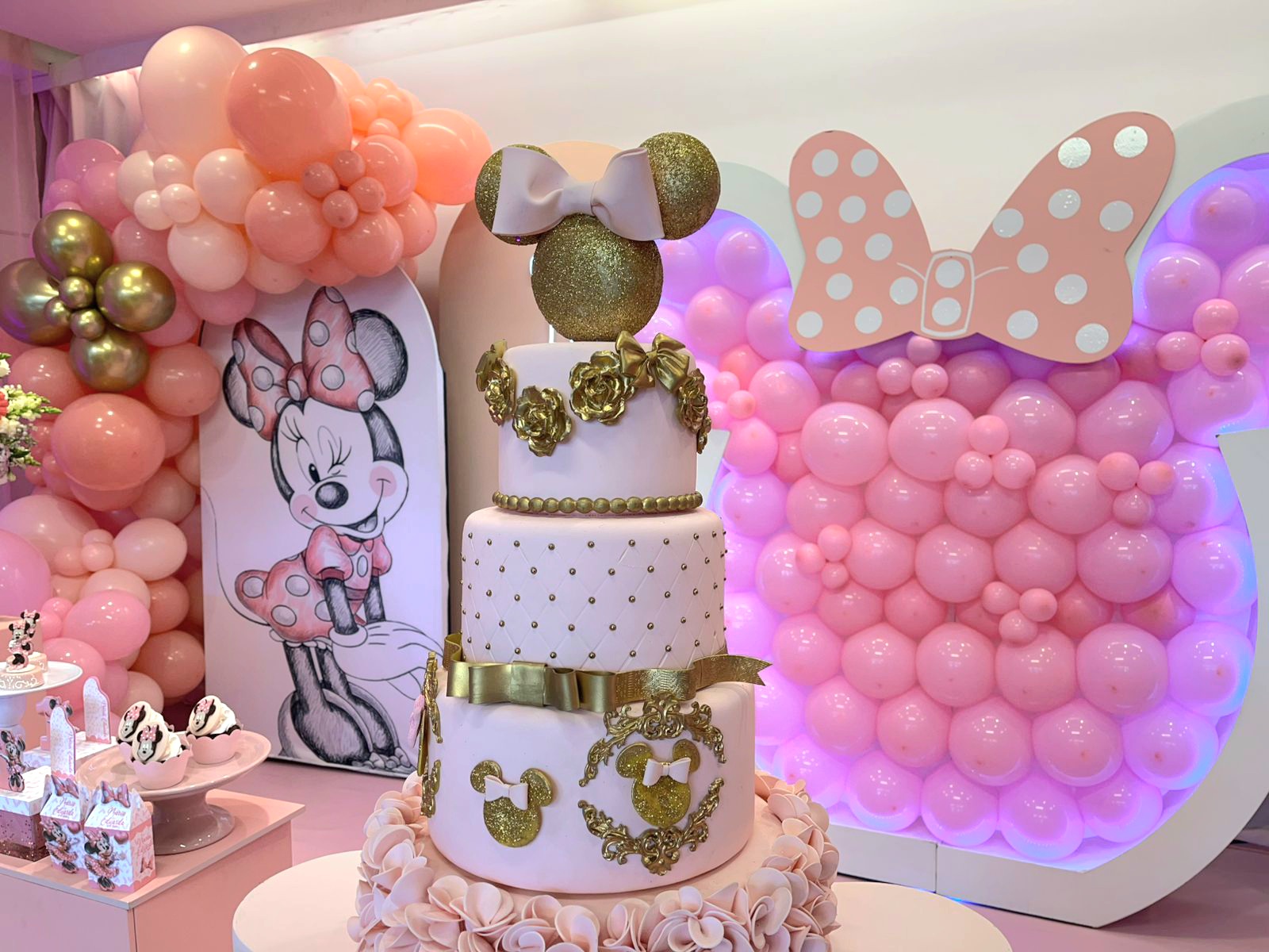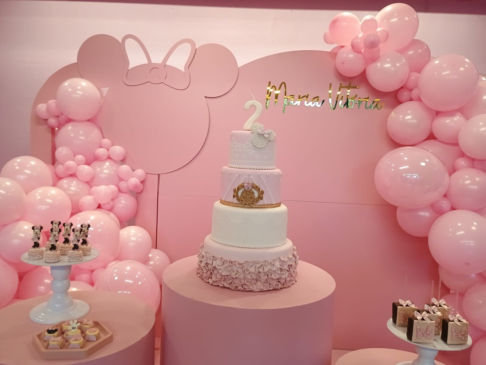 Na produção da Mundo Kids, o cenário ganha vida com balões orgânicos, peças em design arredondado e a presença encantadora da Minnie, perfeita para uma celebração sofisticada, doce e inesquecível.