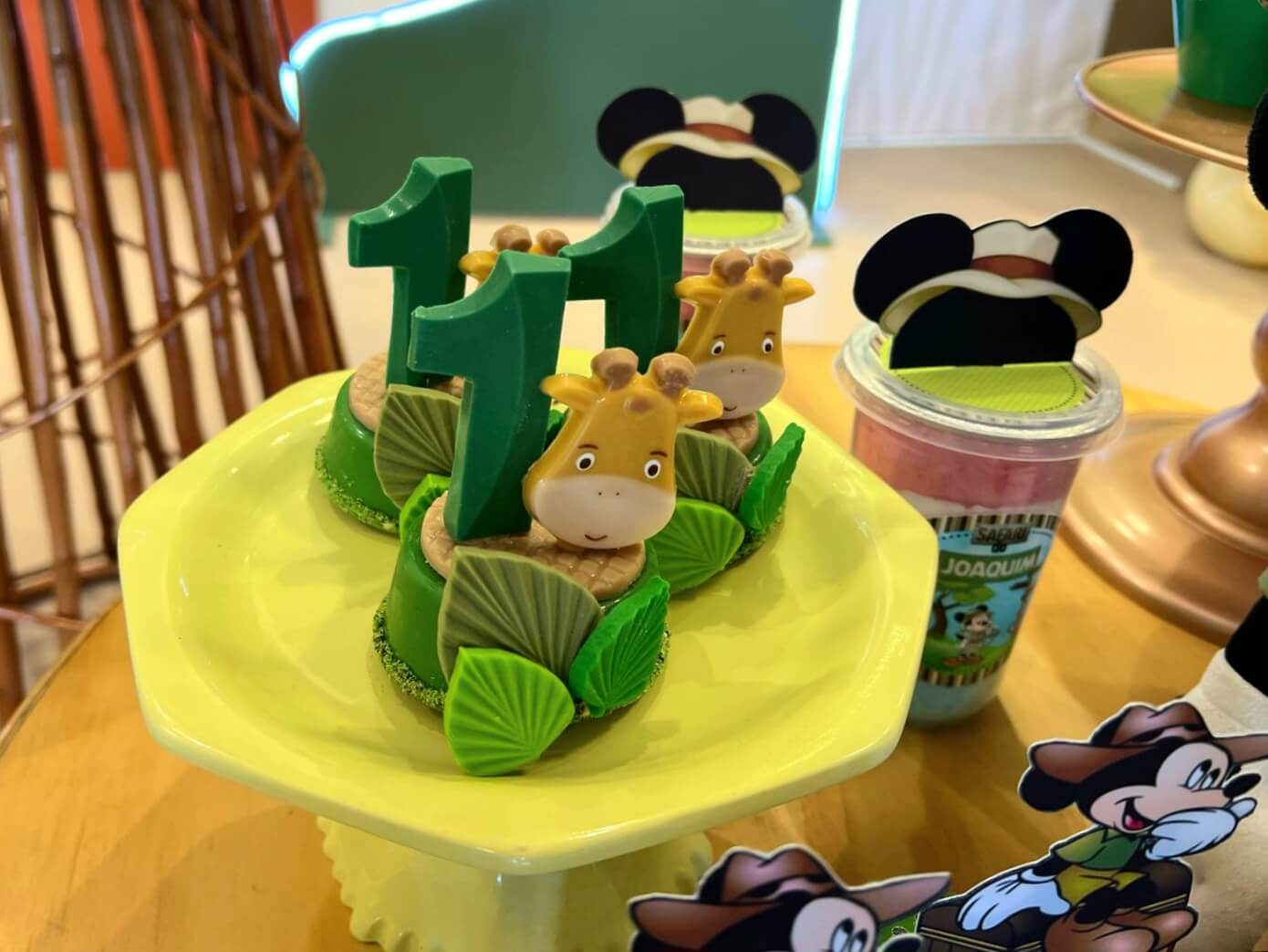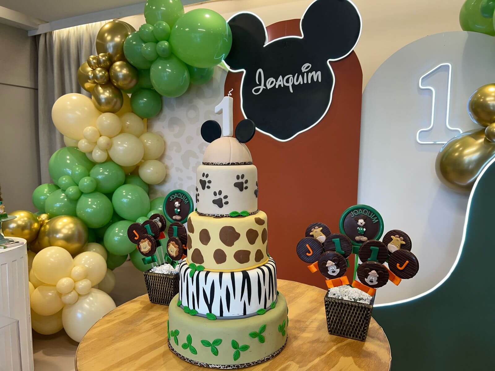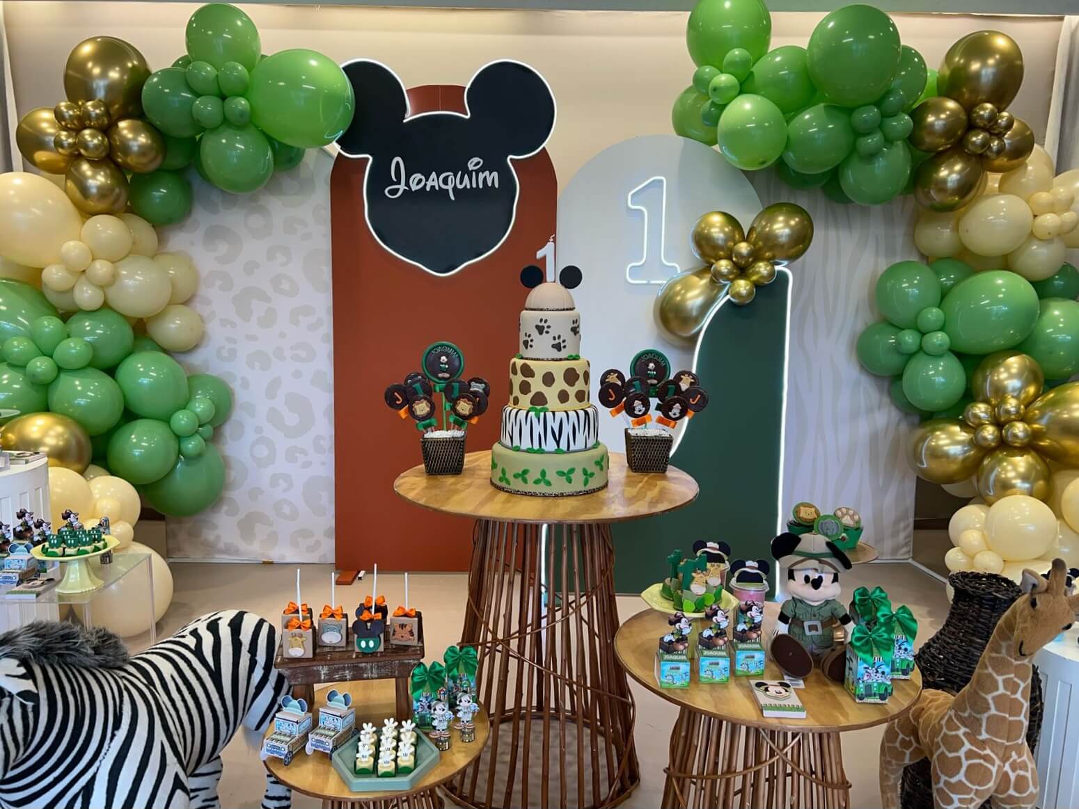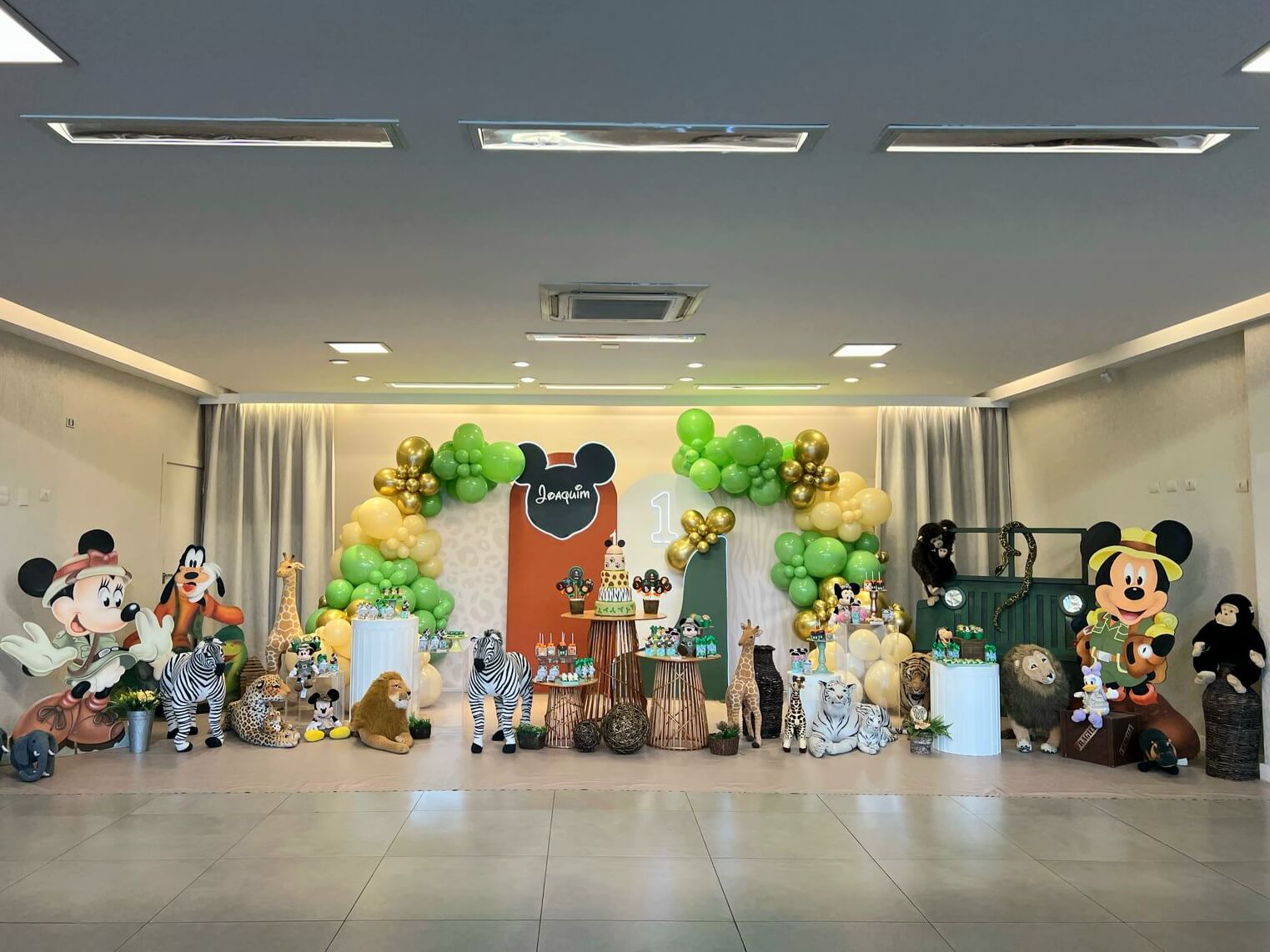 A decoração da Mundo Kids combina o charme do Mickey e sua turma com elementos naturais, balões em tons de verde, bege e dourado, além de animais como leões, girafas e zebras que completam o cenário.