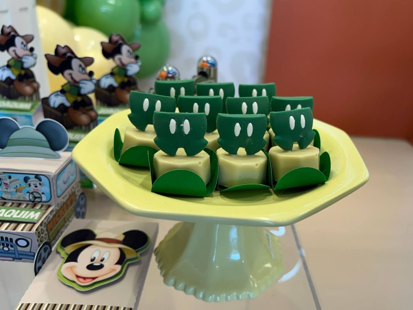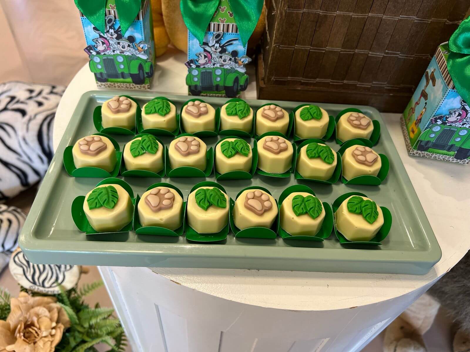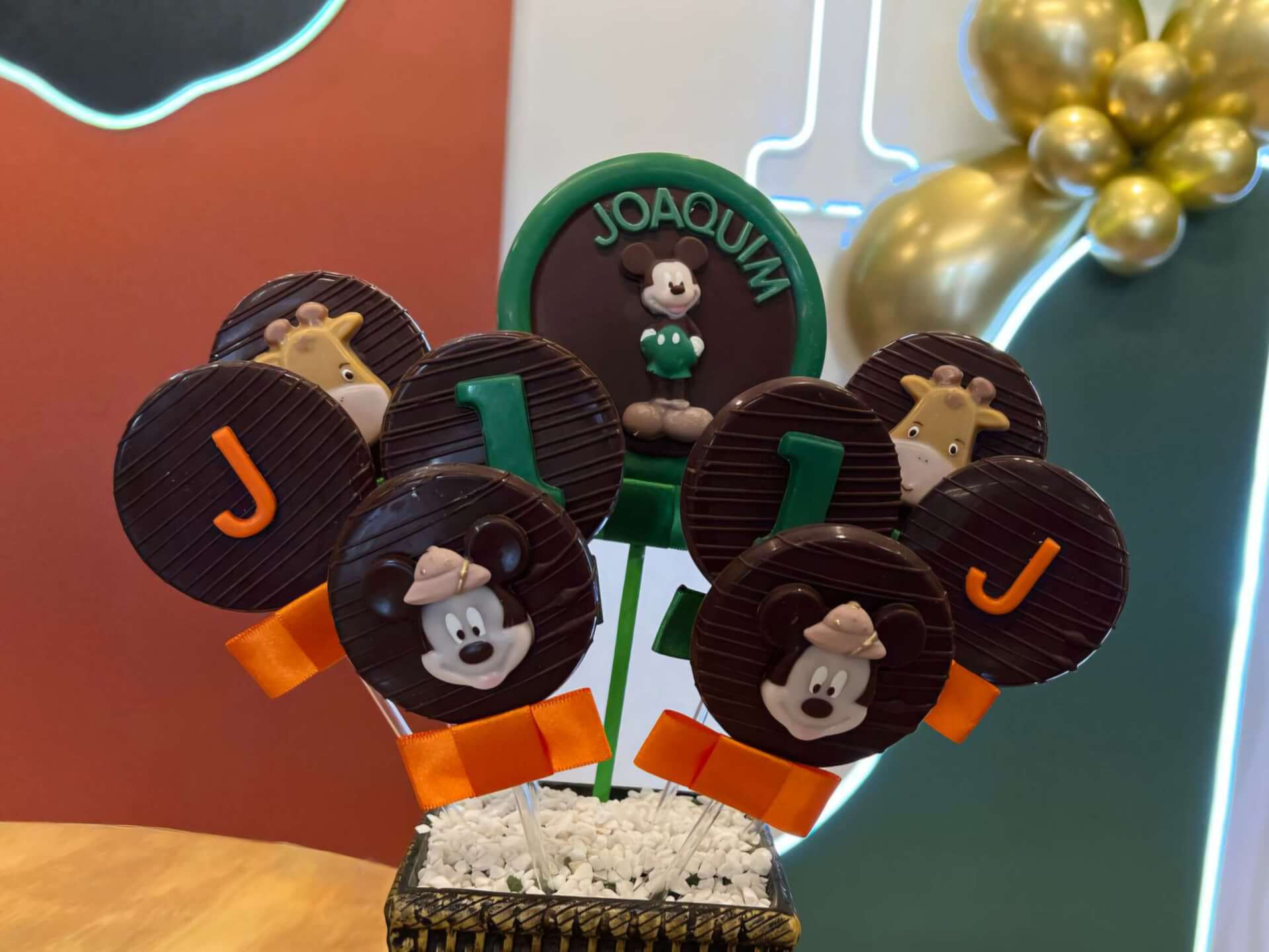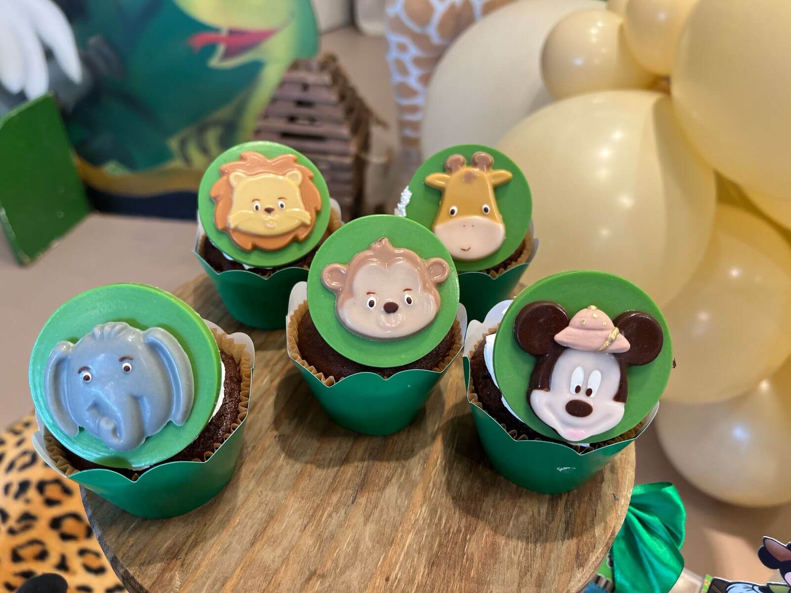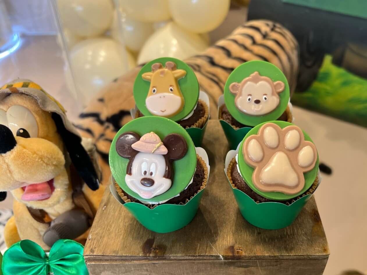 A decoração da Mundo Kids combina o charme do Mickey e sua turma com elementos naturais, balões em tons de verde, bege e dourado, além de animais como leões, girafas e zebras que completam o cenário.