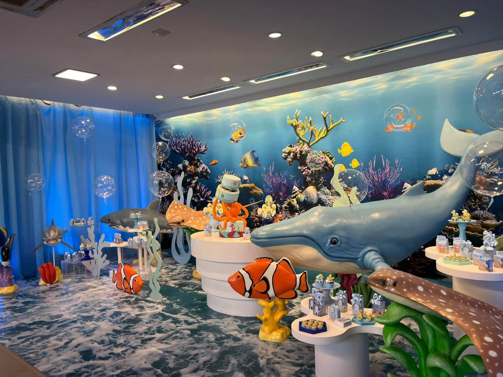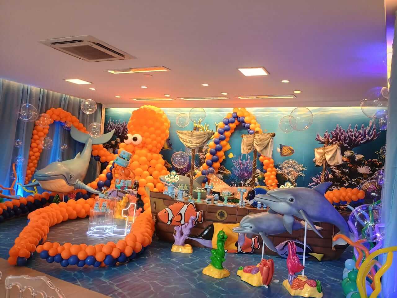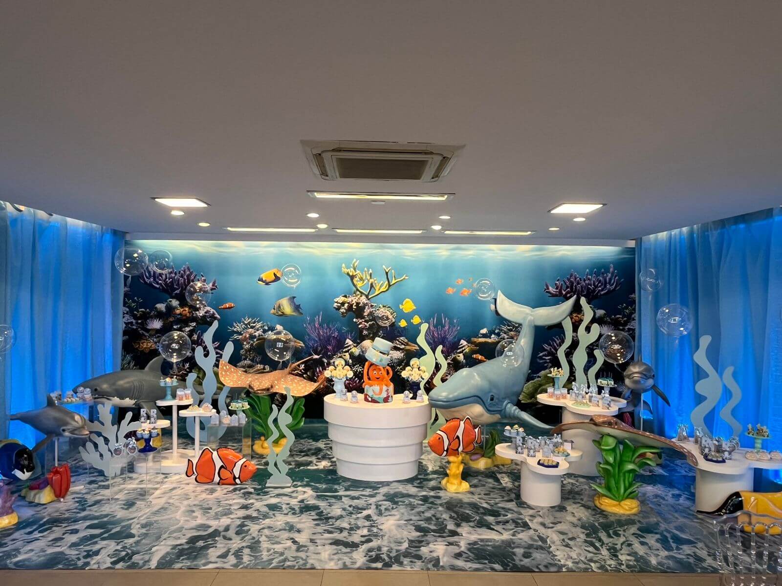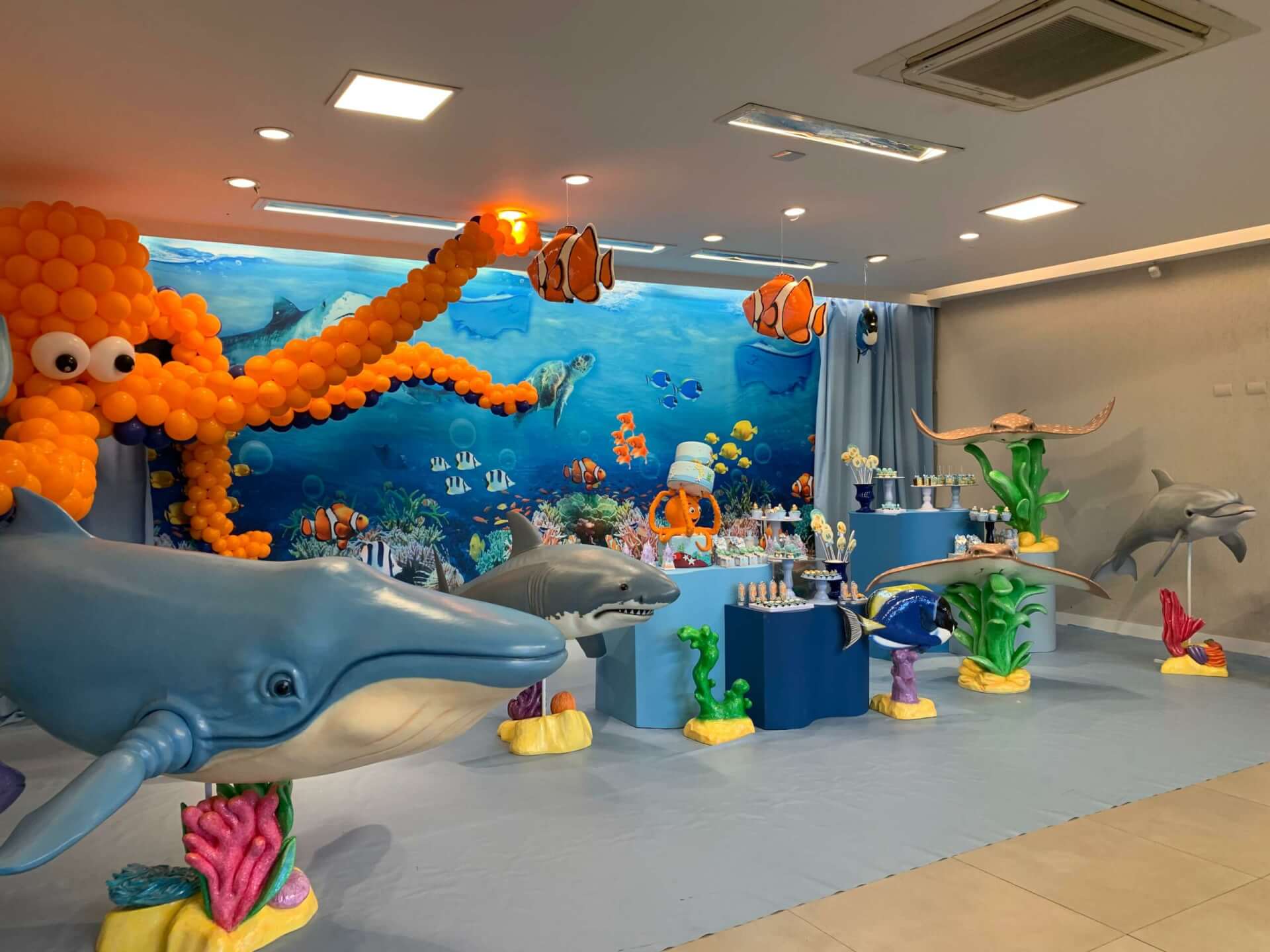 Com tons de azul, laranja e lilás, o espaço é perfeito para festas cheias de cor, alegria e fantasia, remetendo à magia do fundo do mar de forma lúdica e encantadora.
