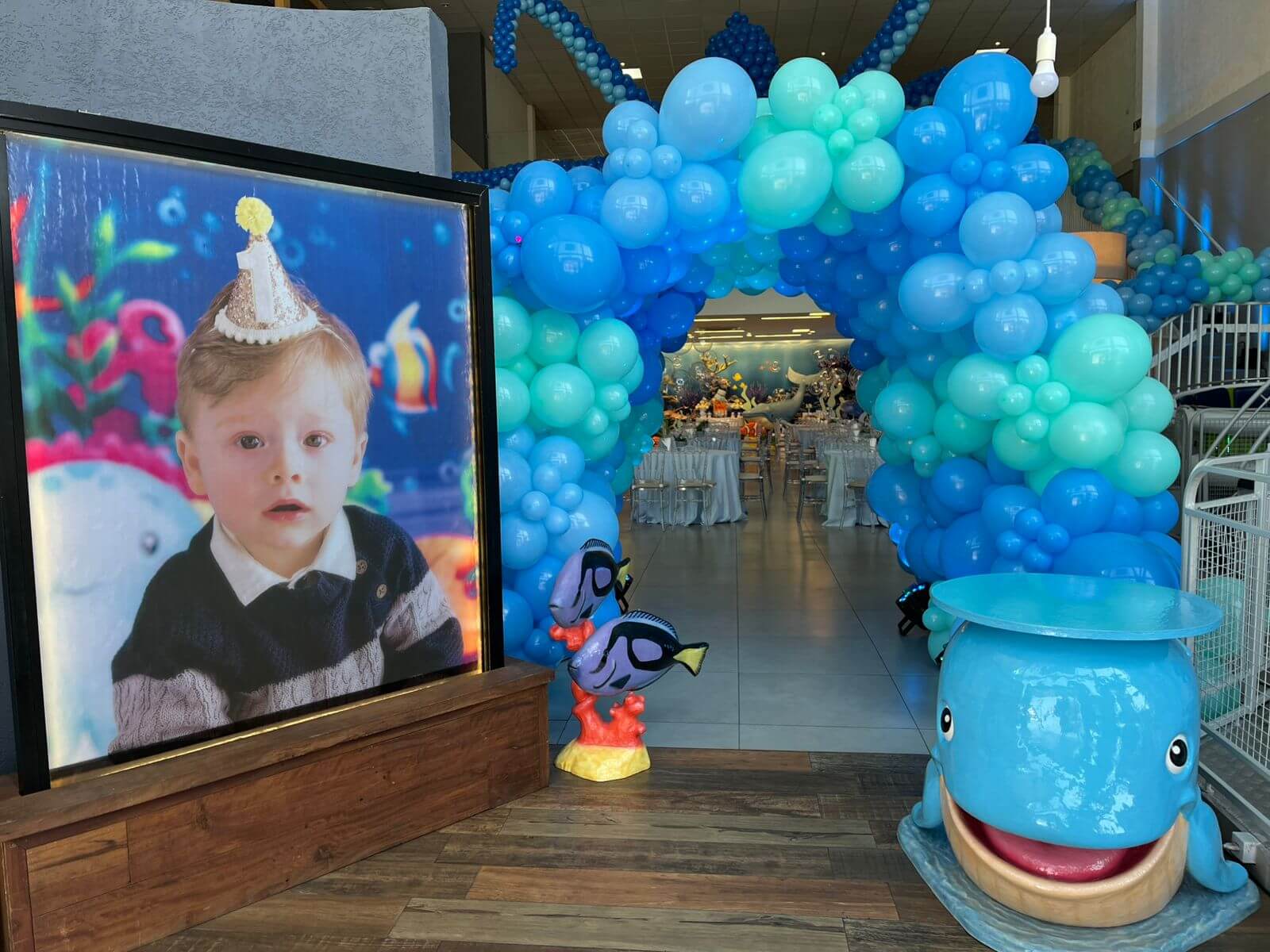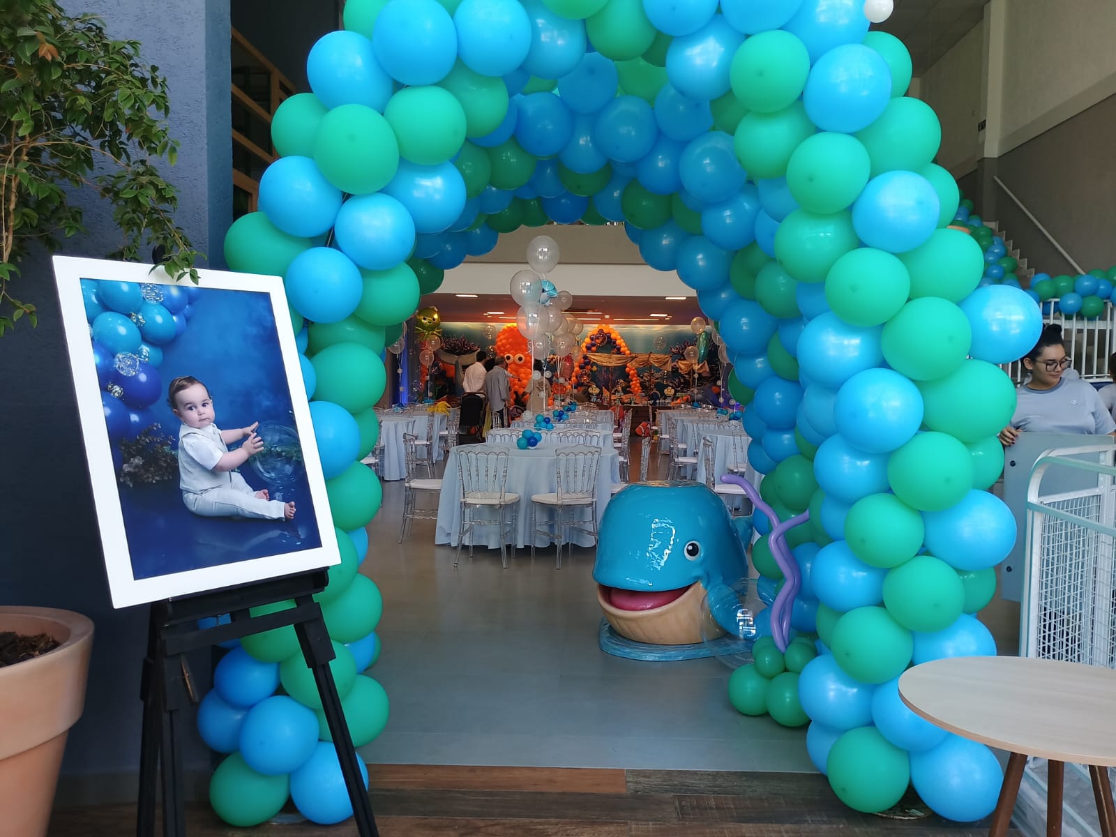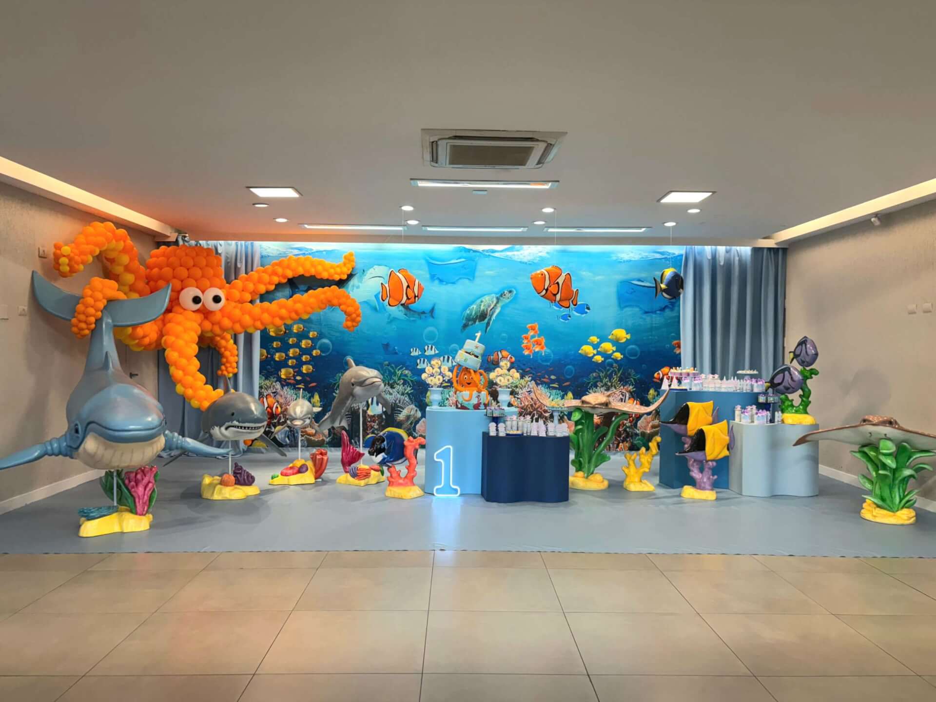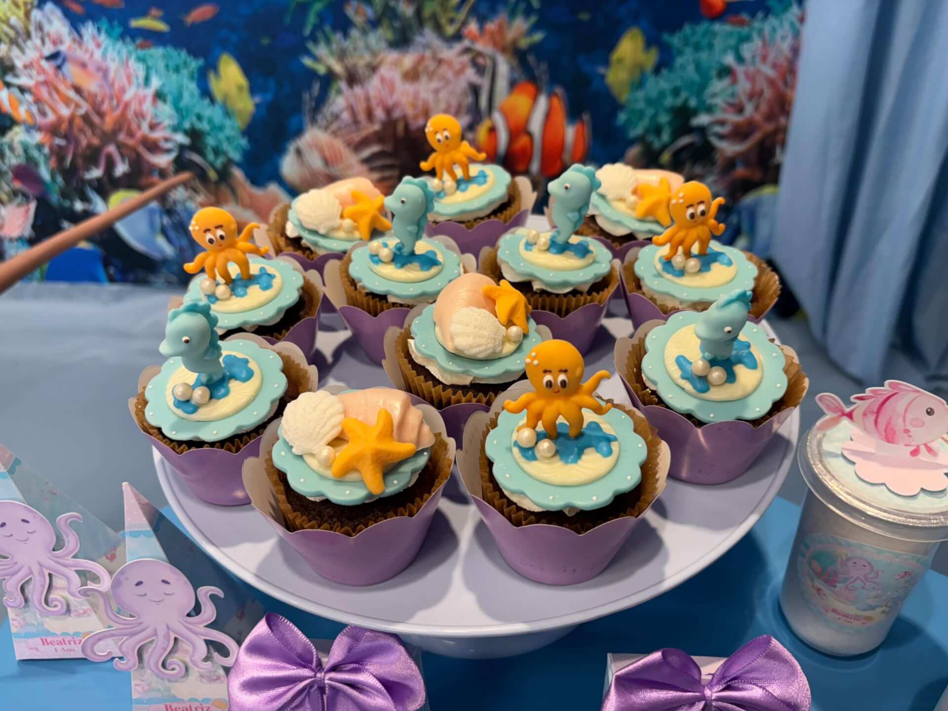 Com tons de azul, laranja e lilás, o espaço é perfeito para festas cheias de cor, alegria e fantasia, remetendo à magia do fundo do mar de forma lúdica e encantadora.
