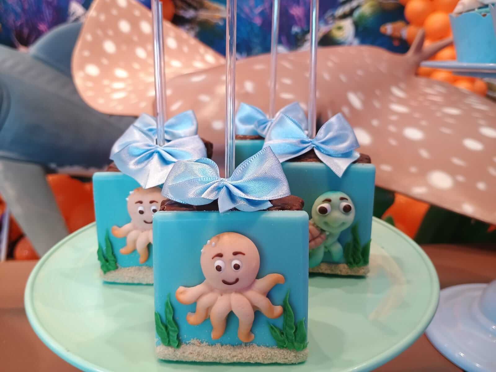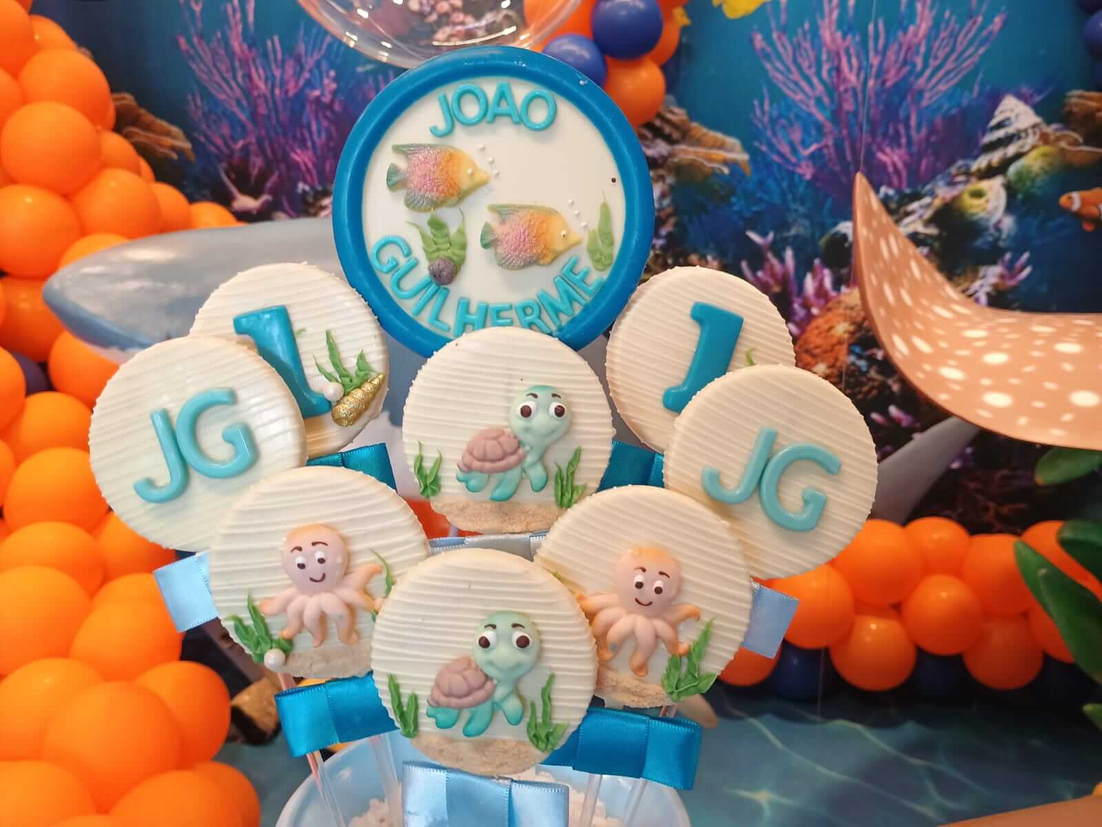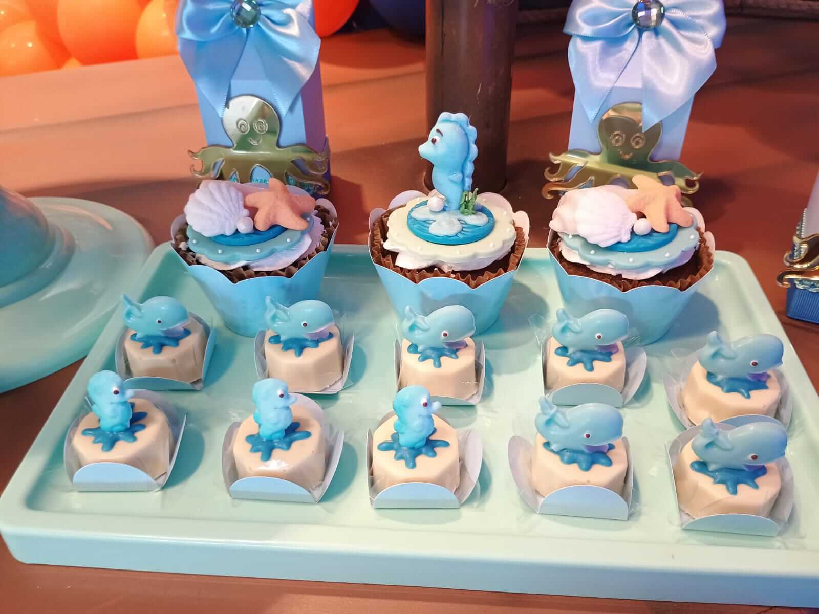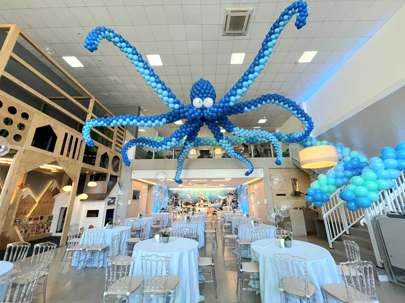 O tema O Polvo e o Fundo do Mar transforma o ambiente em um verdadeiro mergulho pelas profundezas oceânicas. A decoração da Mundo Kids combina elementos marinhos como golfinhos, corais, peixes tropicais e um grande polvo laranja que domina o cenário, criando um visual vibrante e imersivo.