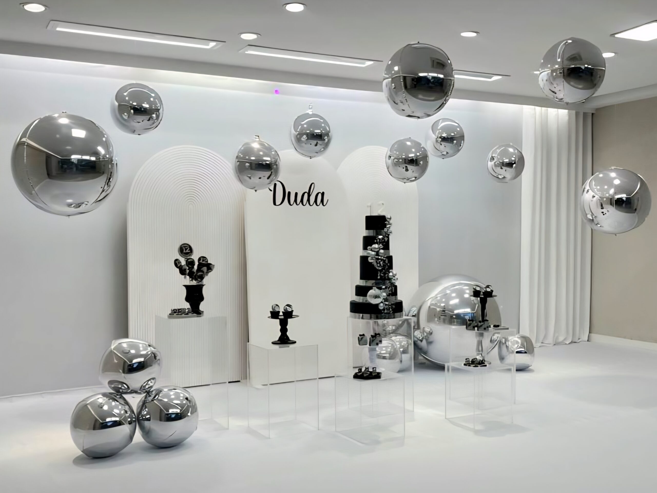 A decoração aposta em elementos esculturais, balões metalizados, bases translúcidas e uma paleta monocromática cuidadosamente equilibrada. Desenvolvida pela equipe de Party Designers & Event Planners do Mundo Kids, a montagem autoral explora design, precisão e requinte, criando uma experiência visual única e uma memória inesquecível para toda a família.