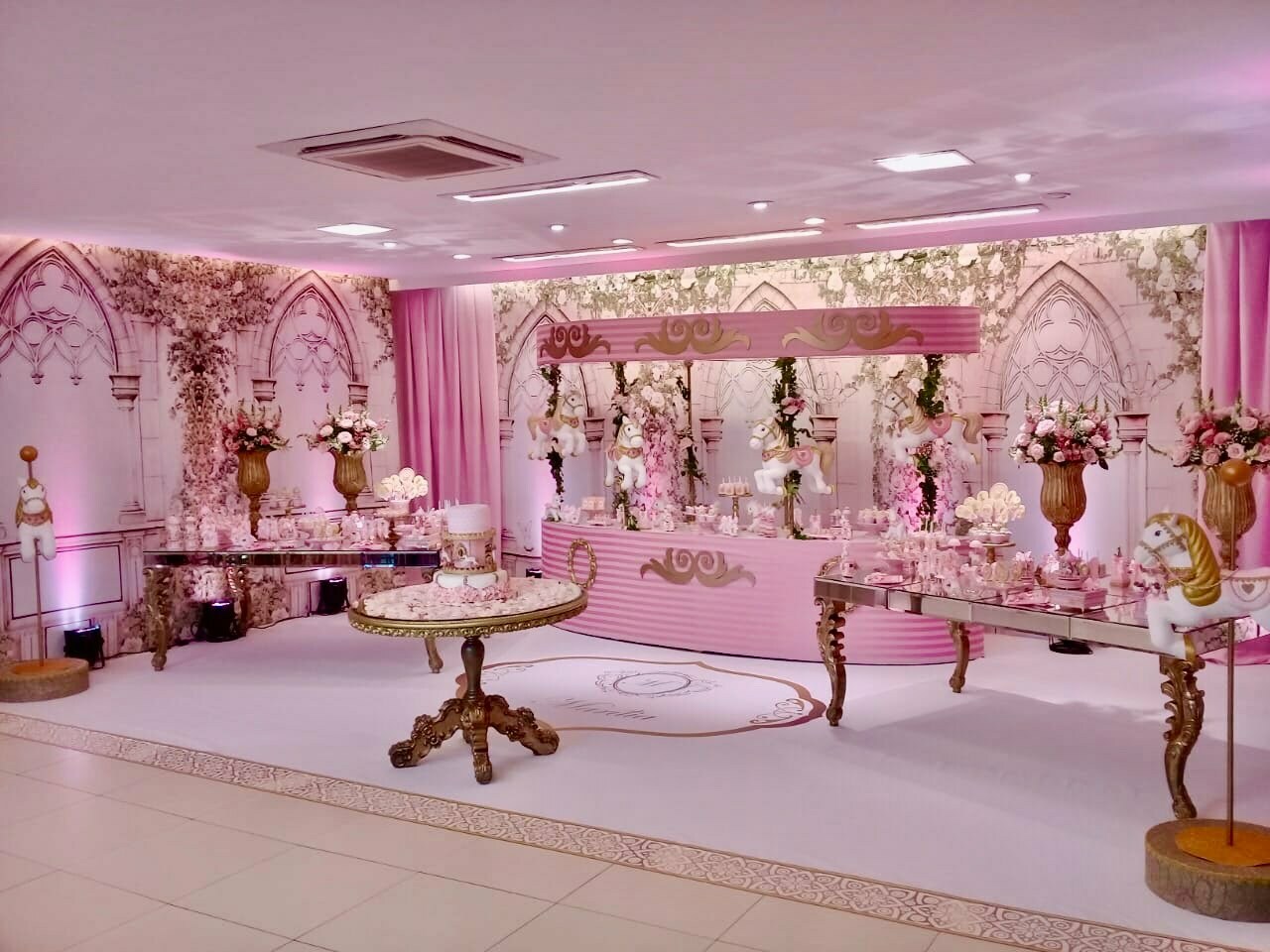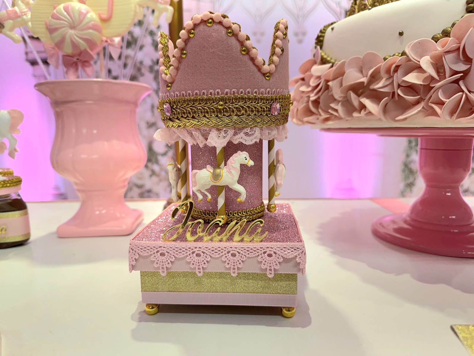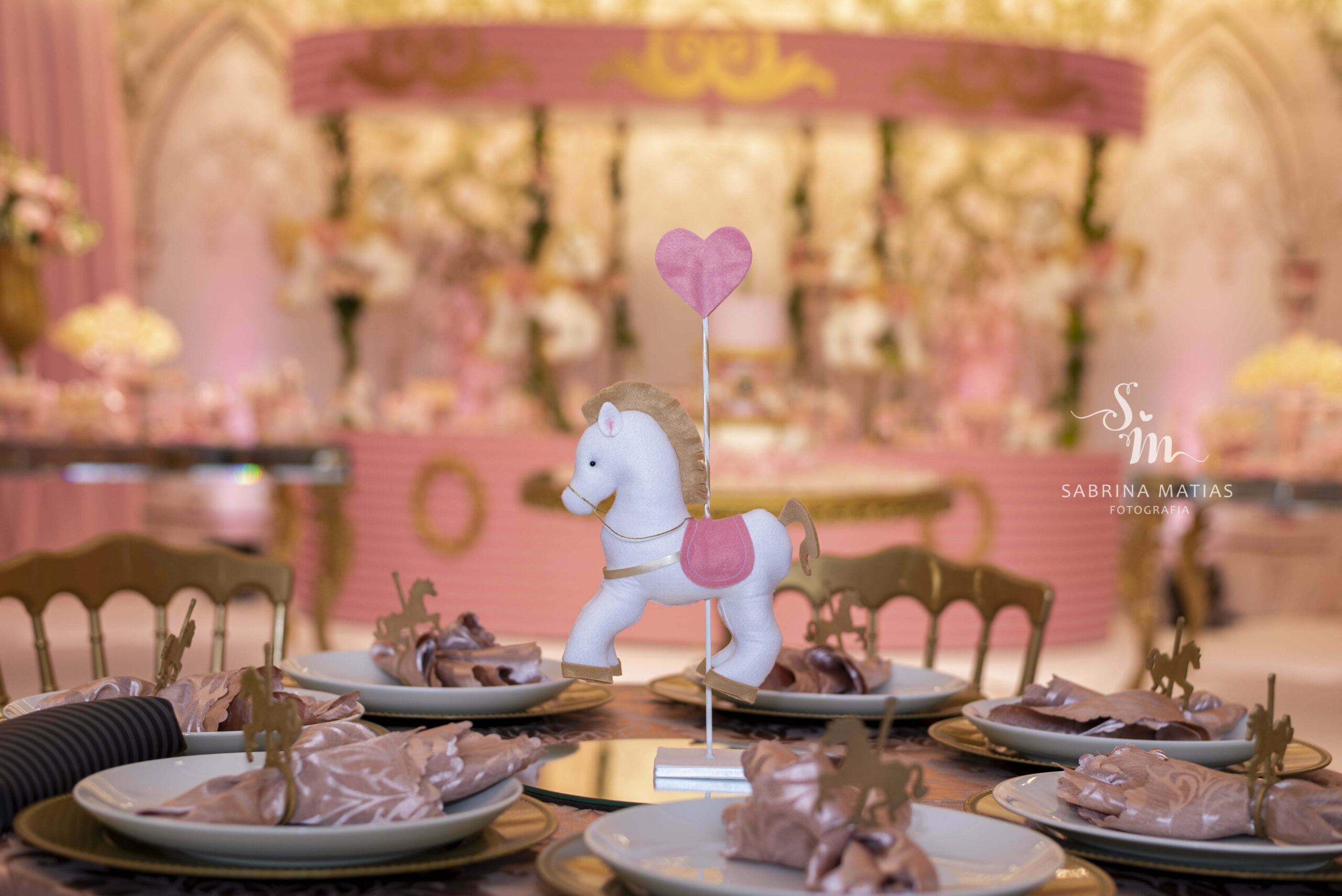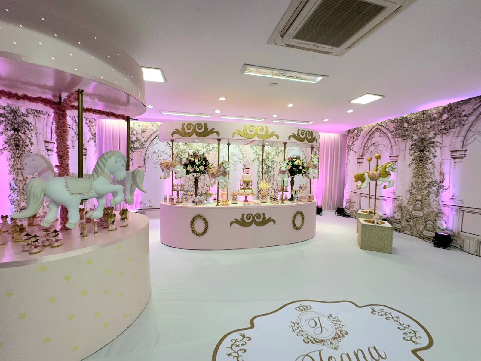 O tema Royal Carrossel é pura elegância e encanto, com tons de rosa, dourado e branco que remetem à delicadeza dos clássicos contos de fadas. Cada detalhe da decoração foi pensado para criar uma atmosfera mágica e sofisticada, com cavalinhos e ornamentos dourados que encantam crianças e adultos.