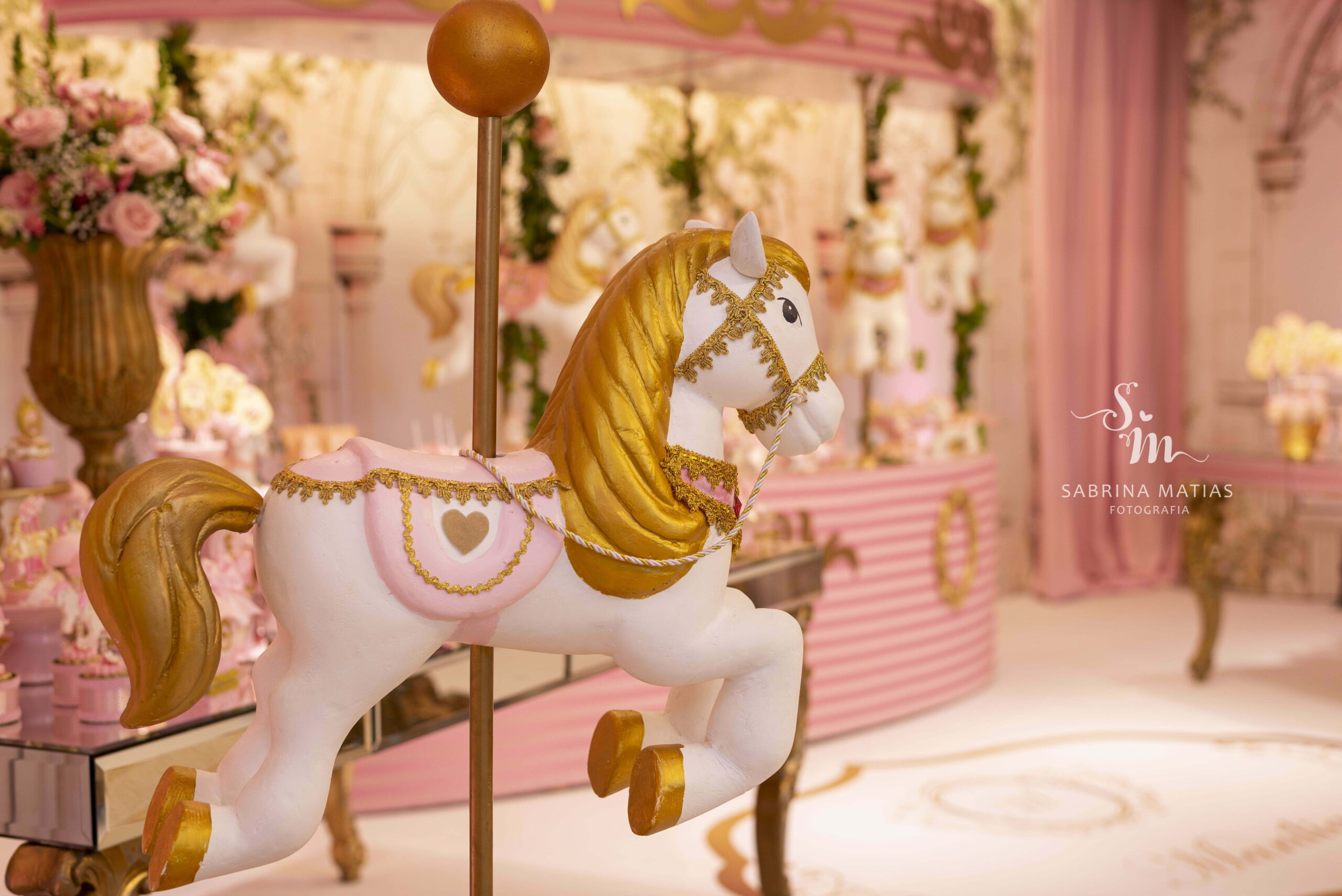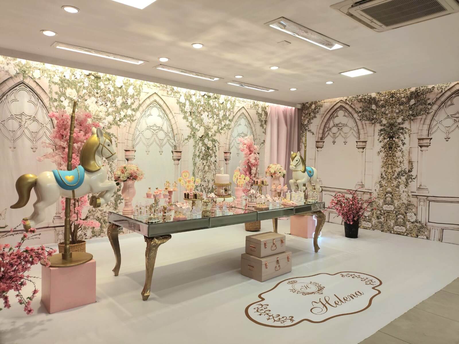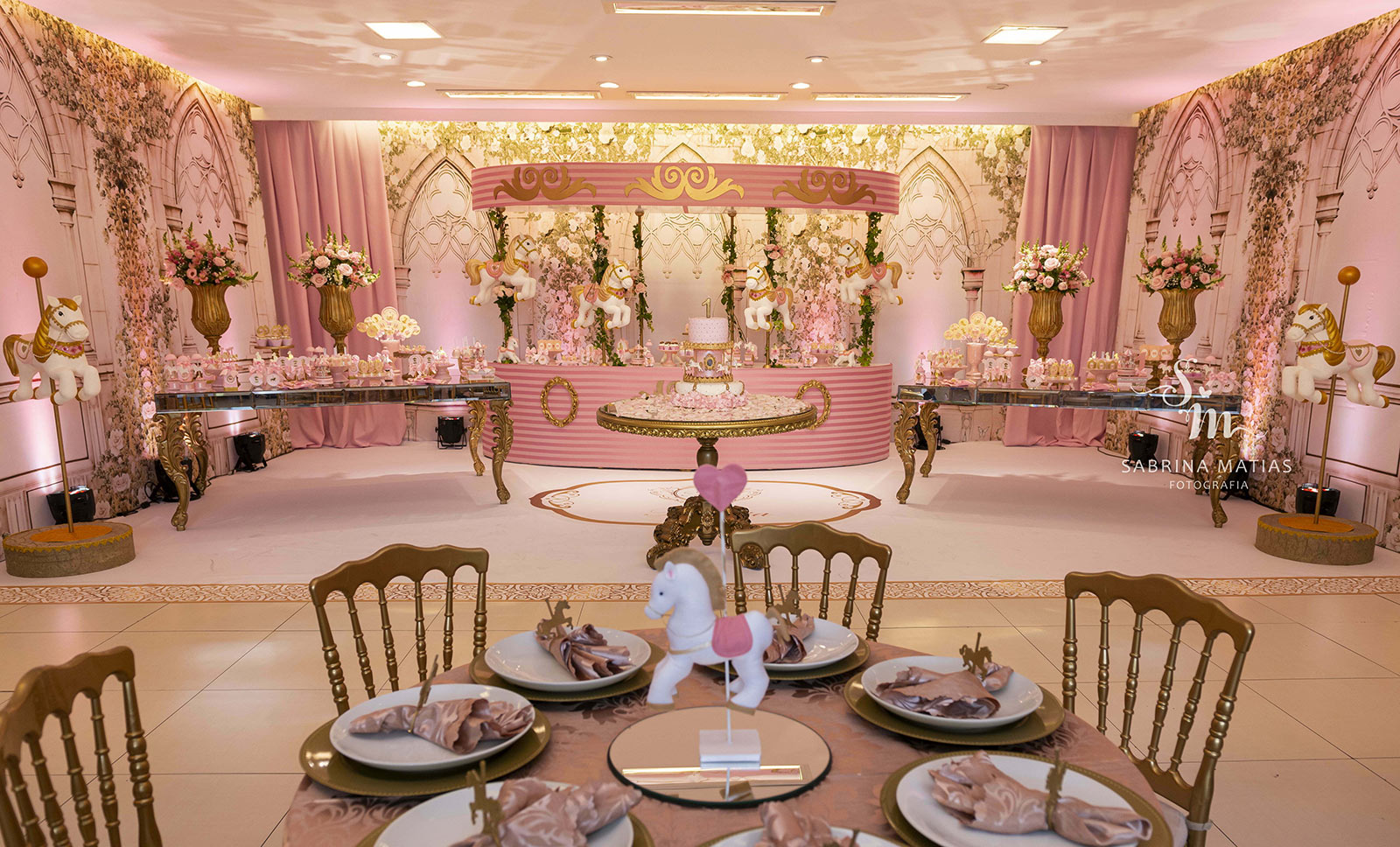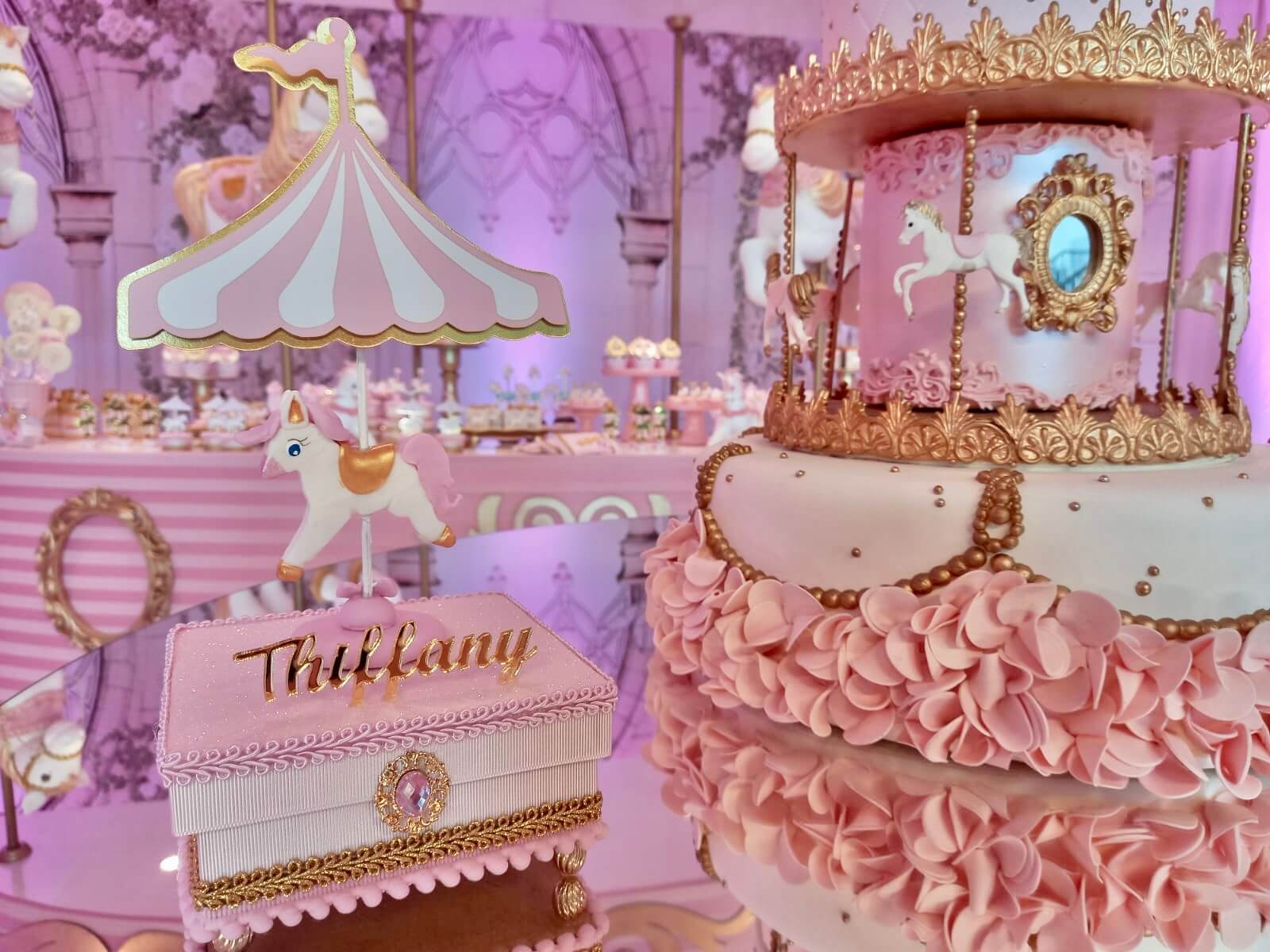 O tema Royal Carrossel é pura elegância e encanto, com tons de rosa, dourado e branco que remetem à delicadeza dos clássicos contos de fadas. Cada detalhe da decoração foi pensado para criar uma atmosfera mágica e sofisticada, com cavalinhos e ornamentos dourados que encantam crianças e adultos.