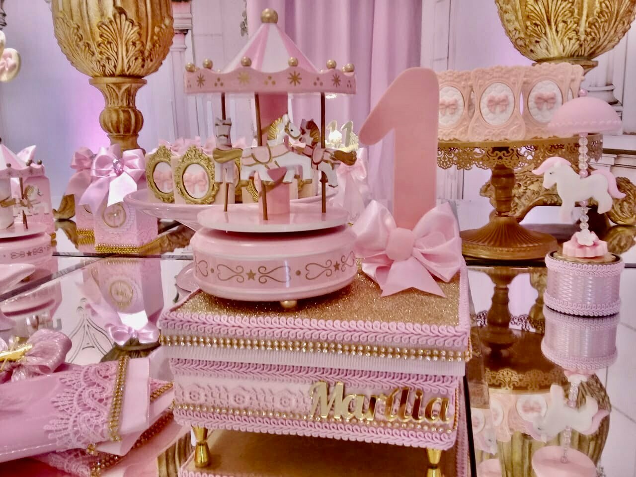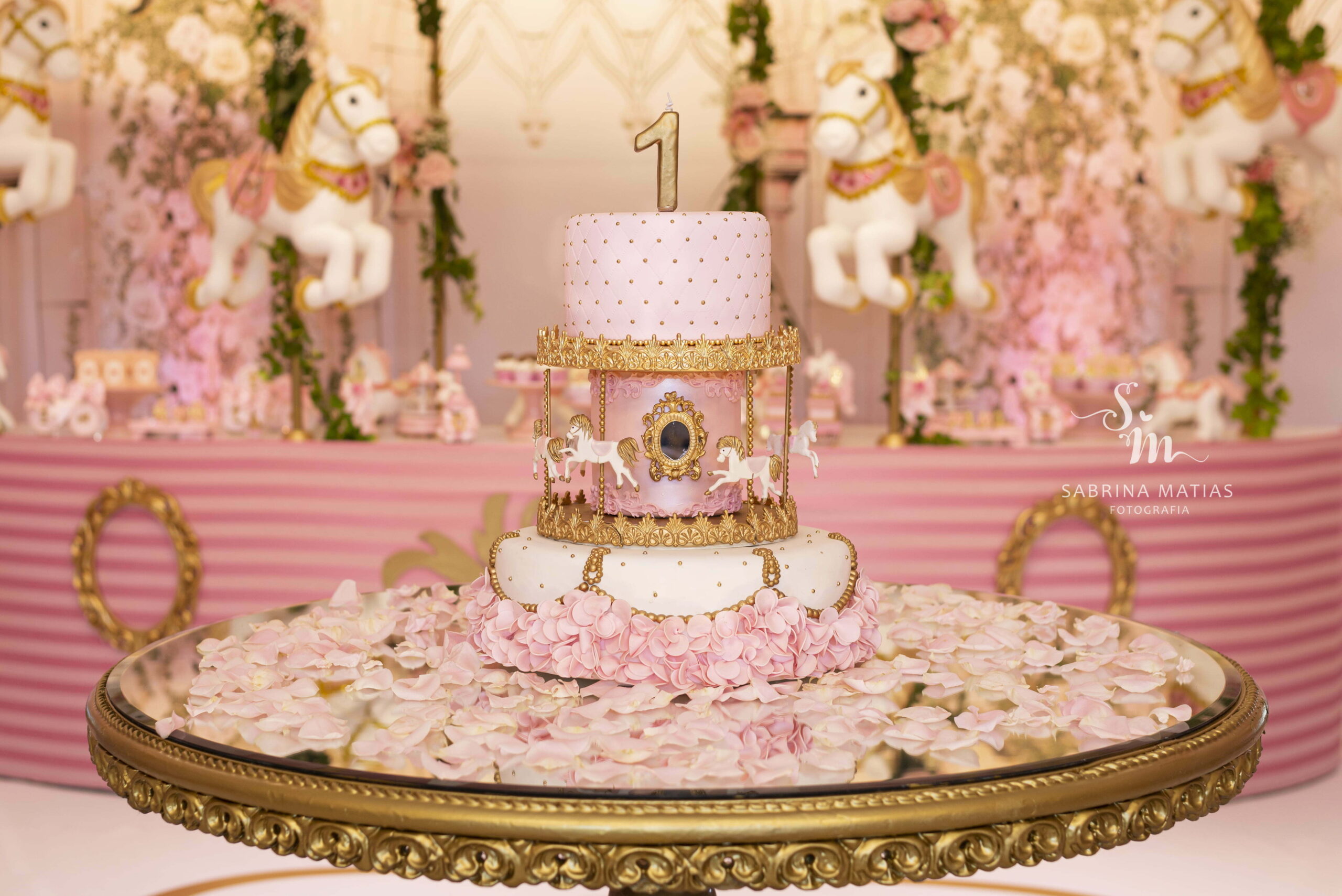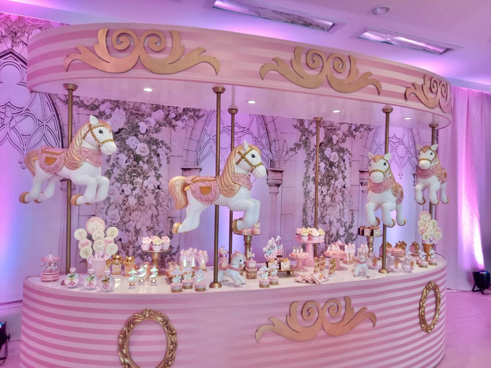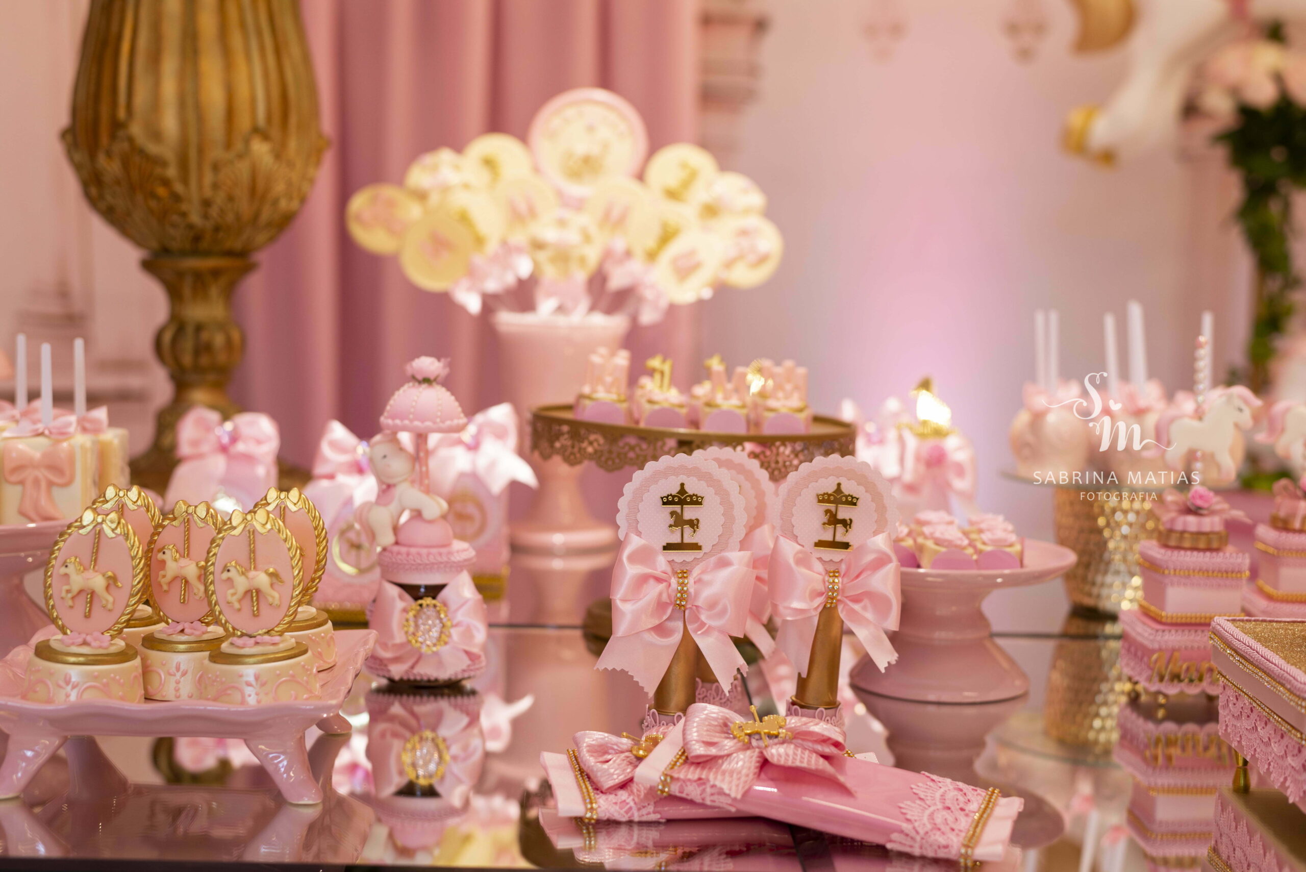 O tema Royal Carrossel é pura elegância e encanto, com tons de rosa, dourado e branco que remetem à delicadeza dos clássicos contos de fadas. Cada detalhe da decoração foi pensado para criar uma atmosfera mágica e sofisticada, com cavalinhos e ornamentos dourados que encantam crianças e adultos.