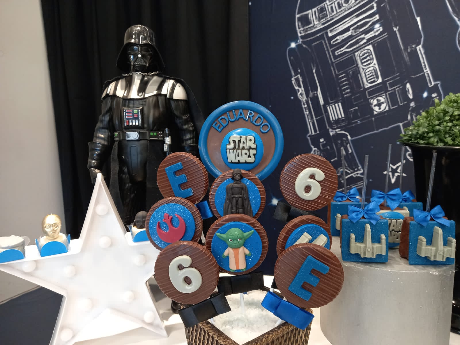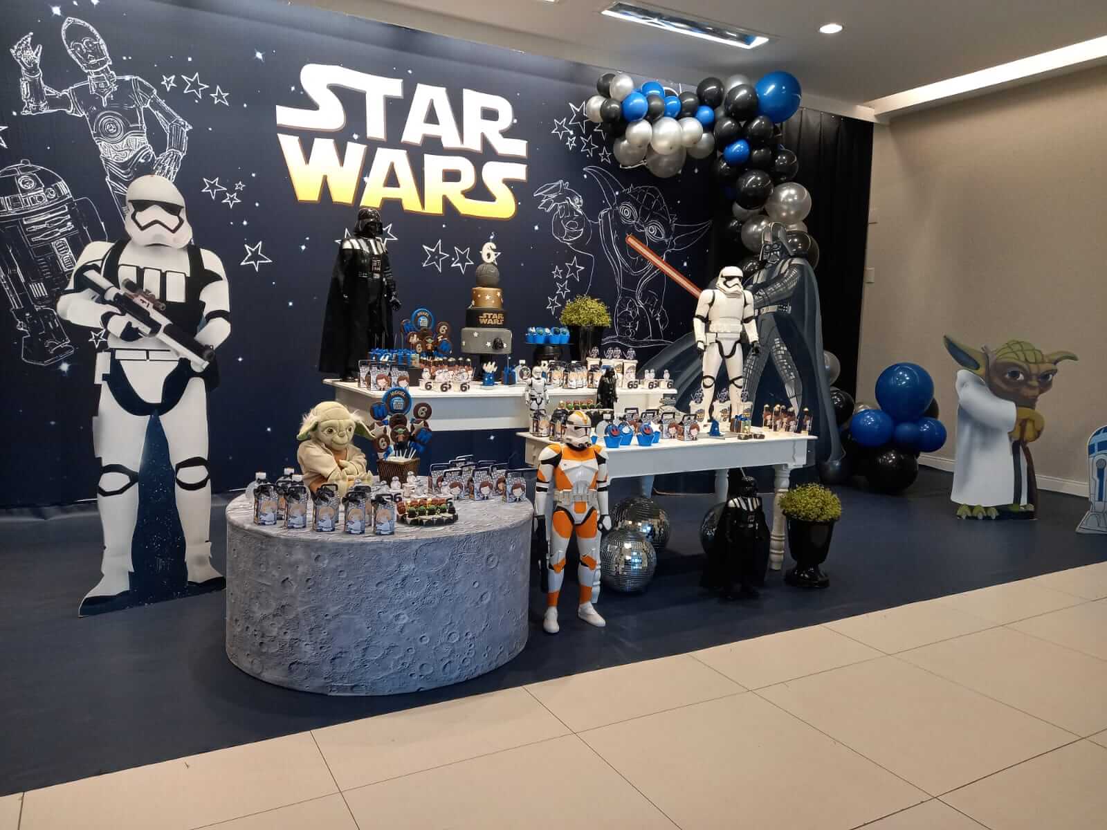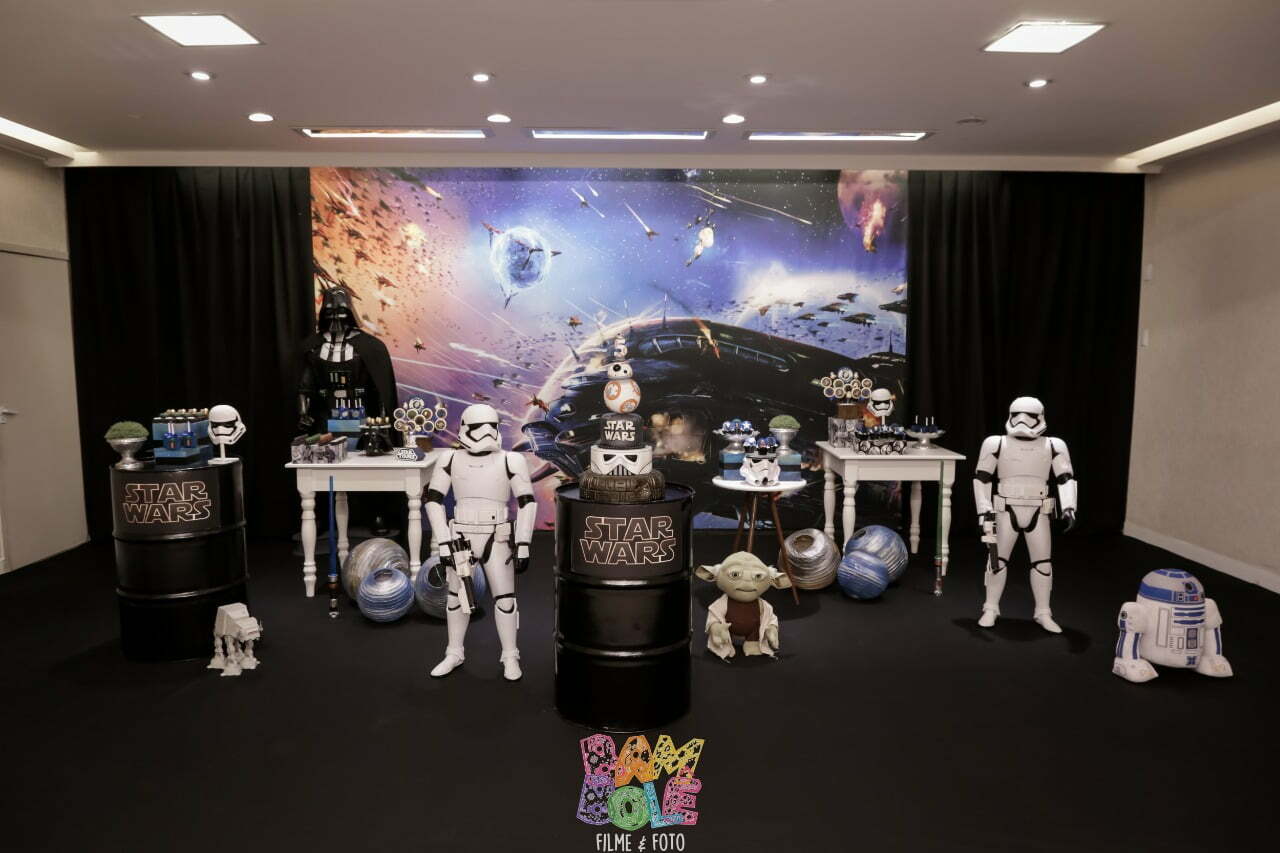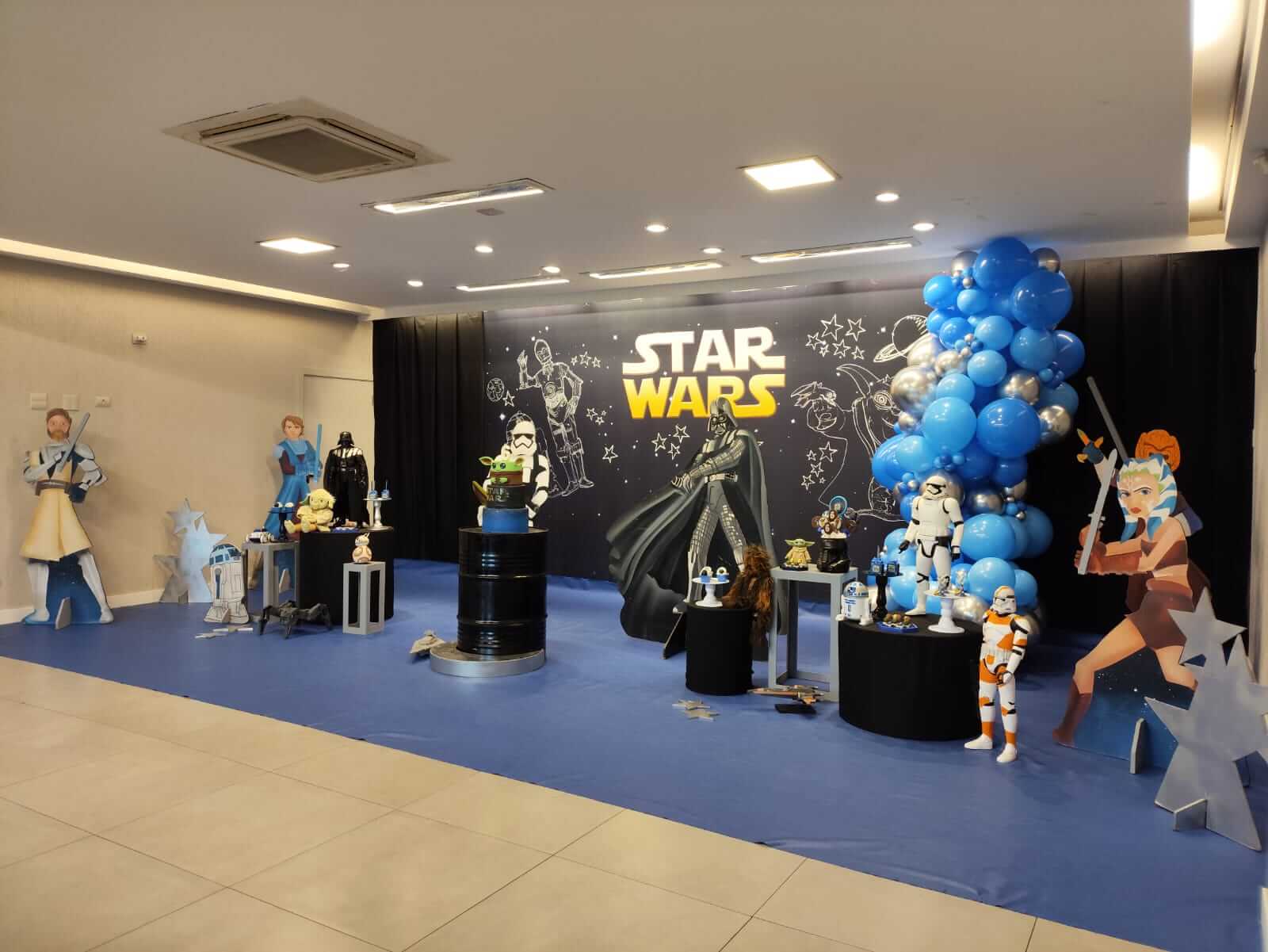 O tema Star Wars transforma a festa em uma verdadeira galáxia cheia de aventuras e efeitos impressionantes. Com cenário espacial, naves, planetas e os icônicos personagens da saga, cada detalhe convida os convidados a embarcar nessa jornada pelo universo.