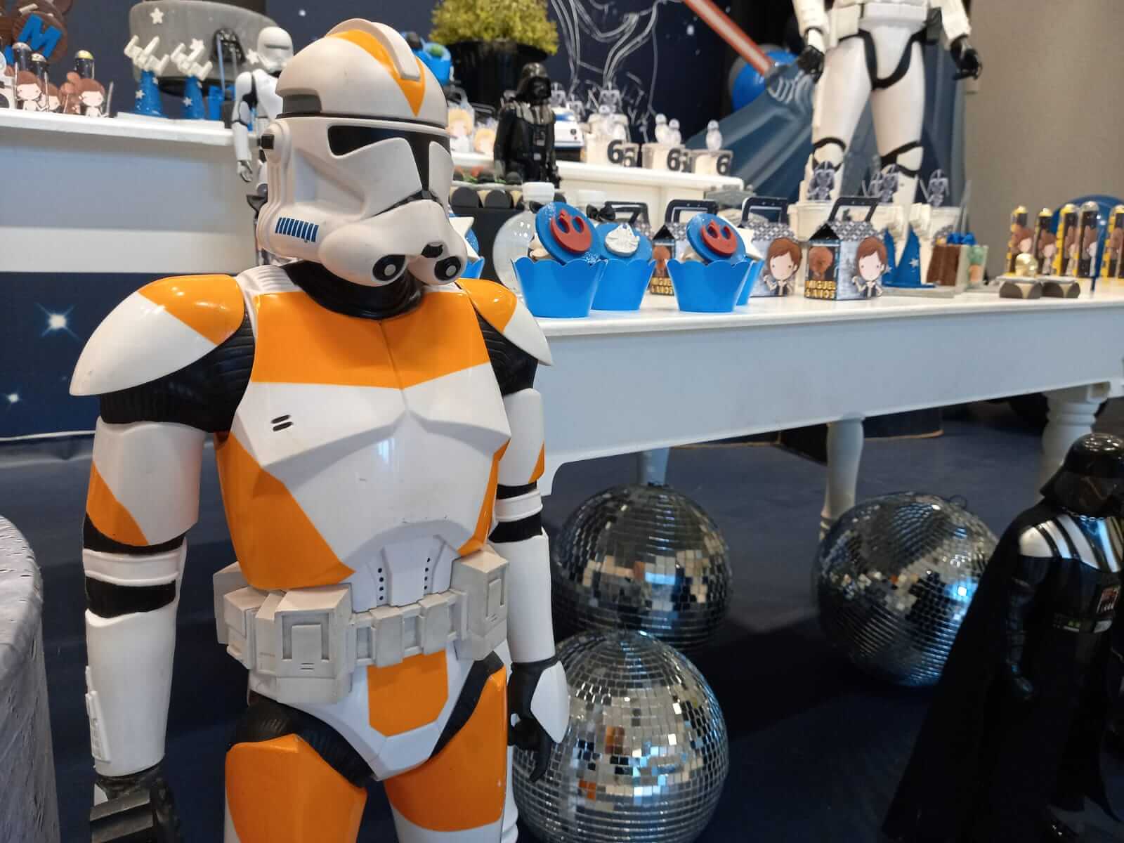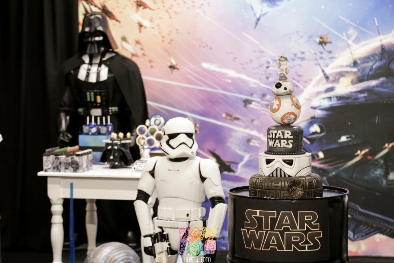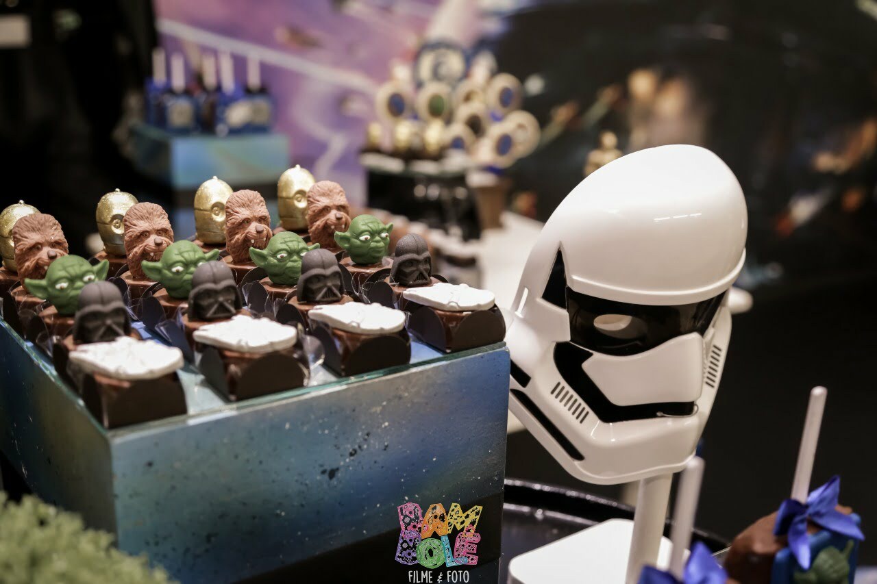 O tema Star Wars transforma a festa em uma verdadeira galáxia cheia de aventuras e efeitos impressionantes. Com cenário espacial, naves, planetas e os icônicos personagens da saga, cada detalhe convida os convidados a embarcar nessa jornada pelo universo.