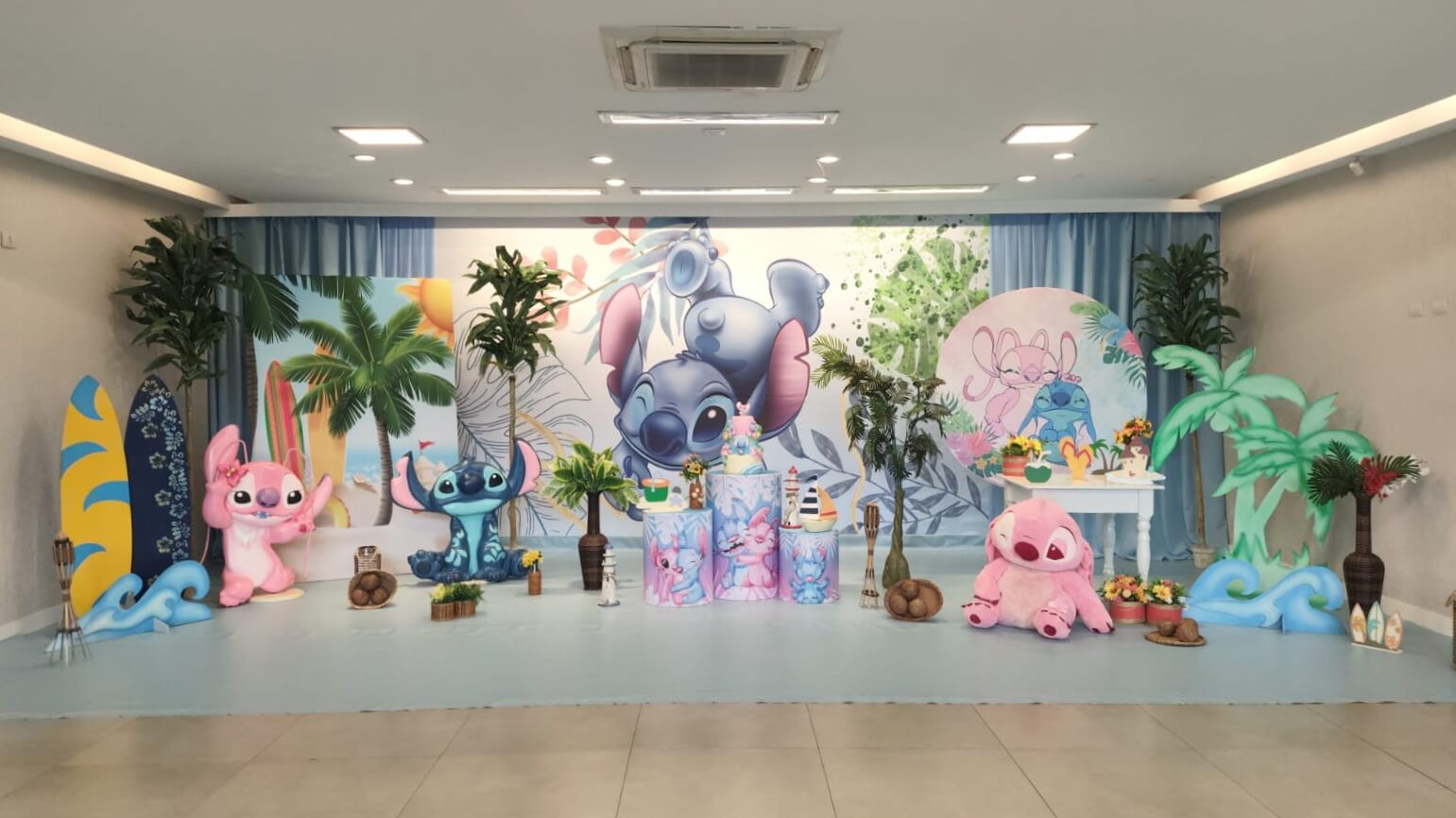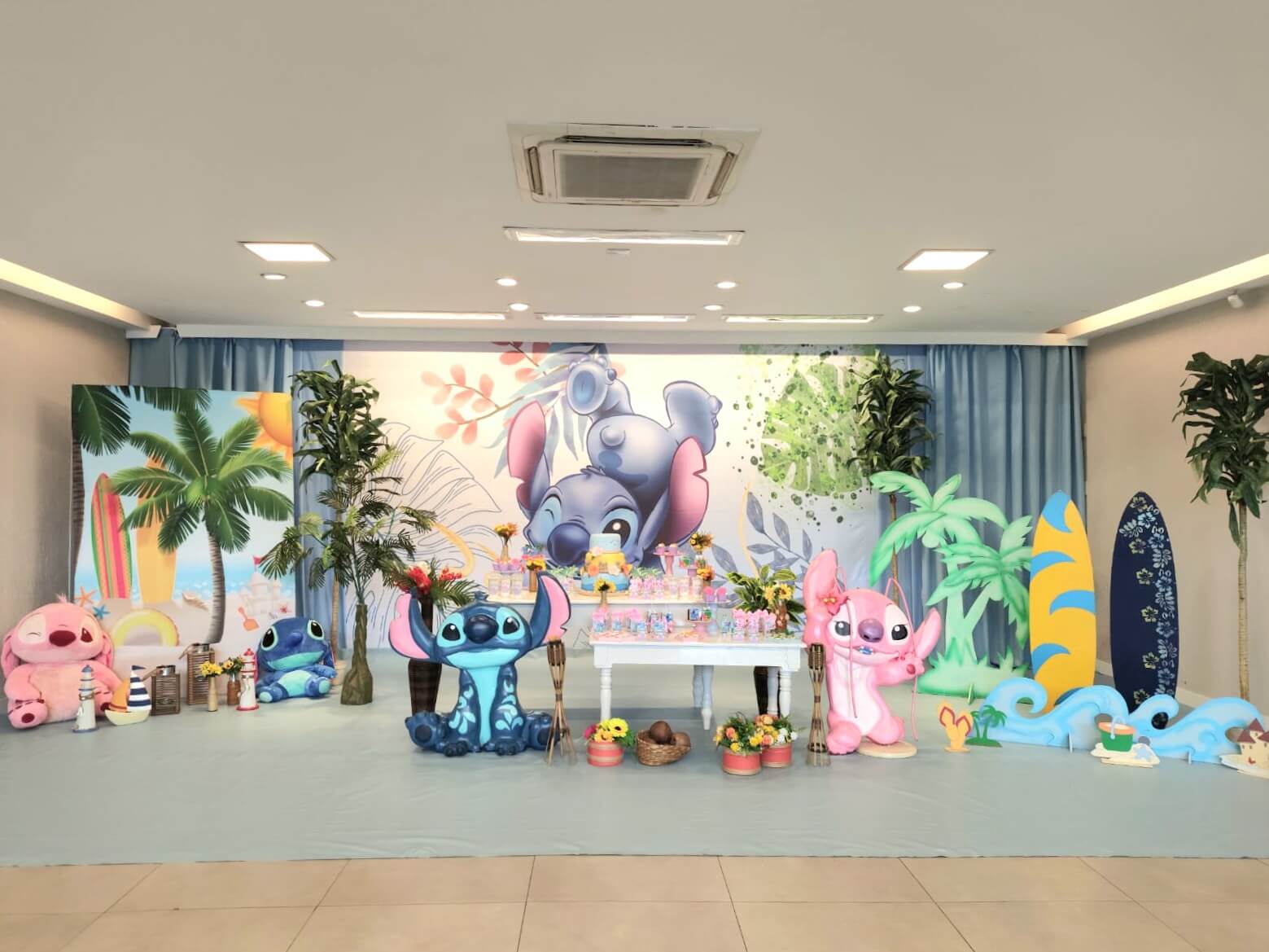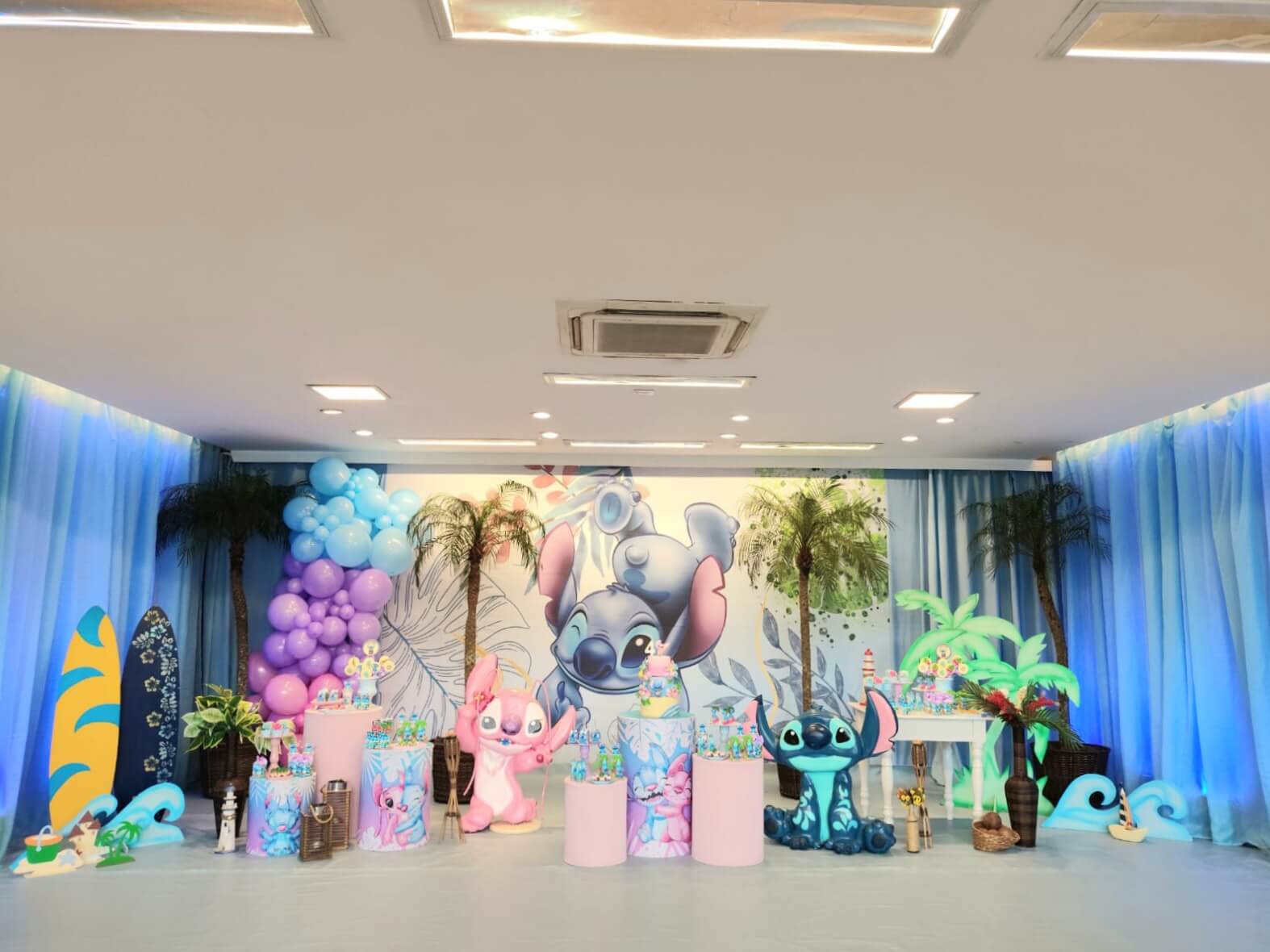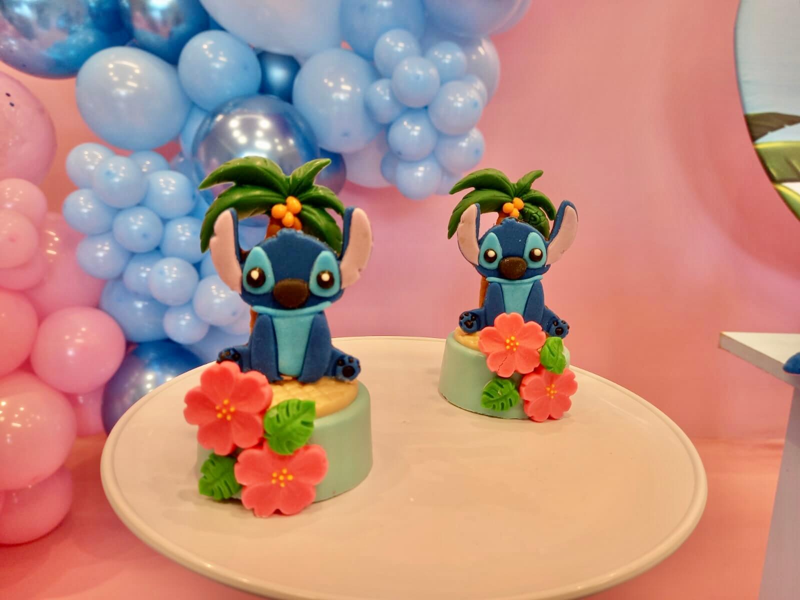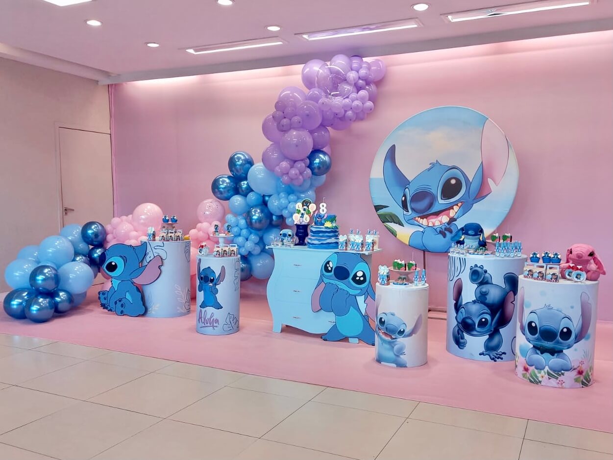 O tema Lilo e Stitch traz o clima tropical do Havaí para a festa, com uma paleta suave em tons de azul, lilás e rosa que encanta à primeira vista. O cenário mistura pranchas de surfe, palmeiras e muitos elementos do oceano, criando um ambiente divertido e acolhedor.