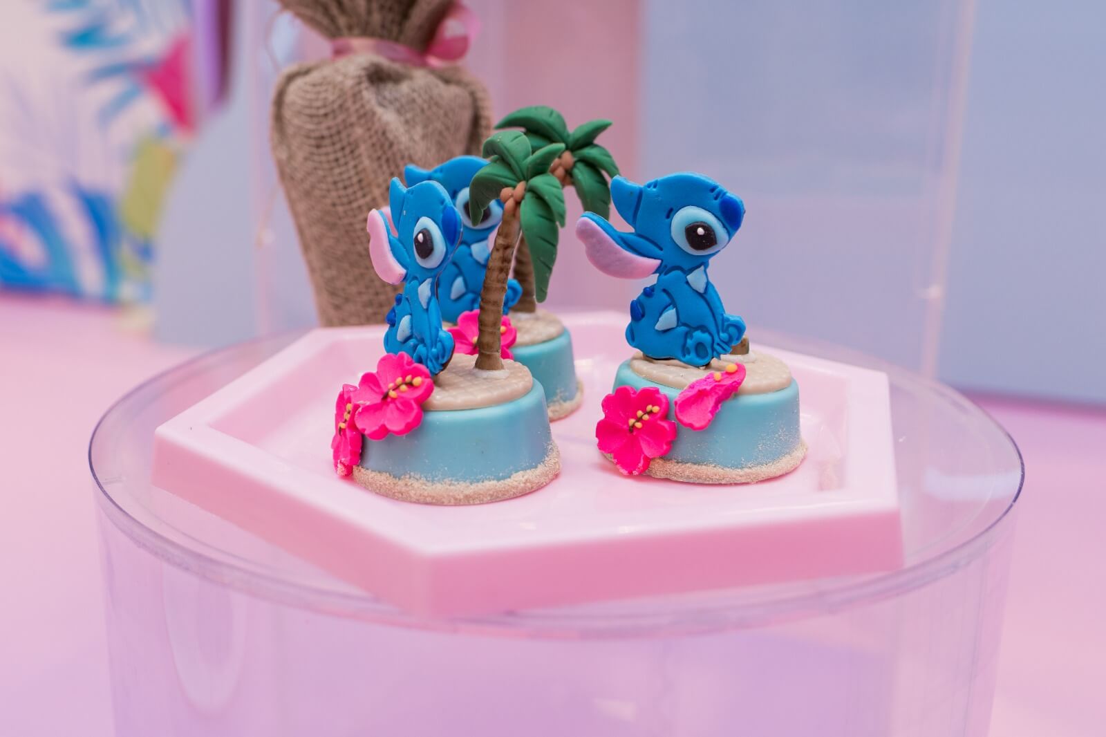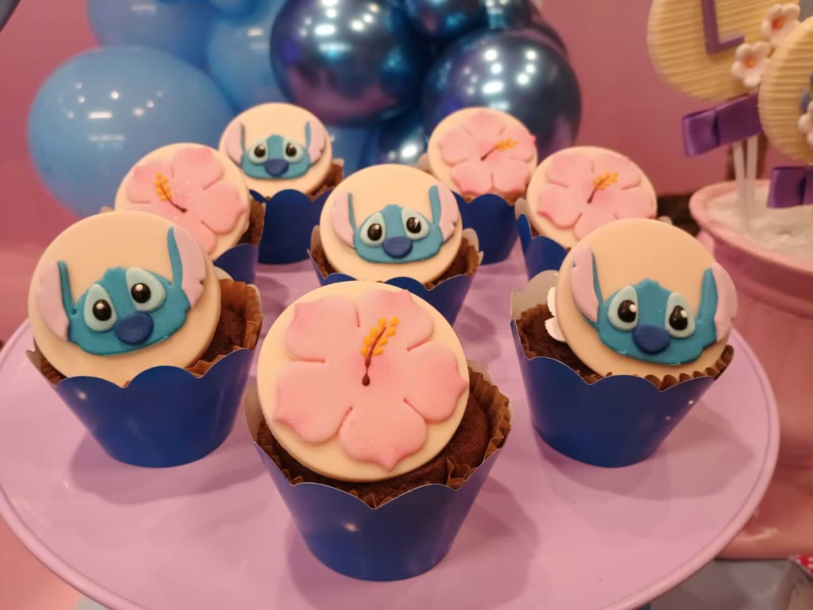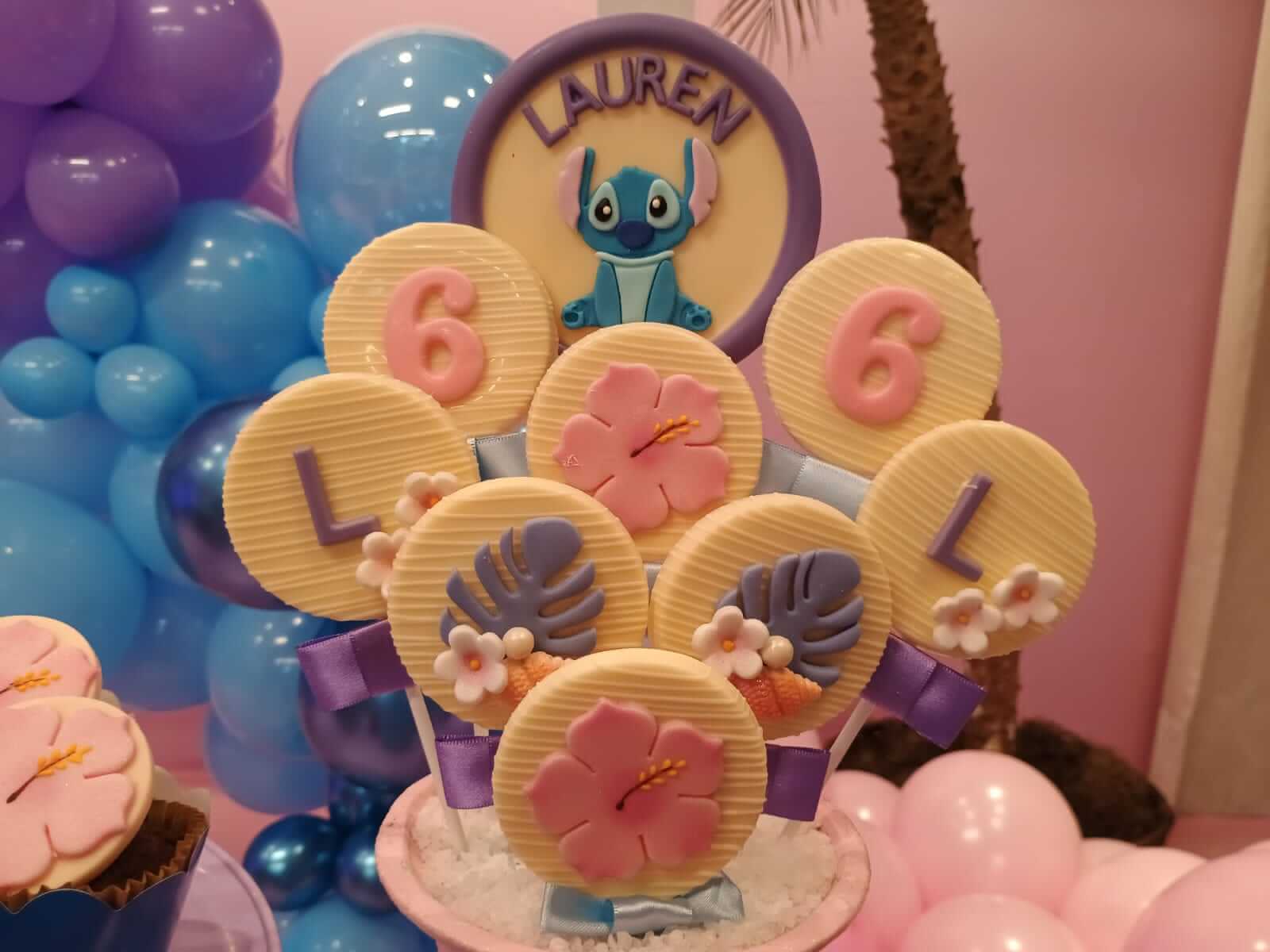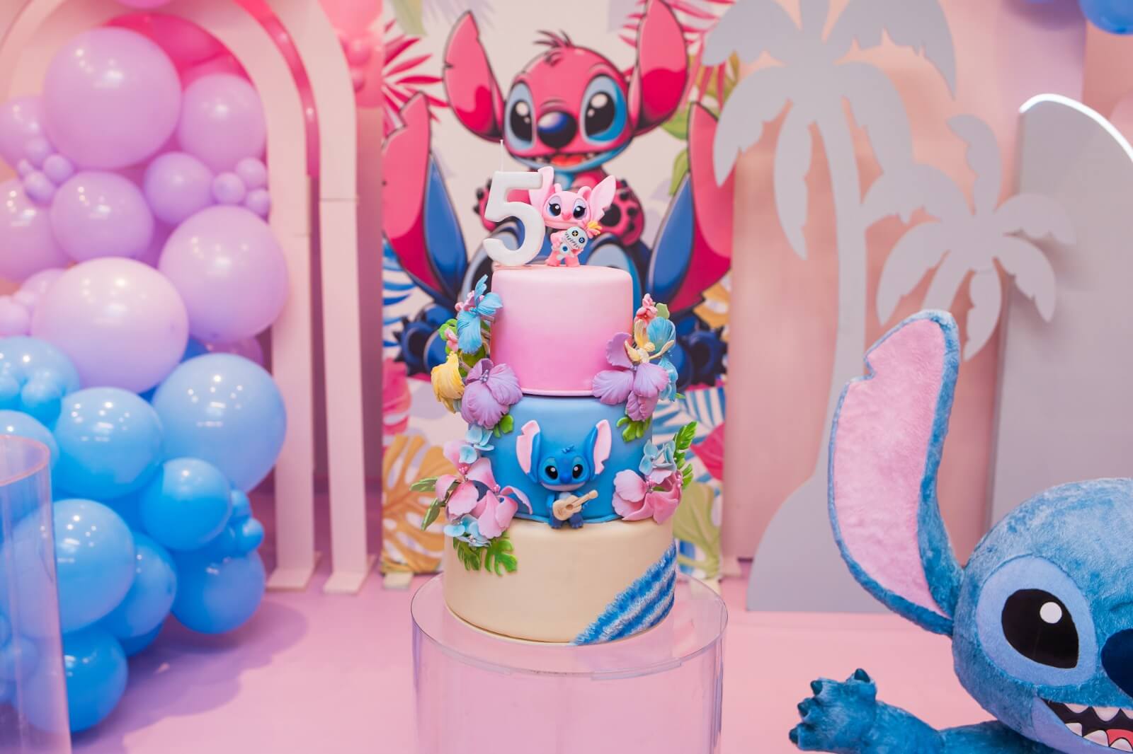 O tema Lilo e Stitch traz o clima tropical do Havaí para a festa, com uma paleta suave em tons de azul, lilás e rosa que encanta à primeira vista. O cenário mistura pranchas de surfe, palmeiras e muitos elementos do oceano, criando um ambiente divertido e acolhedor.