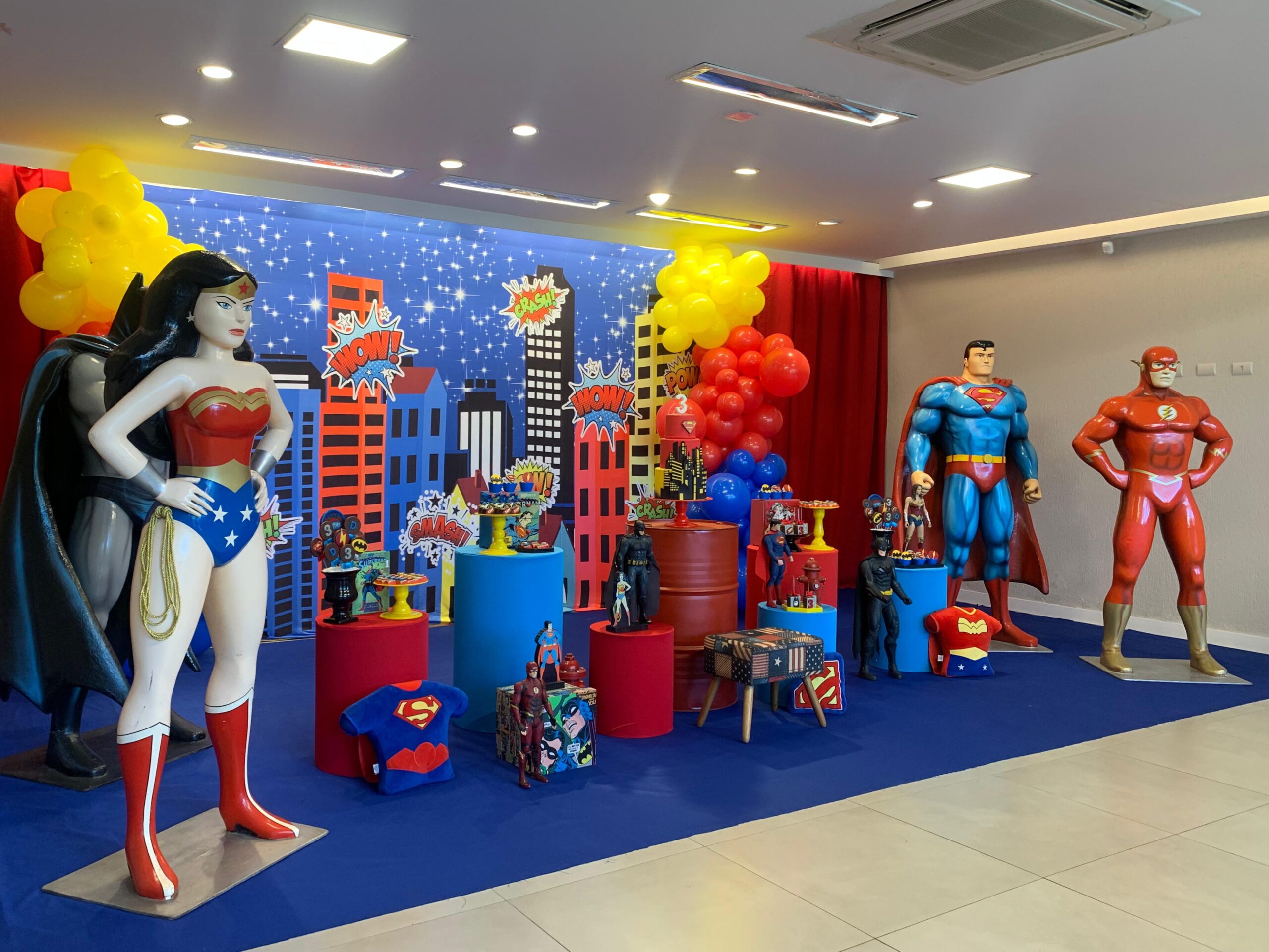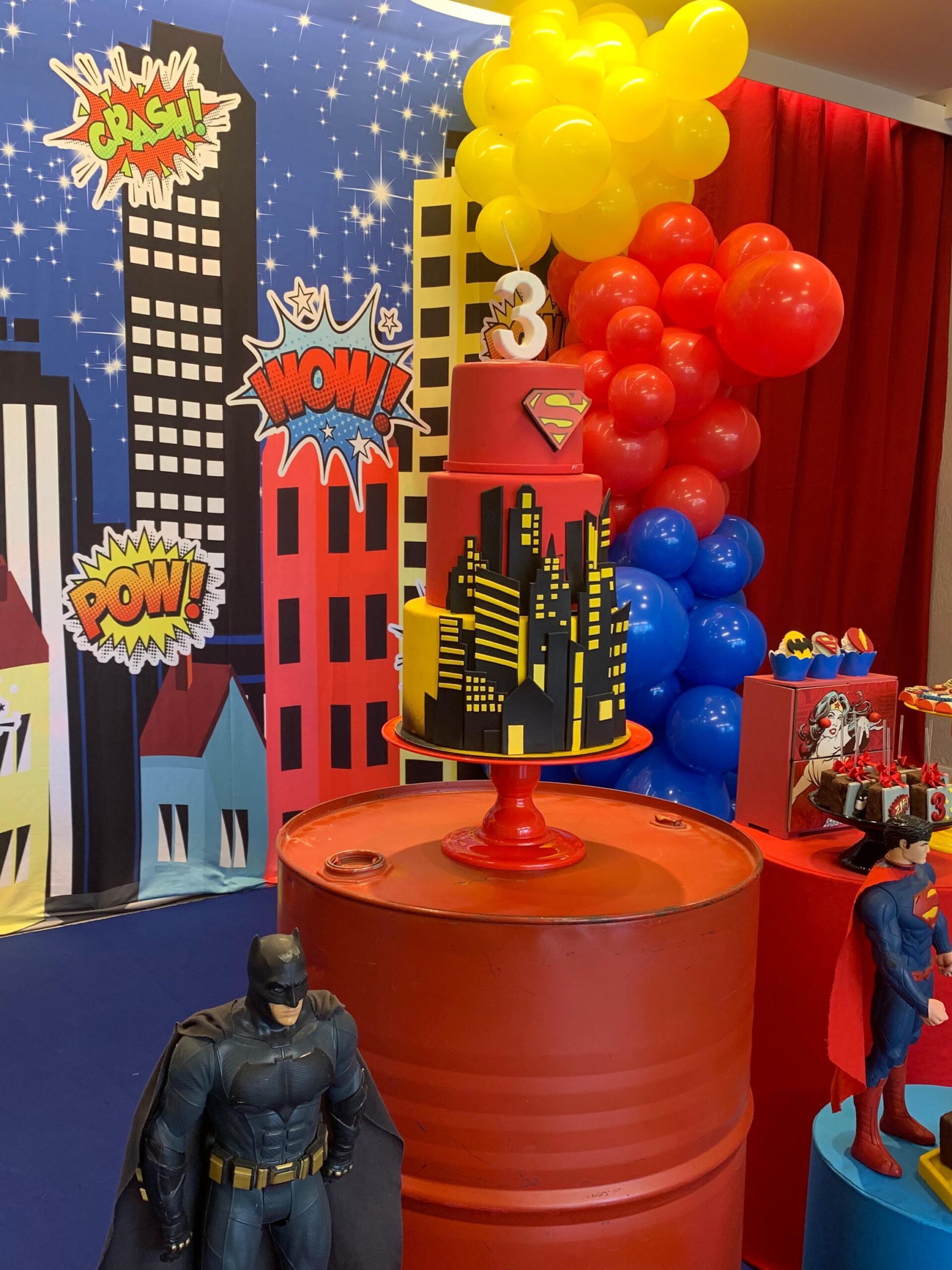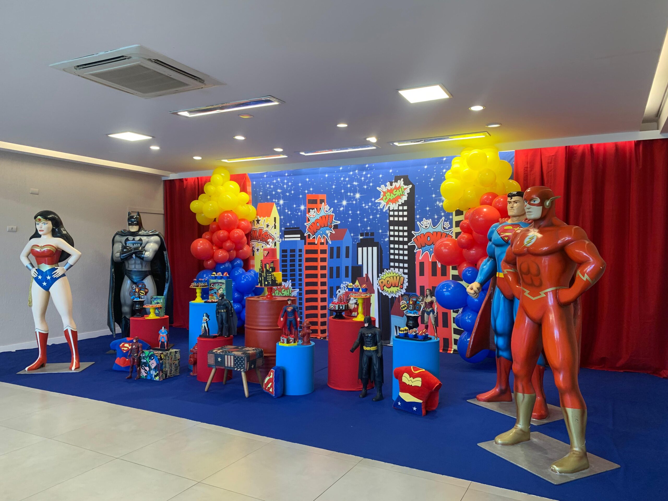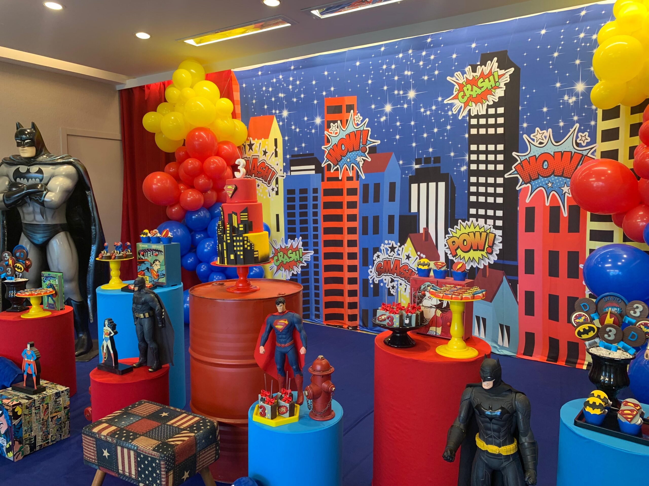 O tema Super Heróis transforma a festa em um cenário cheio de aventura e imaginação, onde cores vibrantes, elementos urbanos e personagens icônicos criam uma atmosfera de coragem, diversão e fantasia. Cada detalhe remete ao universo dos heróis, despertando nas crianças o sentimento de que podem viver grandes aventuras e salvar o dia.
