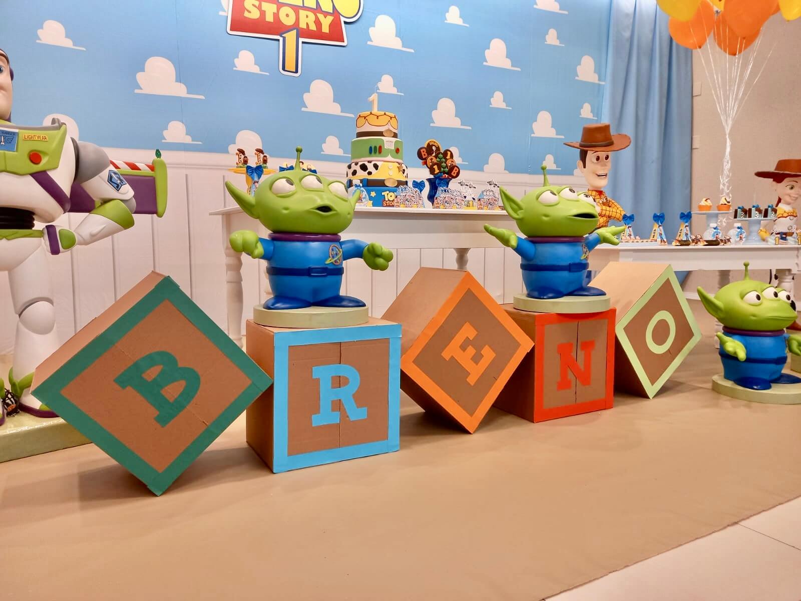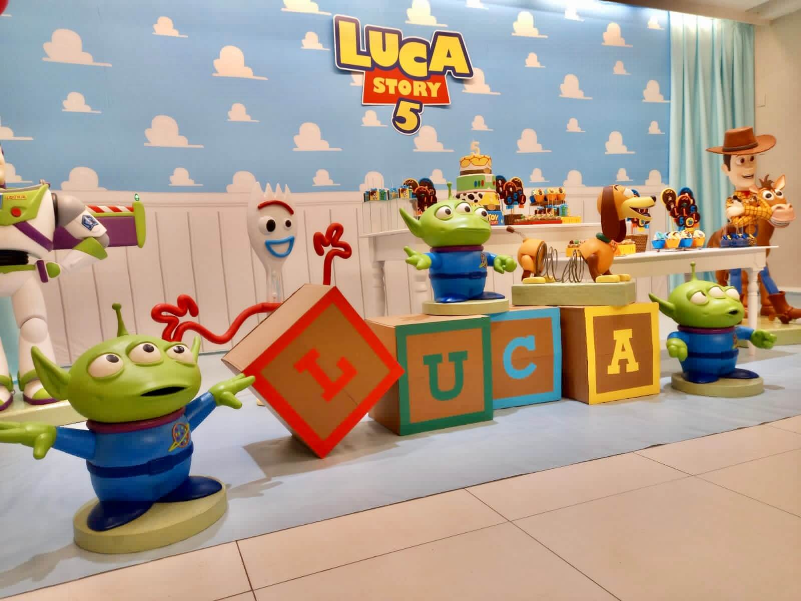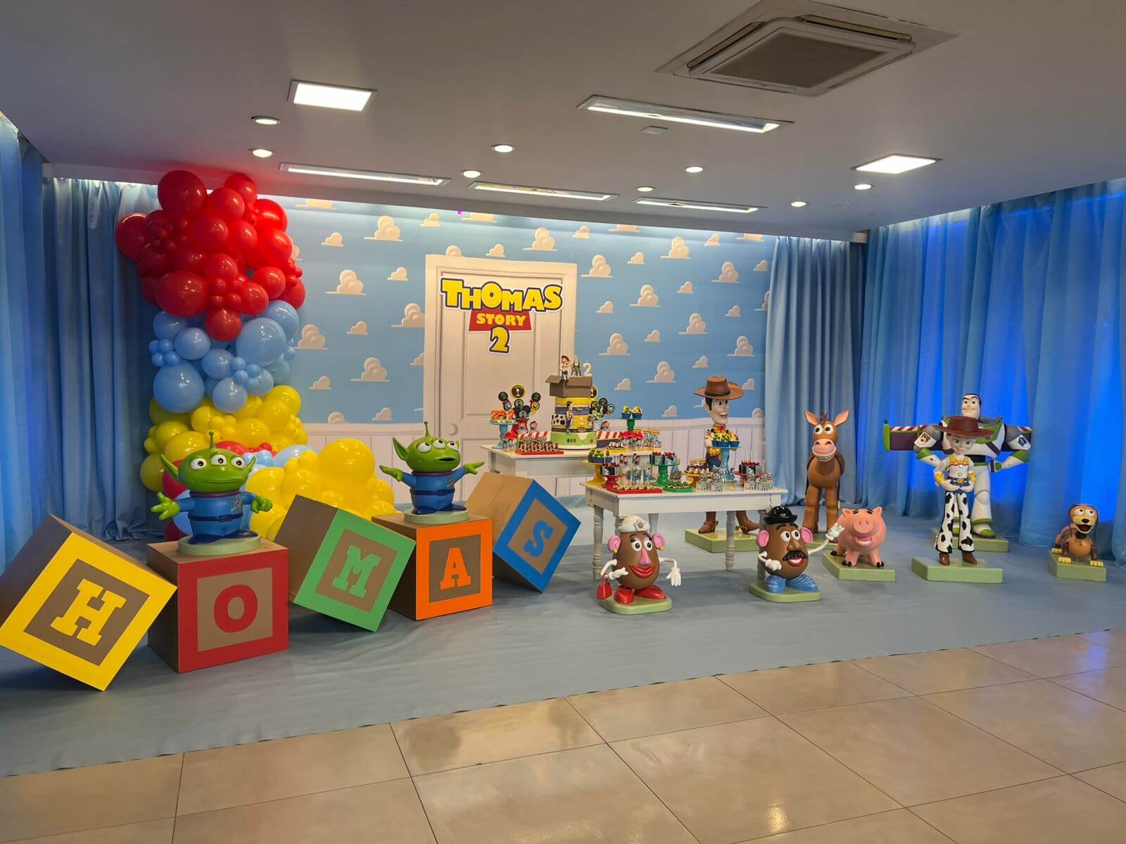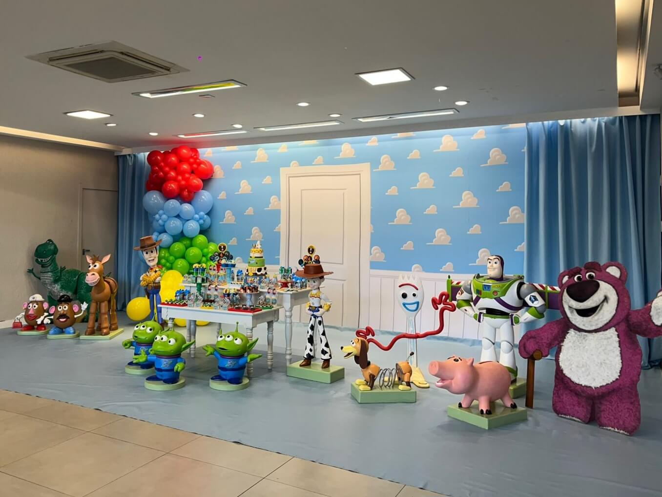 A magia dos brinquedos ganha vida em um cenário cheio de cores, alegria e personagens icônicos. Com o fundo clássico de céu azul e nuvens, blocos de montar gigantes e elementos que remetem ao quarto do Andy, a decoração traz todo o encanto do universo Toy Story em uma composição vibrante e divertida. Woody, Buzz, Jessie, Sr. e Sra. Cabeça de Batata, Porquinho e os adoráveis Aliens compõem um ambiente perfeito para encantar crianças e adultos.