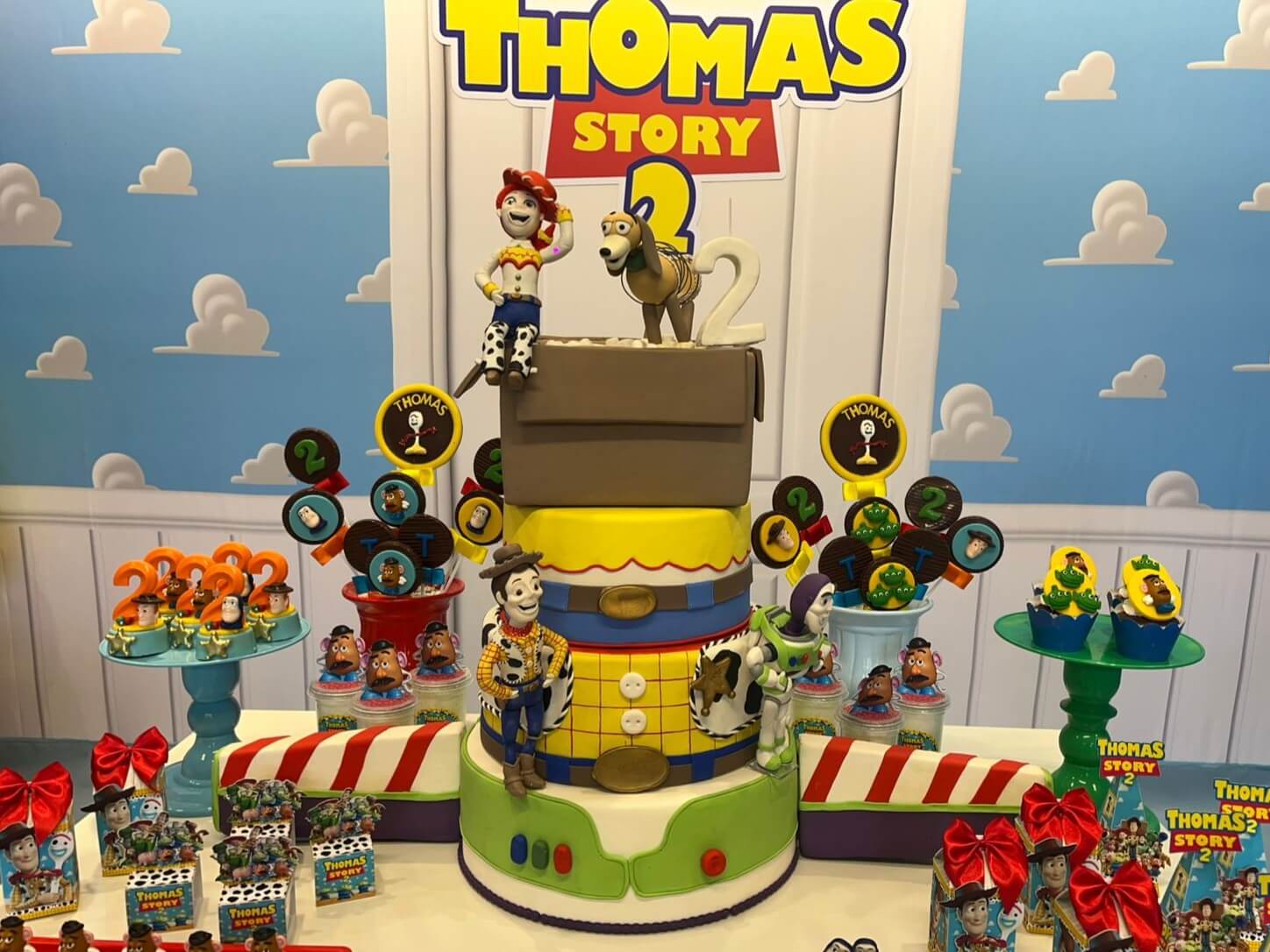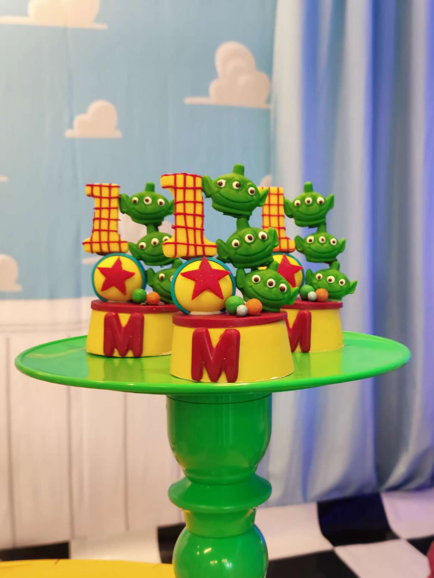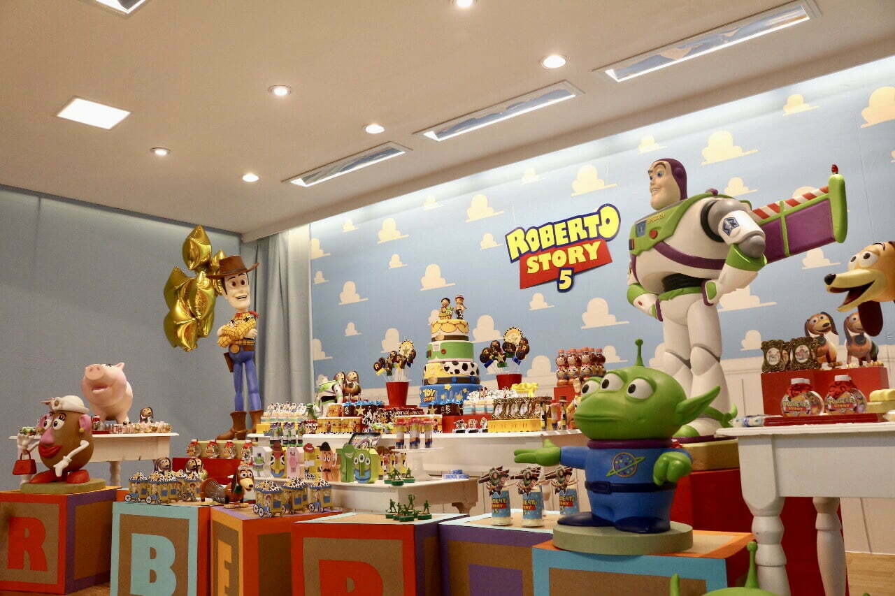 A magia dos brinquedos ganha vida em um cenário cheio de cores, alegria e personagens icônicos. Com o fundo clássico de céu azul e nuvens, blocos de montar gigantes e elementos que remetem ao quarto do Andy, a decoração traz todo o encanto do universo Toy Story em uma composição vibrante e divertida. Woody, Buzz, Jessie, Sr. e Sra. Cabeça de Batata, Porquinho e os adoráveis Aliens compõem um ambiente perfeito para encantar crianças e adultos.