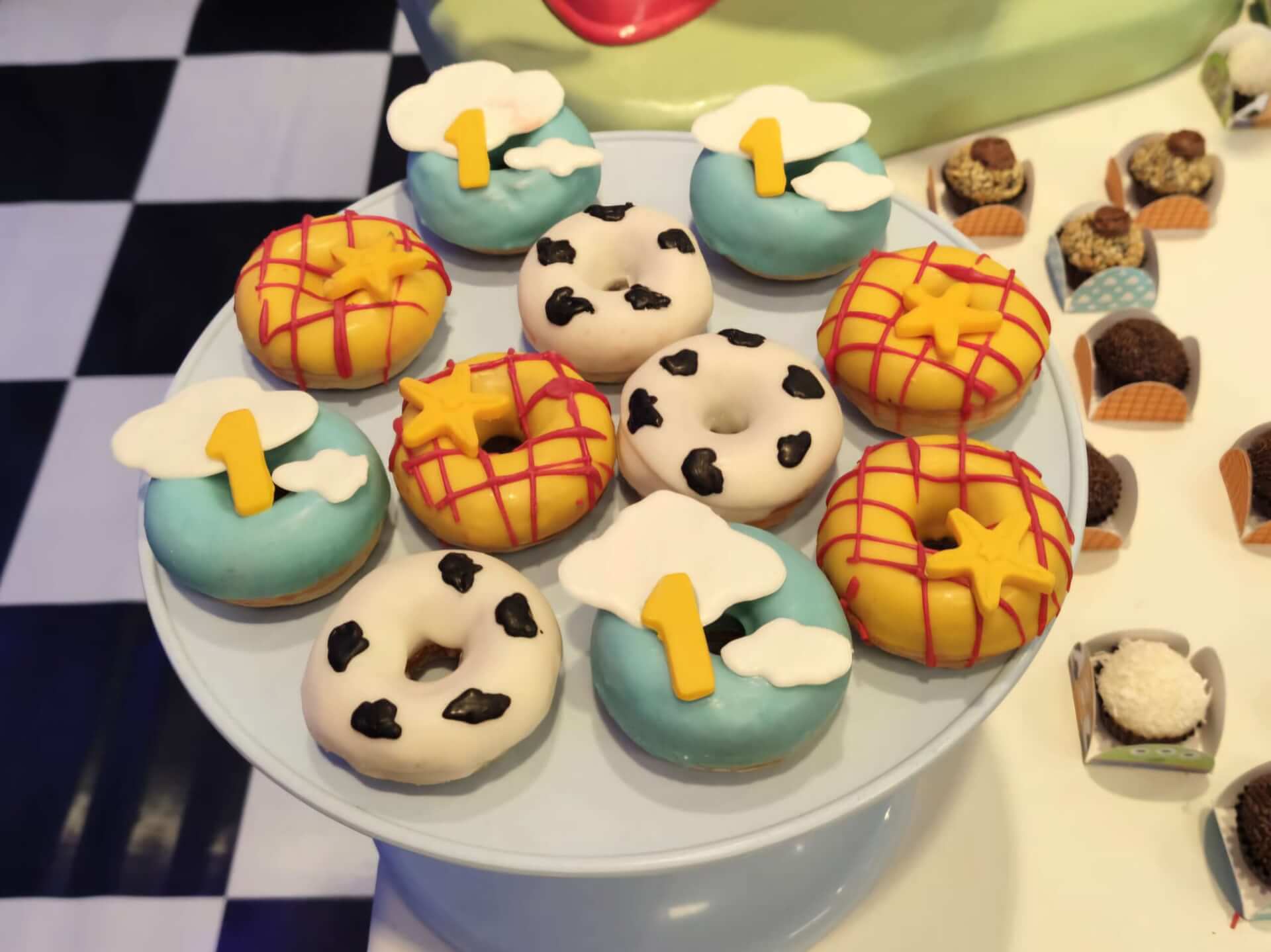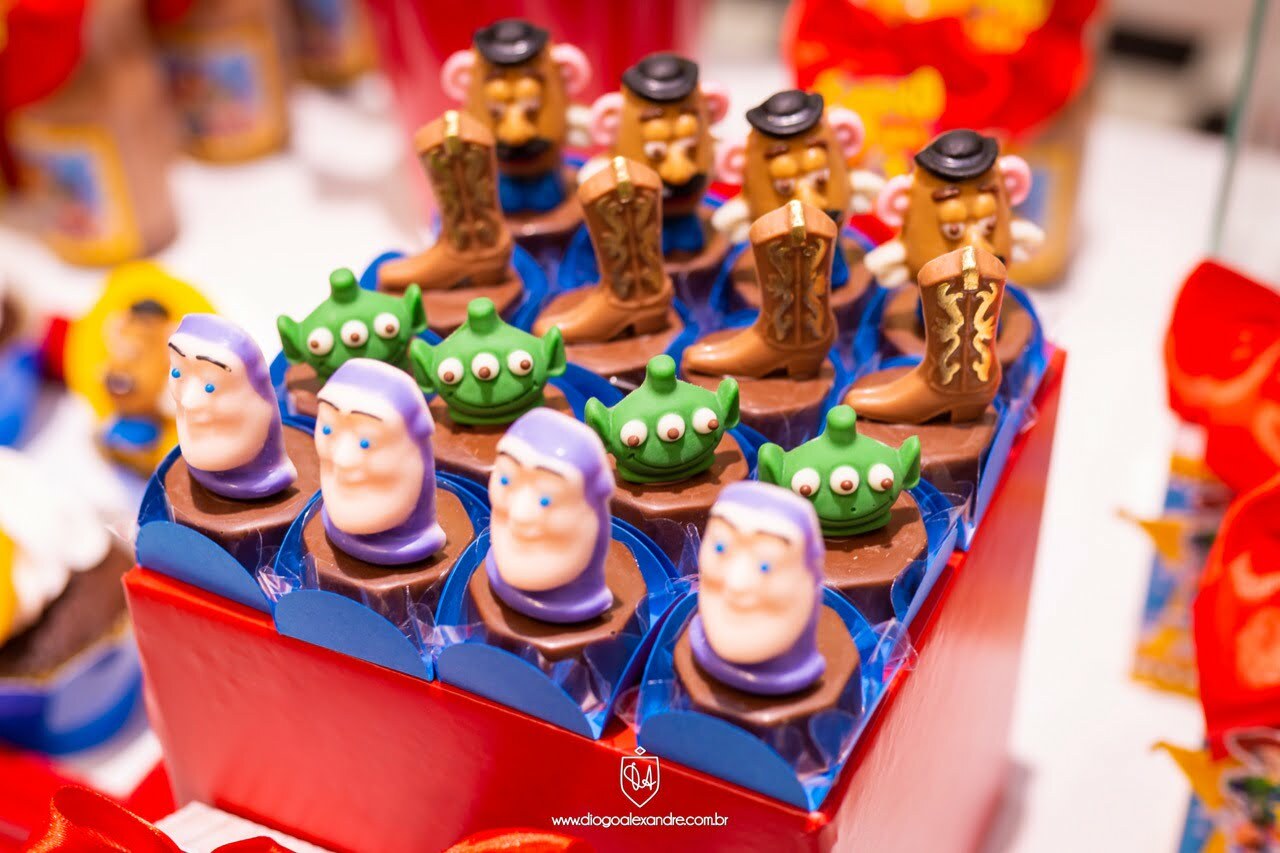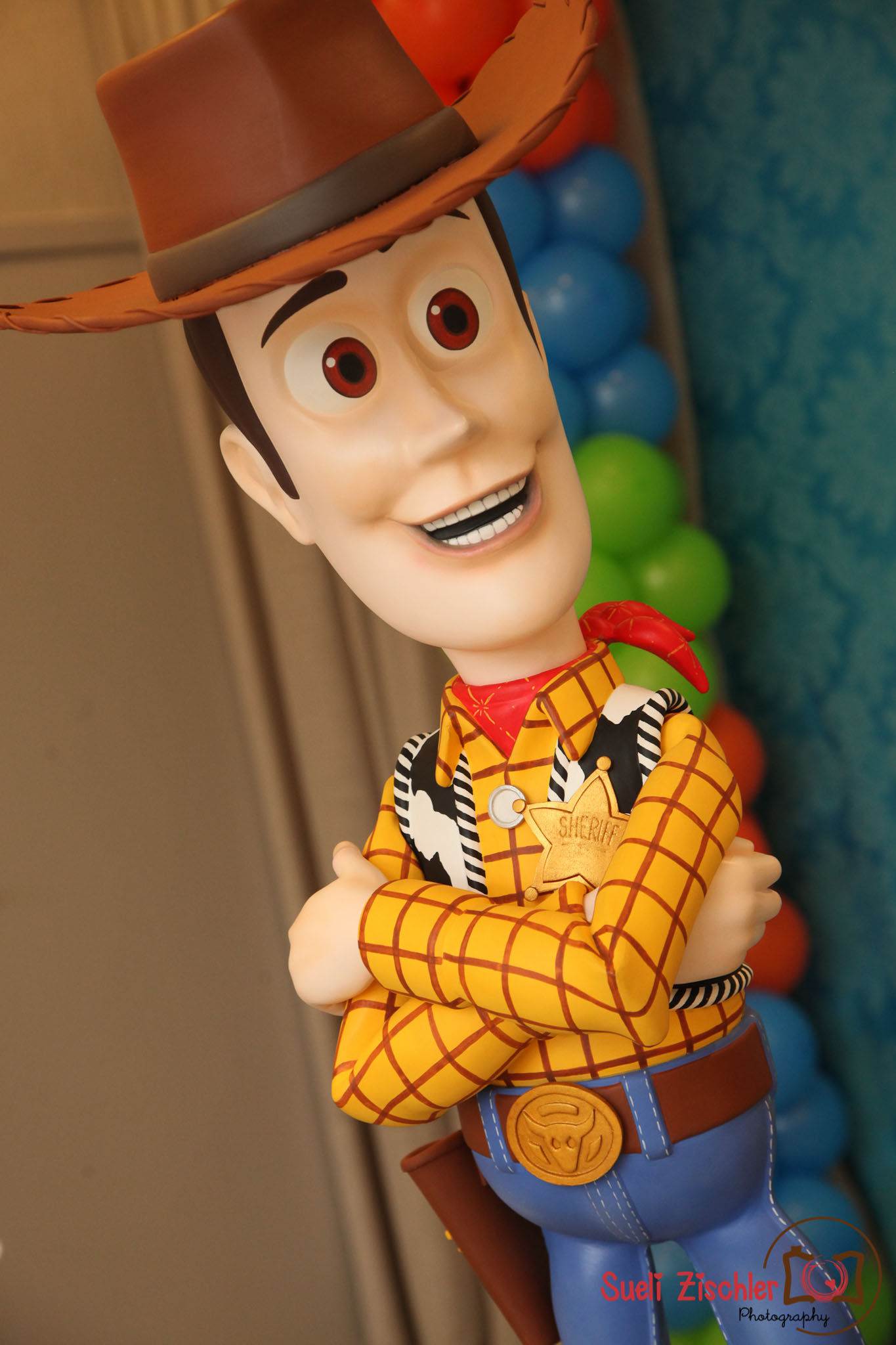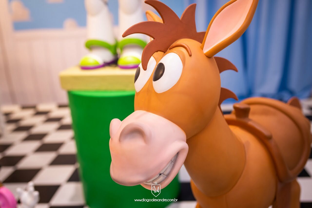A magia dos brinquedos ganha vida em um cenário cheio de cores, alegria e personagens icônicos. Com o fundo clássico de céu azul e nuvens, blocos de montar gigantes e elementos que remetem ao quarto do Andy, a decoração traz todo o encanto do universo Toy Story em uma composição vibrante e divertida. Woody, Buzz, Jessie, Sr. e Sra. Cabeça de Batata, Porquinho e os adoráveis Aliens compõem um ambiente perfeito para encantar crianças e adultos.