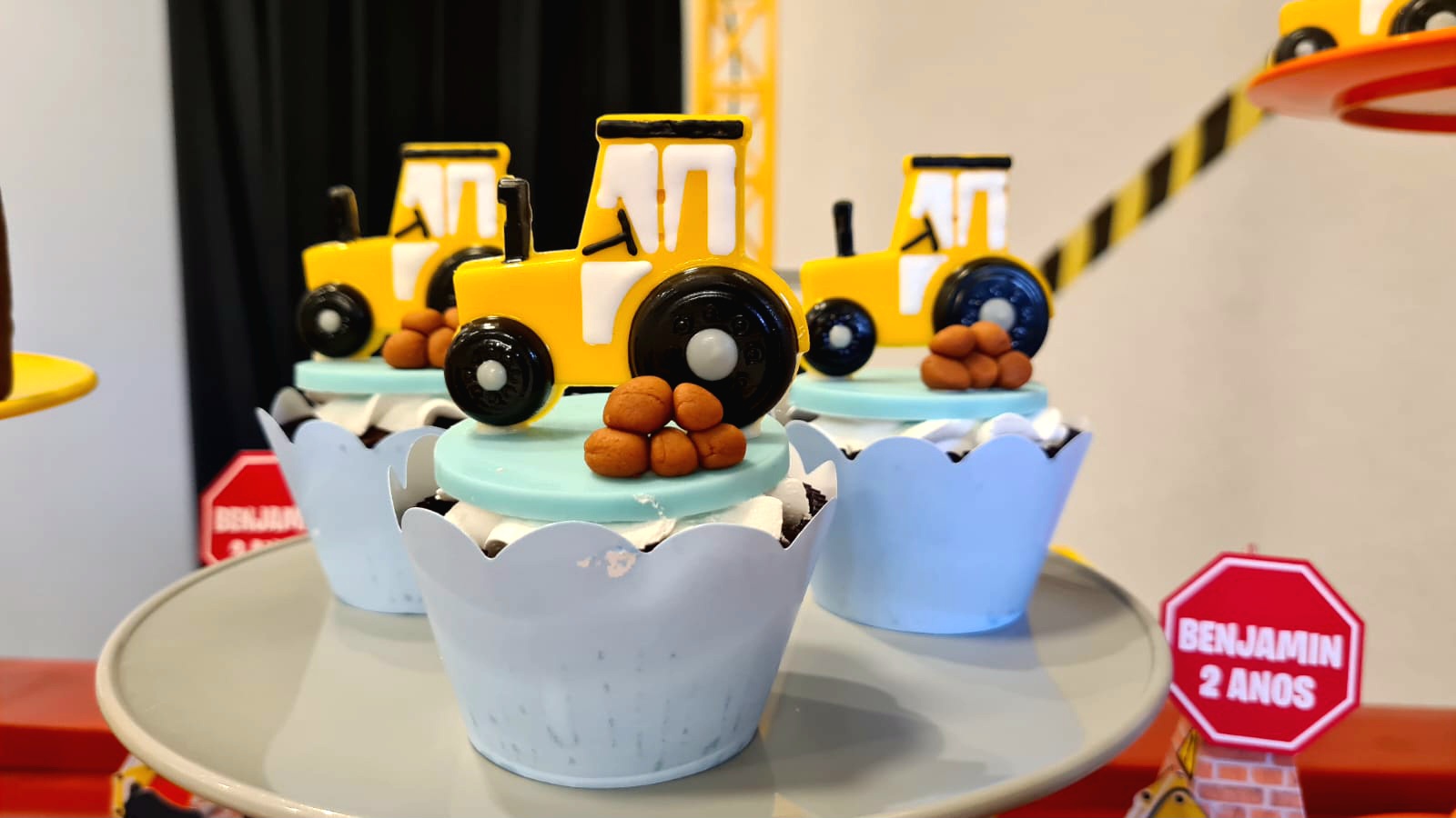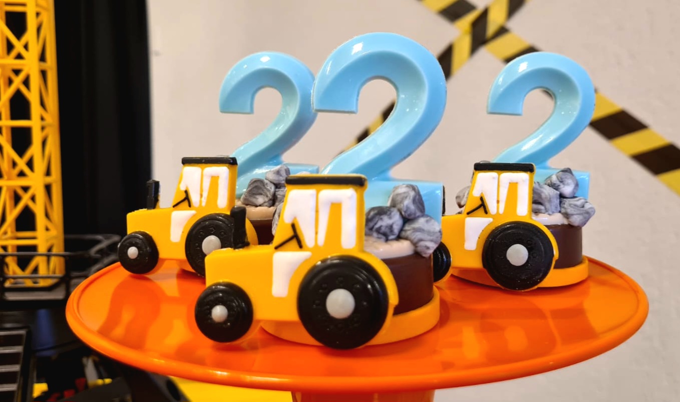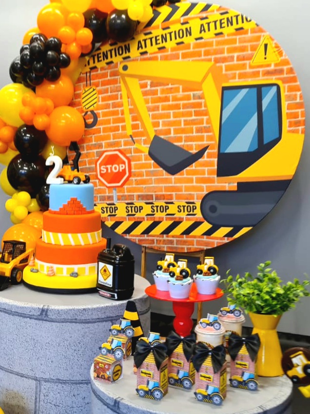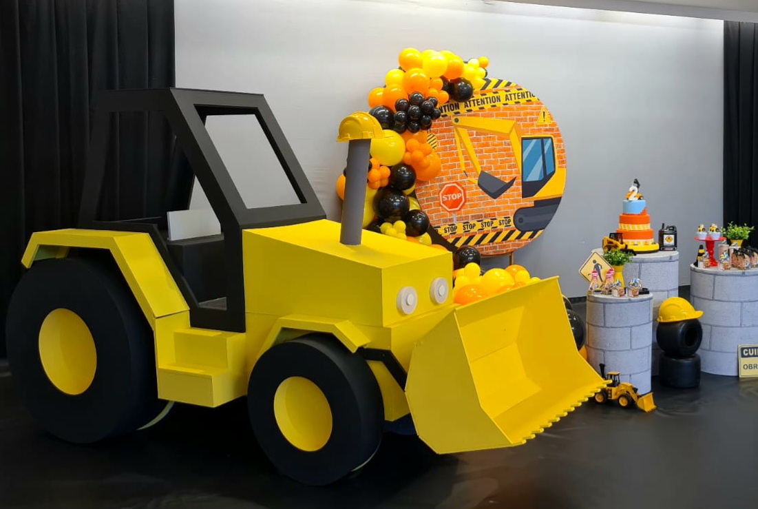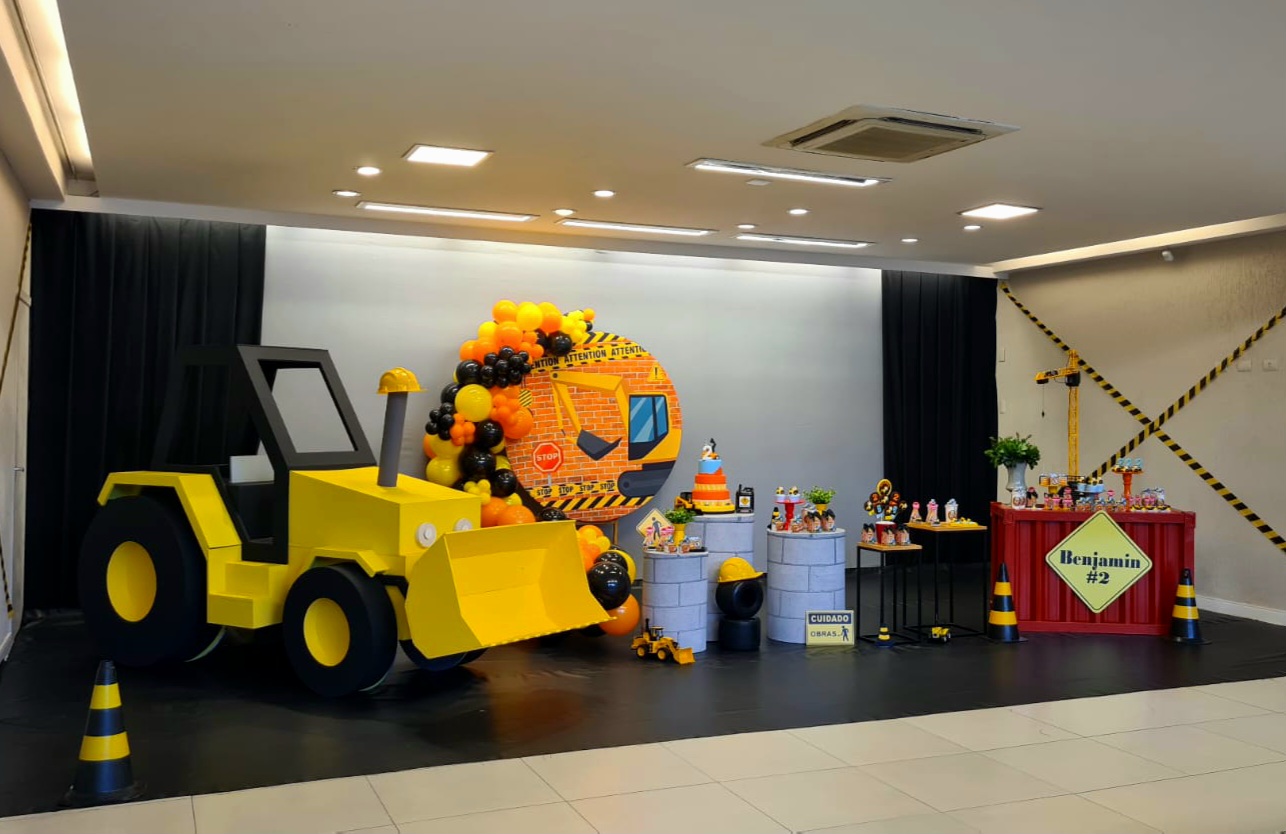 O tema Trator é uma verdadeira festa em meio à construção, perfeita para pequenos que adoram máquinas e aventuras! A decoração destaca tons de amarelo, preto e laranja, com cones, capacetes e faixas de segurança que transformam o ambiente em um divertido canteiro de obras. O grande trator em tamanho real rouba a cena, trazendo realismo e encanto à composição.