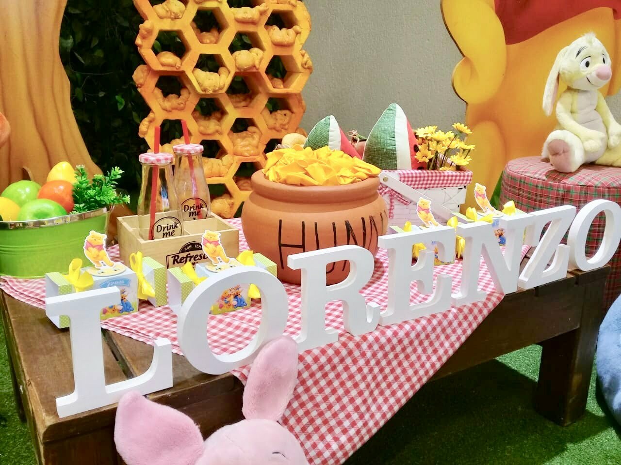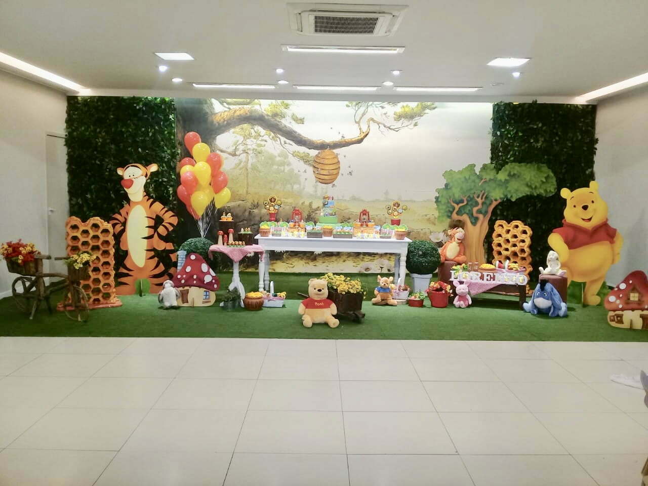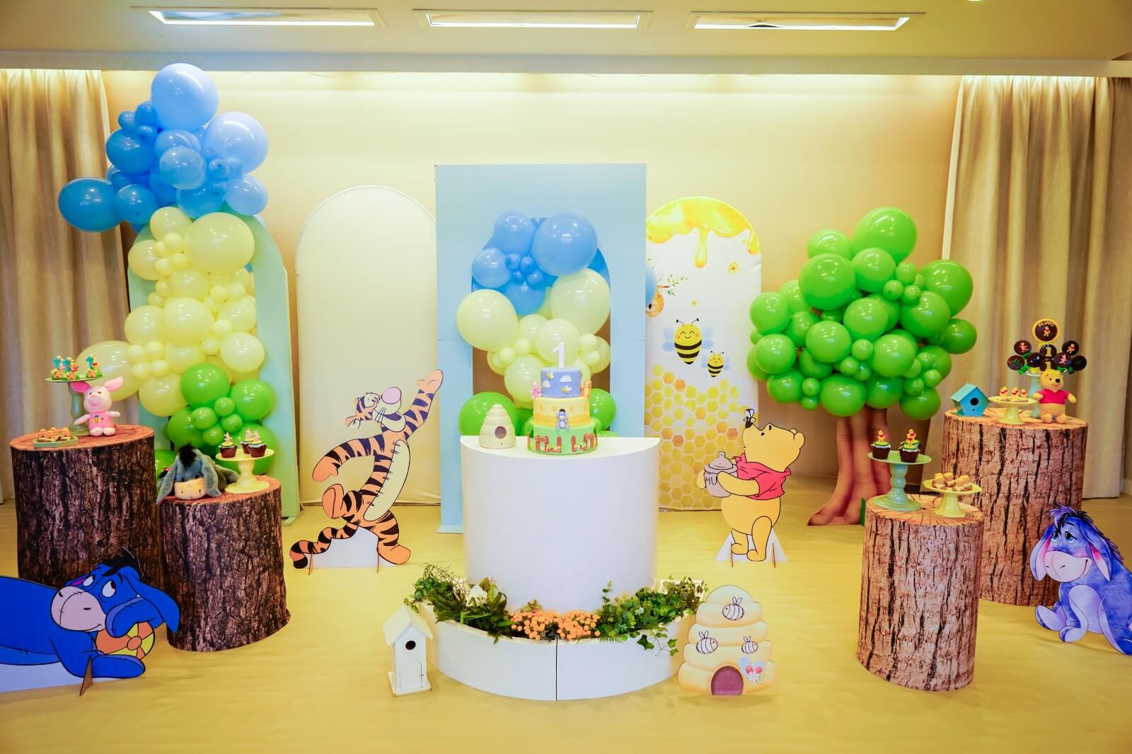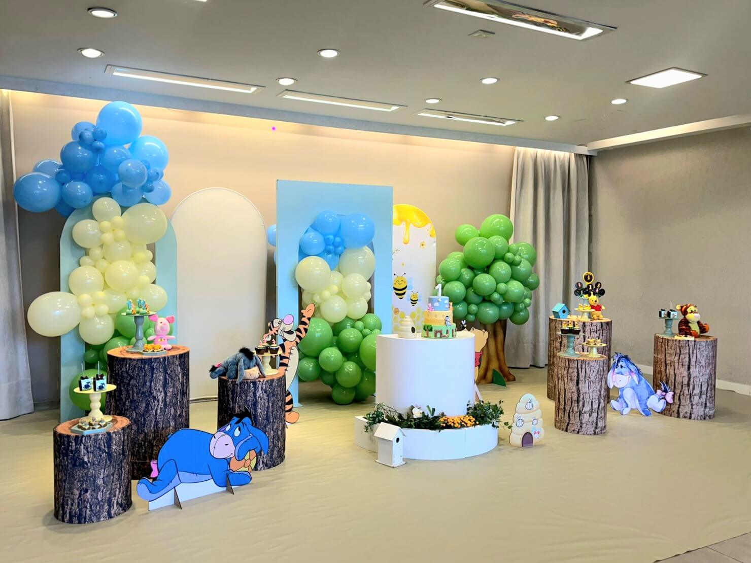 O tema Ursinho Pooh traz toda a doçura do Bosque dos Cem Acres para a festa, criando um cenário leve, acolhedor e cheio de encantamento. A decoração combina elementos como colmeias, árvores, cogumelos, flores e os personagens mais queridos — Pooh, Tigrão, Leitão e Ió — em uma composição que transmite a magia das histórias clássicas.