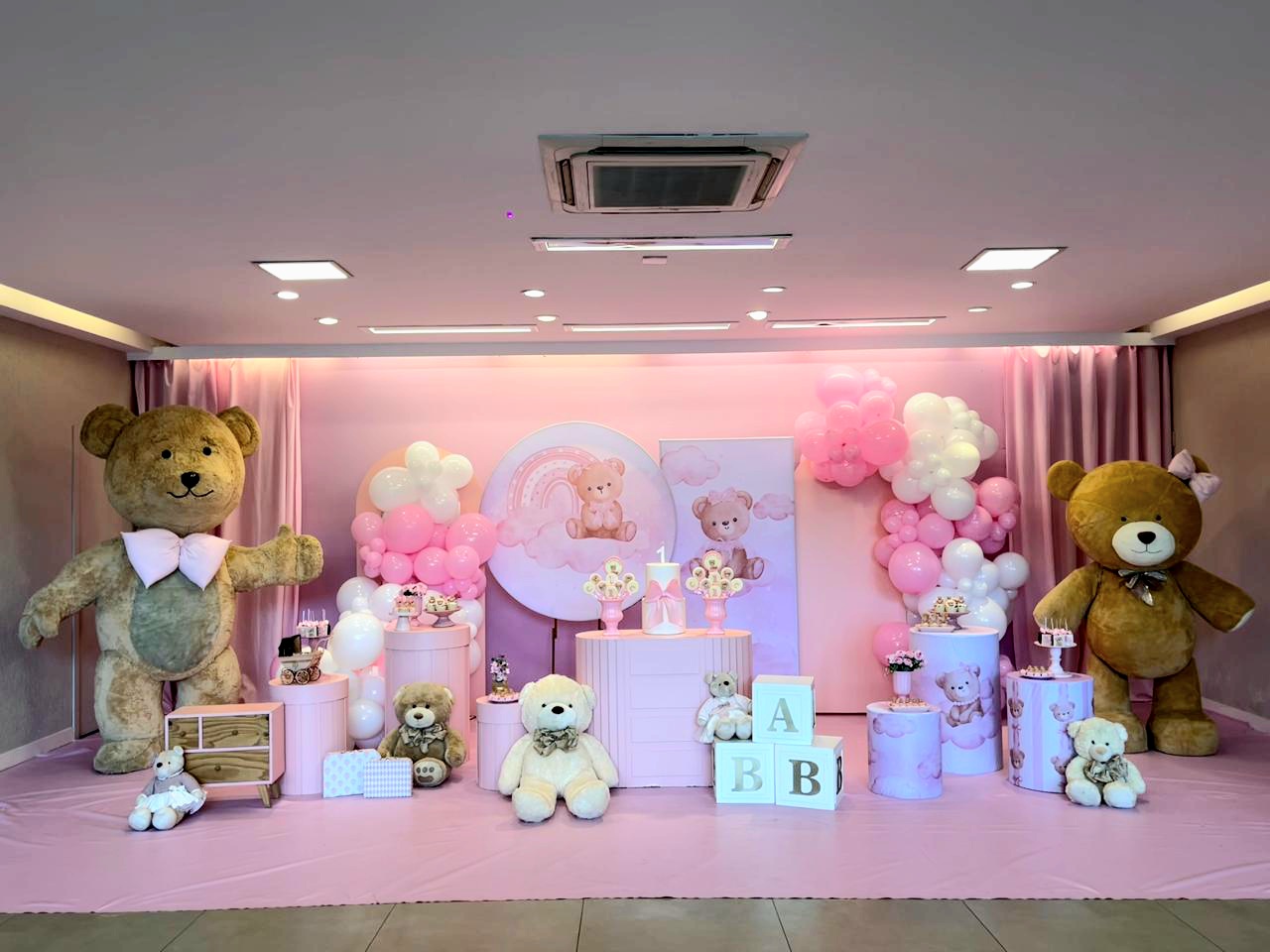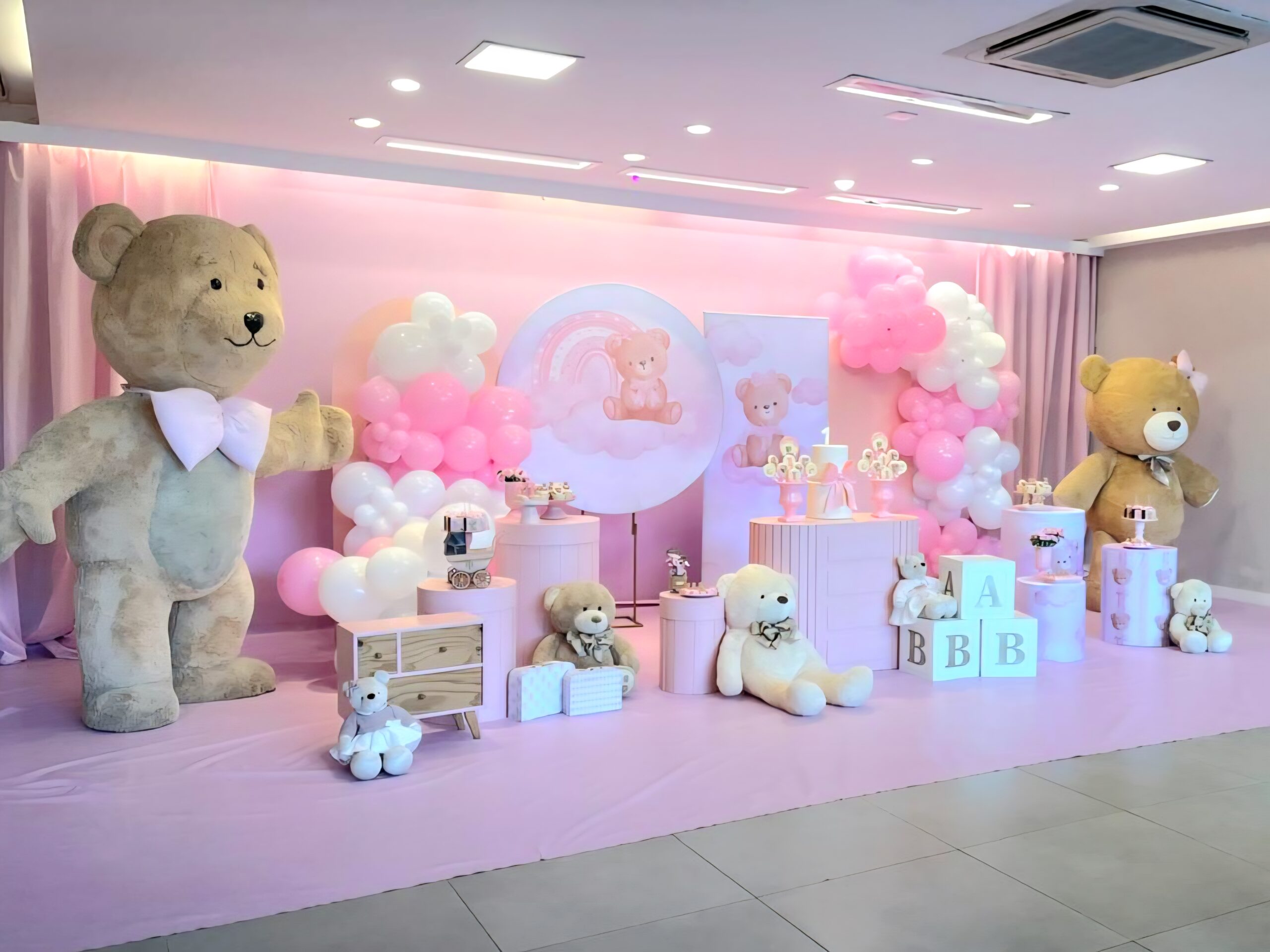 O tema Ursinhos em Tons de Rosa envolve a festa em um clima de carinho, delicadeza e puro aconchego, criando um cenário encantador e cheio de ternura. A decoração aposta em ursinhos fofinhos, laços, corações, flores e elementos suaves, compondo um ambiente acolhedor e encantador do início ao fim.