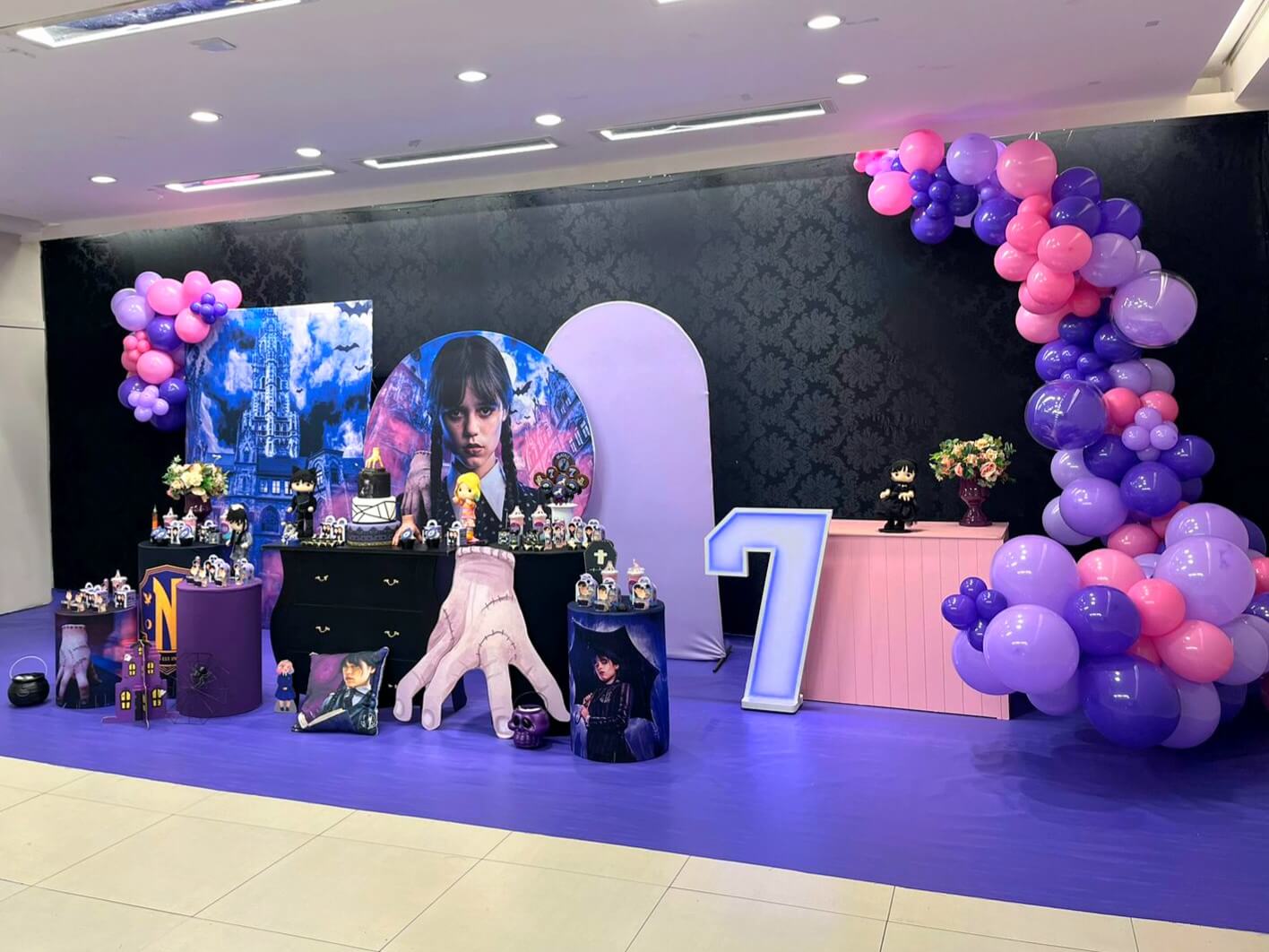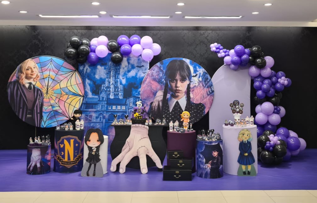 O tema Wandinha traz todo o mistério, o charme sombrio e a estética única da Nevermore Academy para a festa. Com tons de roxo, lilás e preto, o cenário ganha vida com balões, textos e elementos inspirados na série, além de painéis que destacam os personagens principais e a atmosfera gótica moderna.