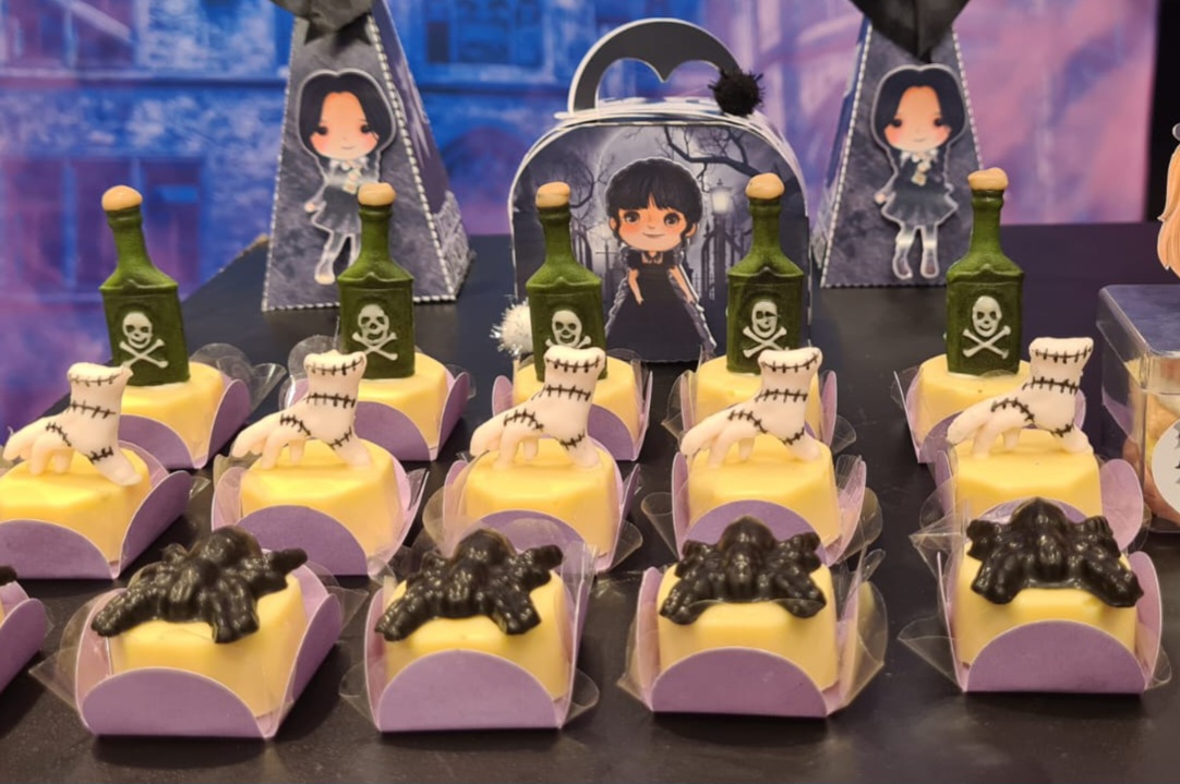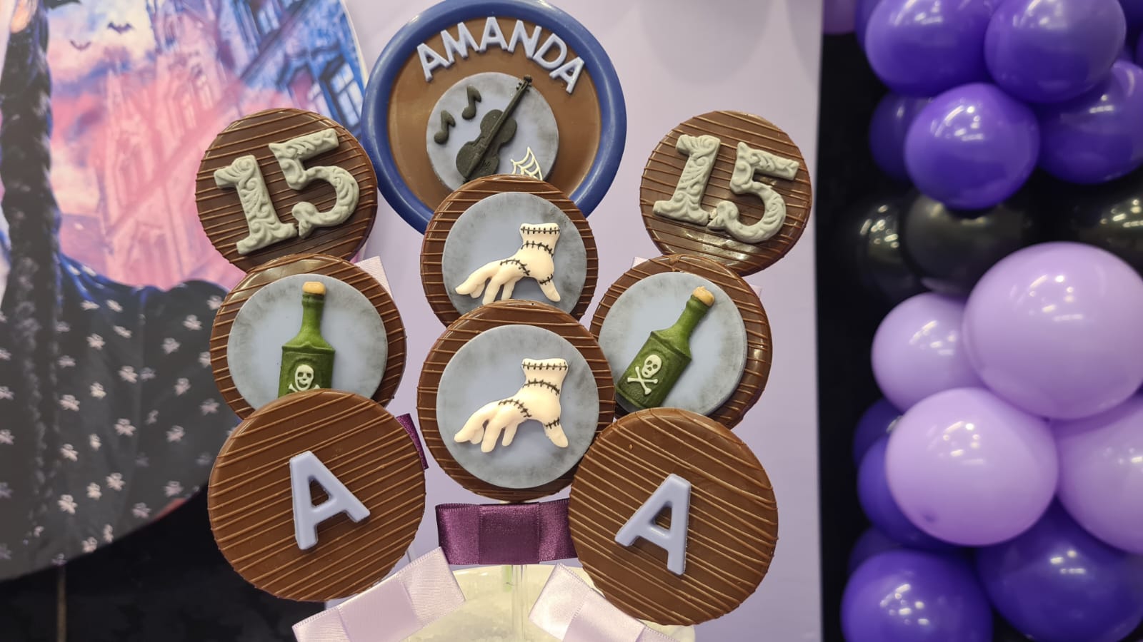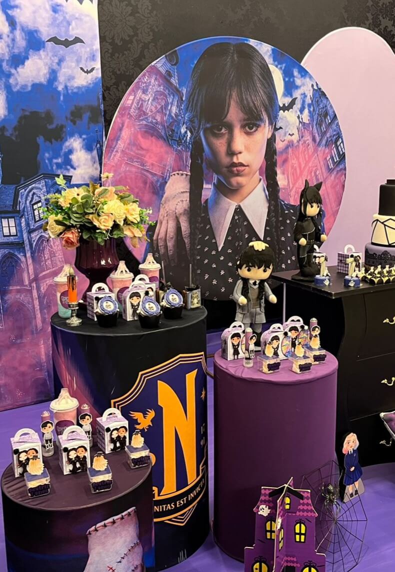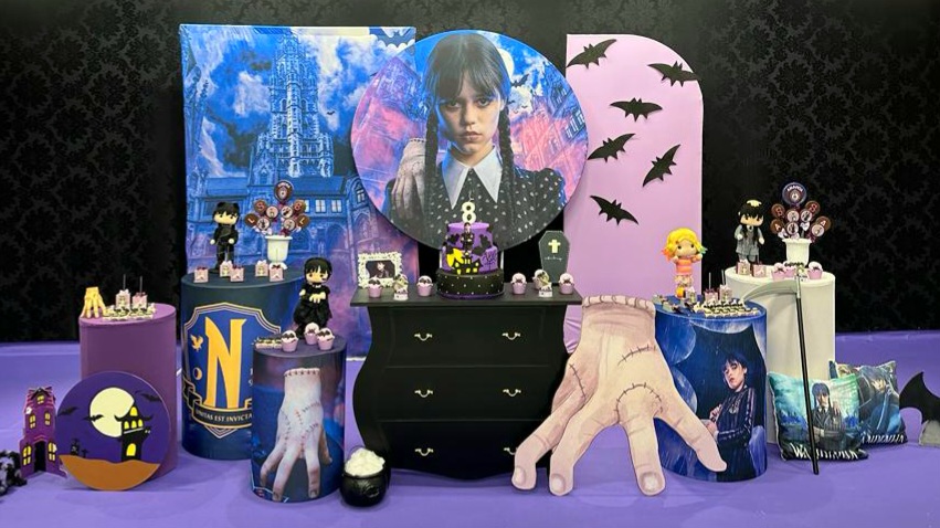 A decoração inclui figuras estilizadas, a icônica Mãozinha e detalhes que remetem ao universo da personagem, criando um ambiente divertido e levemente enigmático. Uma escolha perfeita para quem ama esse estilo misterioso e quer uma festa cheia de personalidade.